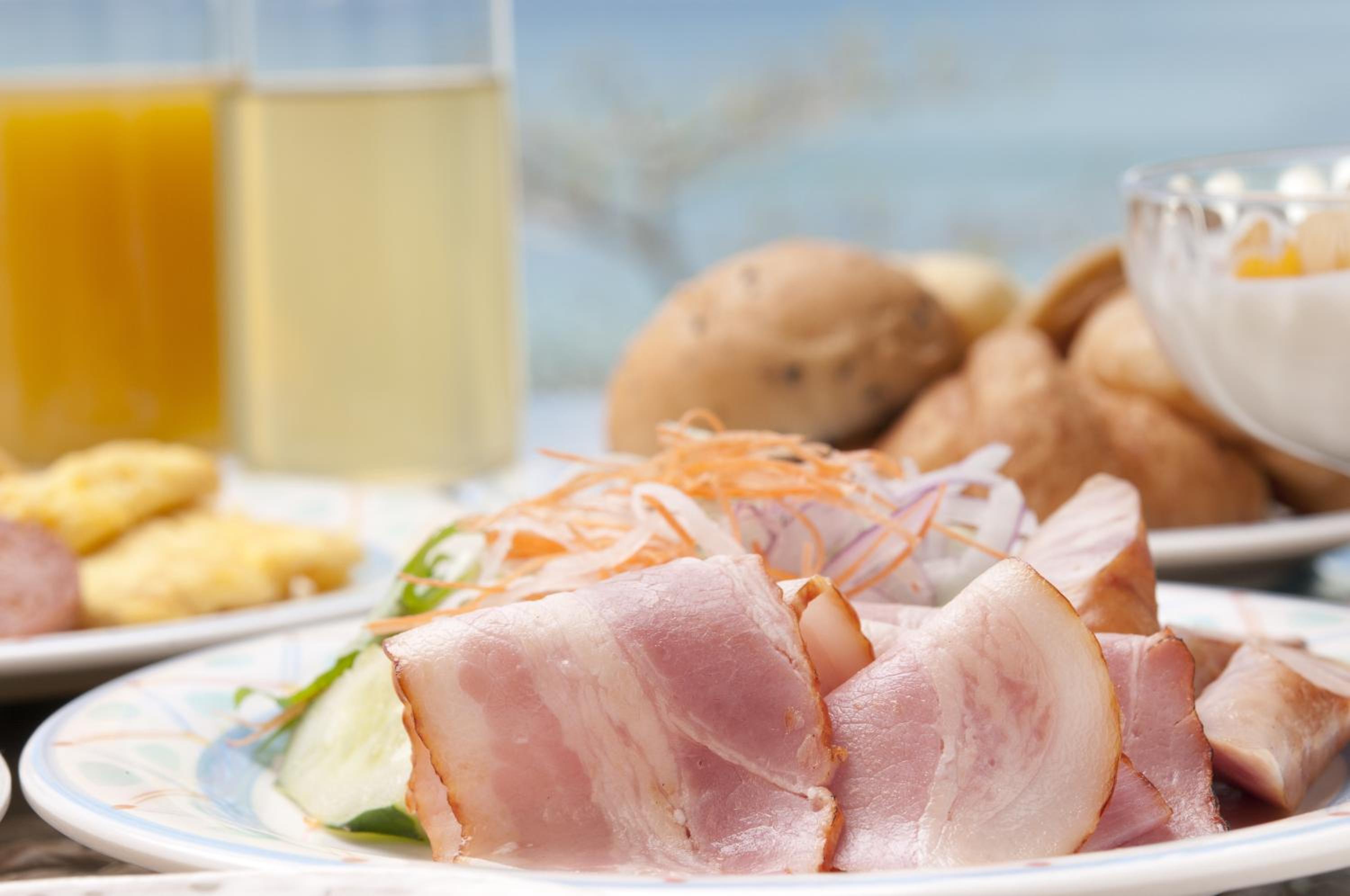 on the beach with free parking. several restaurants across the street and a convenience store next to the hotel. breakfast was interesting for non-Japanese, but grateful for new foods to try