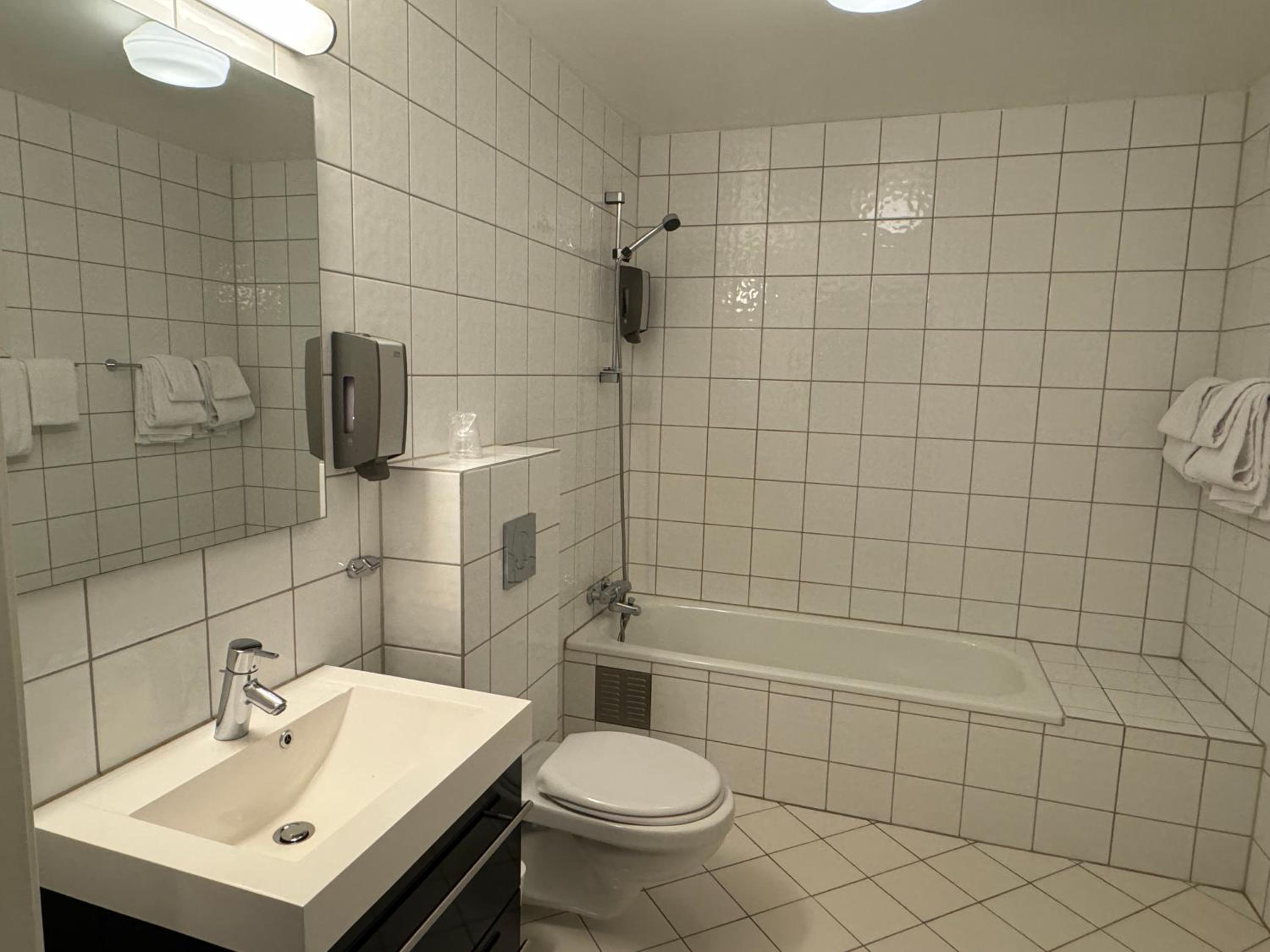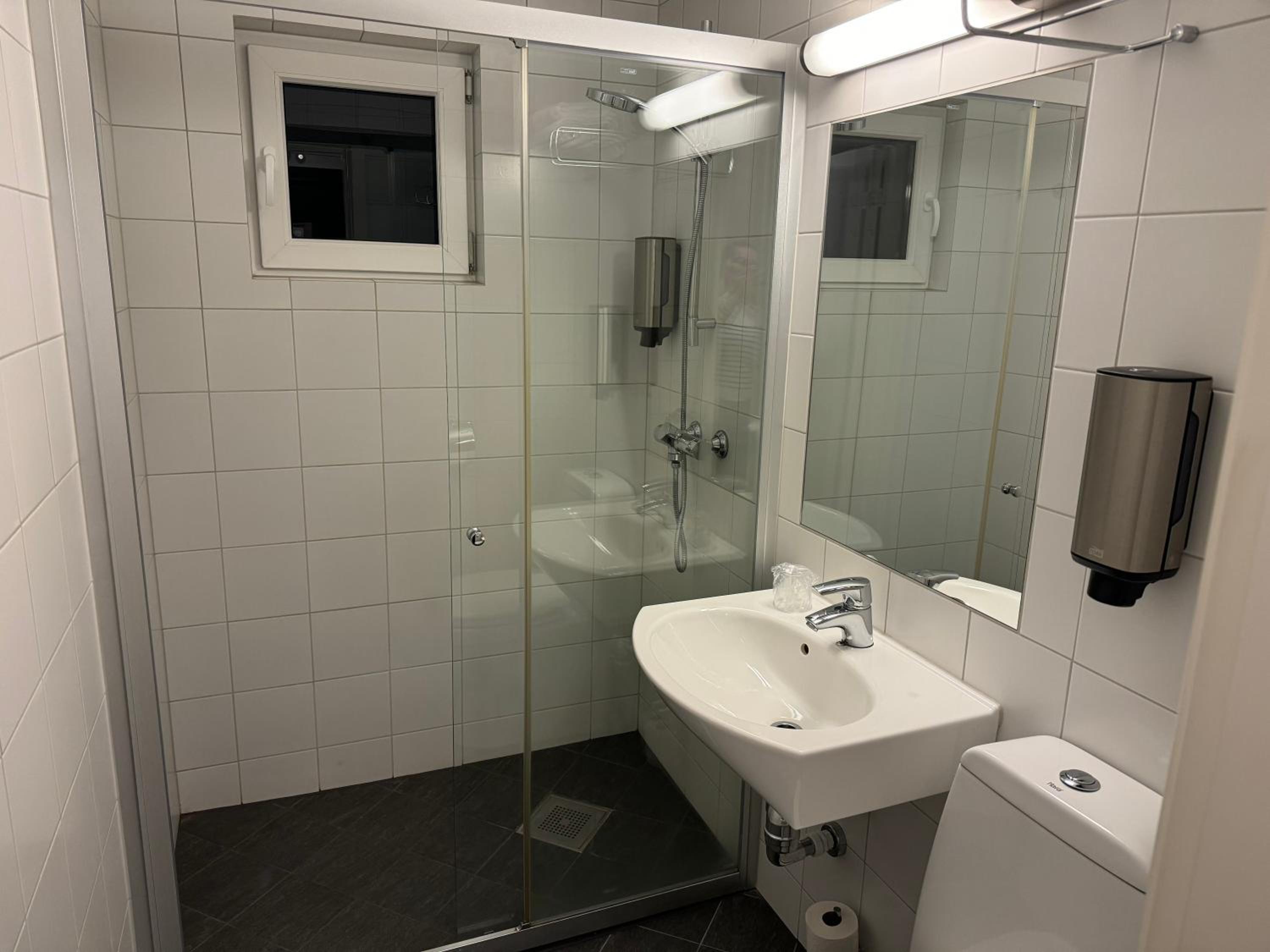 Mørk resepsjon. Verdens minste dusj. Kunne ikke snu meg uten å opne døren.