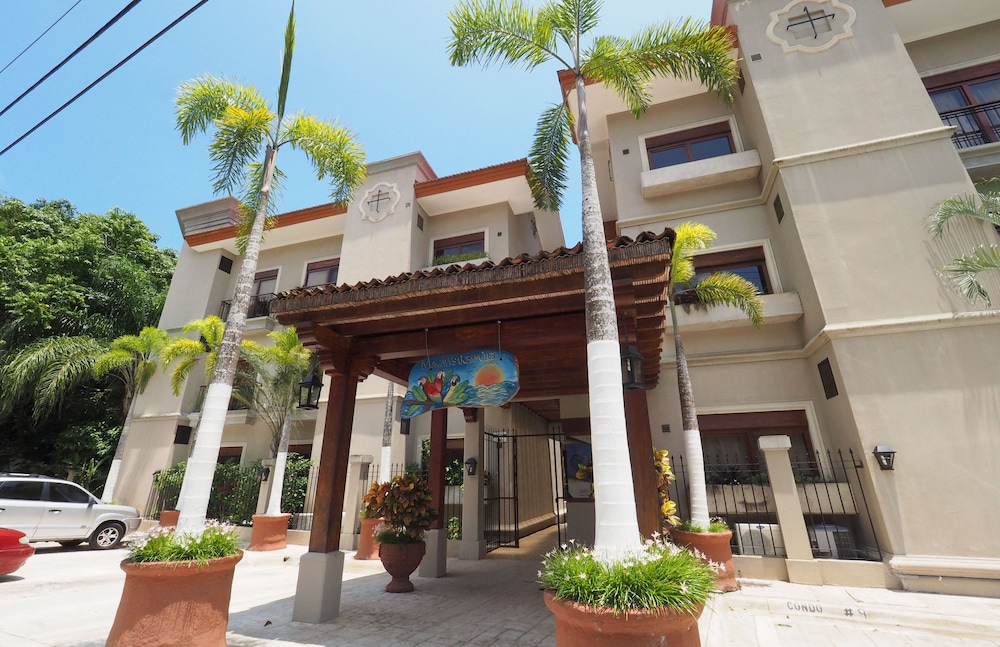 We stayed at the Sunset Boulevard Building, part of the Macaw, just down the street. Ocean vuew apartment, 30 second walk from the beach, modern clean and wonderful! 2 bedrooms and bathrooms, one bedroom had 2 beds, easily slept 5 people, also had a sofa bed. Wpuld highly recommend. Plus the plus that runs Macaw, Costa Rica Holiday rentals, can book tours and schedule an airport shuttle. Book it! You won't regret it!