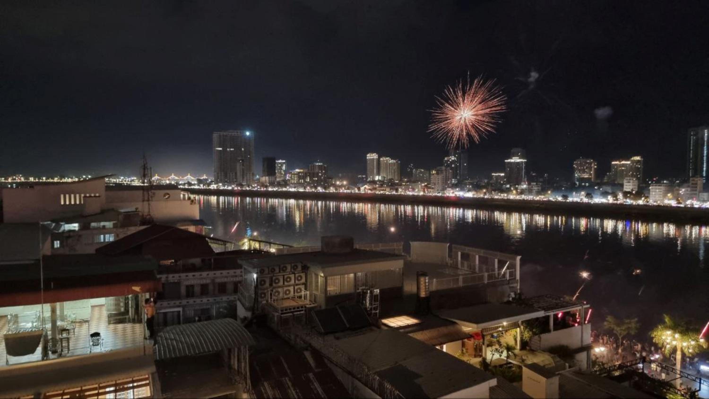 In a good location, right by the riverside, near many bars and restaurants