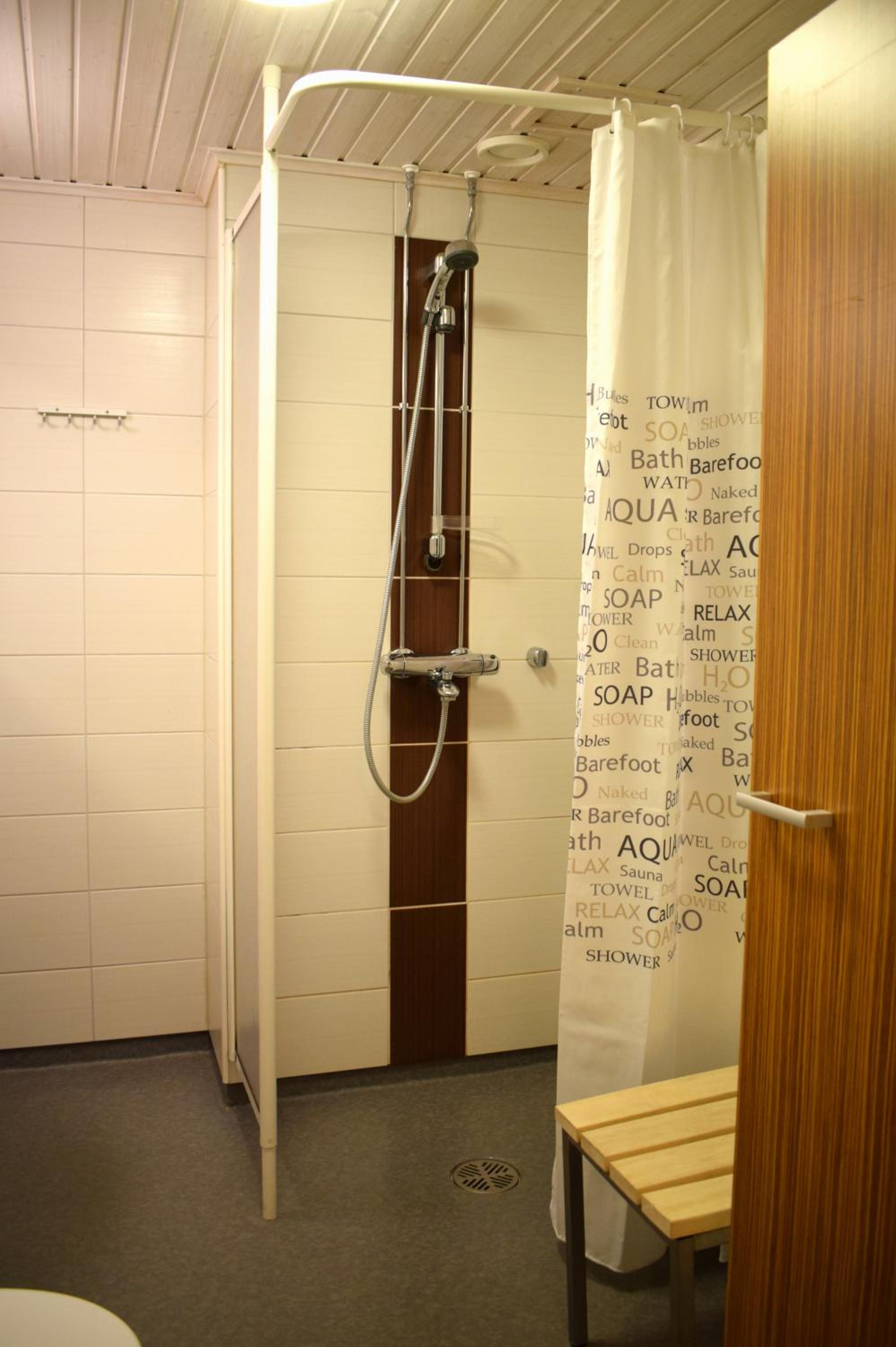 Suihkutilassa jäi vettä lattialle, vaikka olikin verho edessä. Lastaa ei ollut