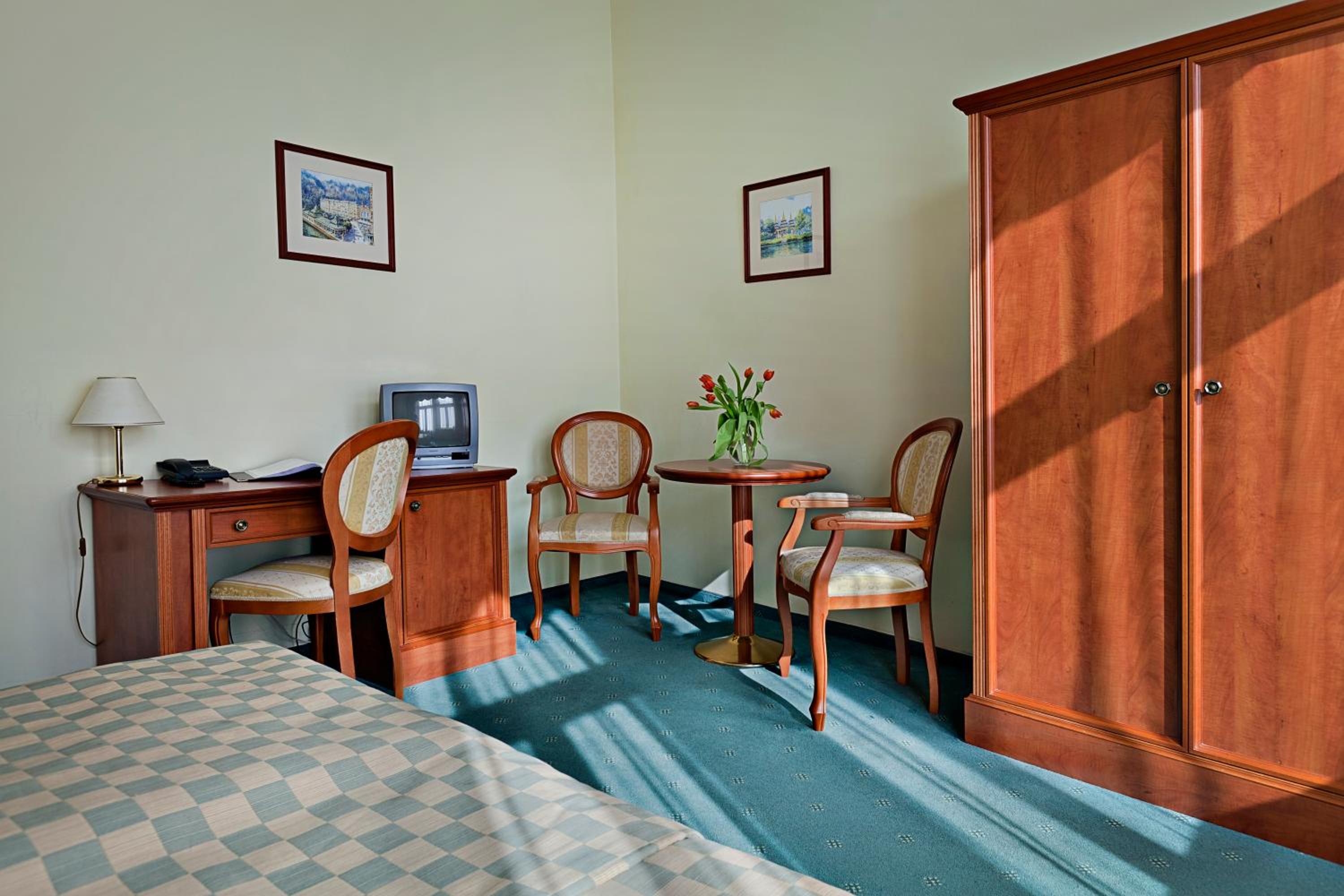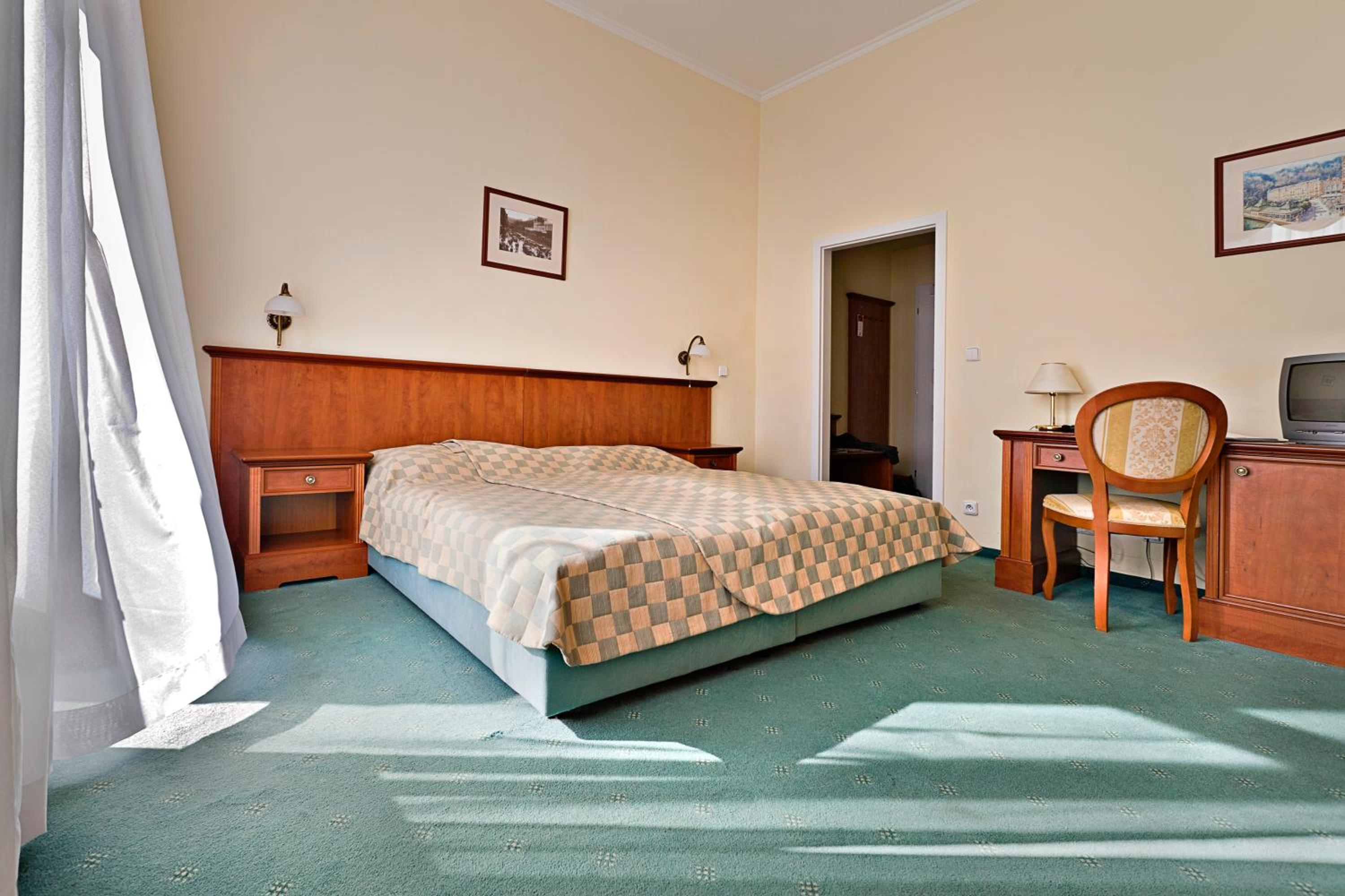 Each room at the hotel is equipped with modern amenities including a flat-screen satellite TV, a minibar, and a private bathroom with plush bathrobes and slippers. The perfect retreat after a day of exploring the nearby spa colonnades.
