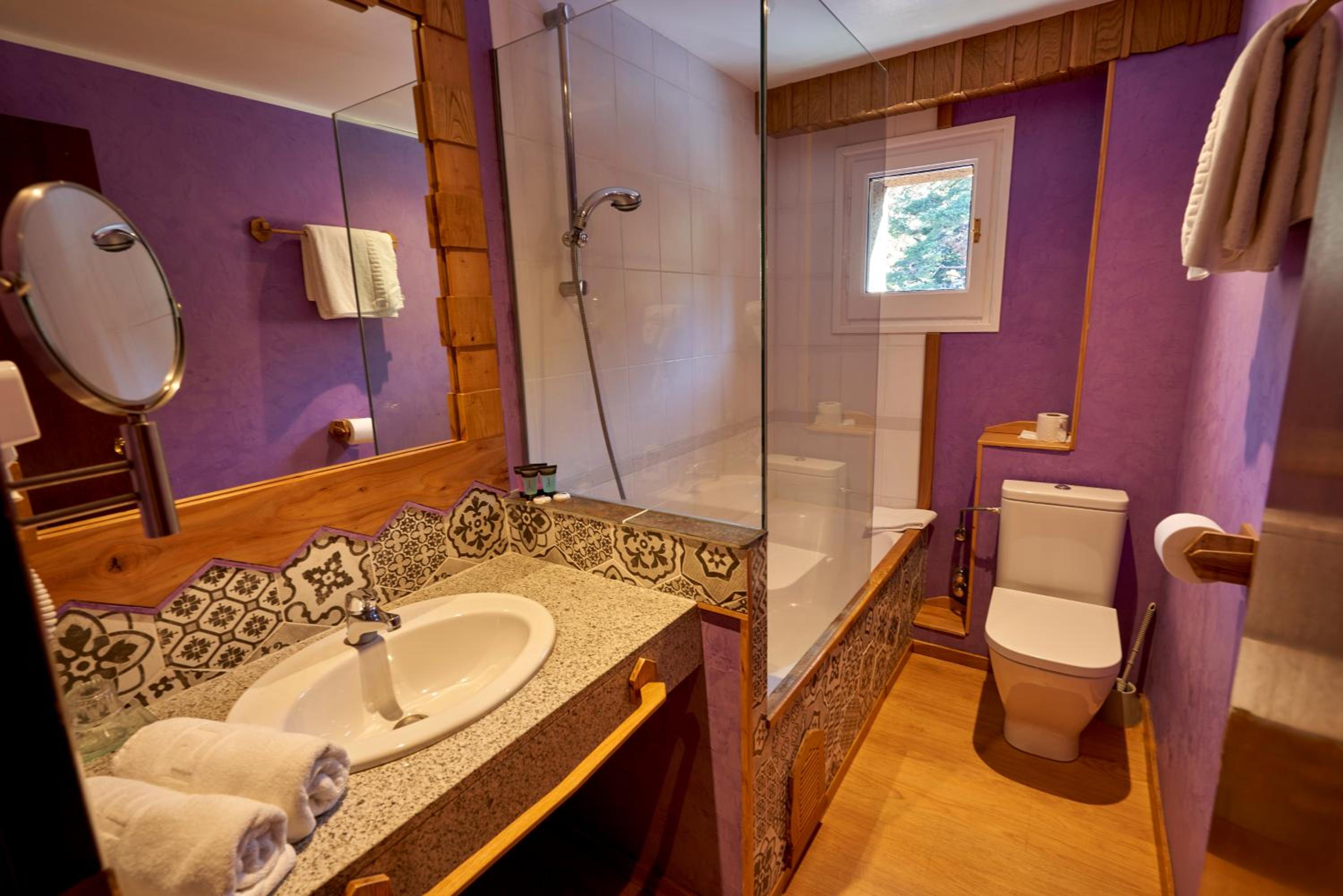 Lo mejor es la ubicación tan tranquila y única que tiene. Tiene cierta altitud, con lo que es fácil ver nevar y disfrutar la nieve. La habitación es bonita, tipo rústica de madera con un plato de ducha grande. Bastante cálida la habitación, quizá demasiado en la noche.