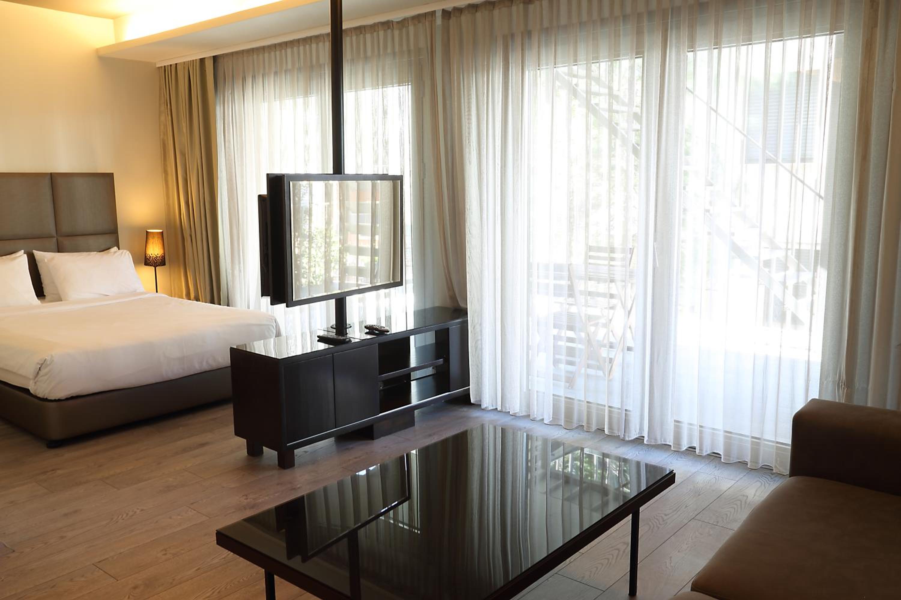 Step into rooms adorned with elegant interiors, wooden floors, and modern furniture in vibrant colors. Enjoy complimentary water, tea, coffee, and biscuits while relaxing amidst tasteful decor, complete with long curtains and wall art.