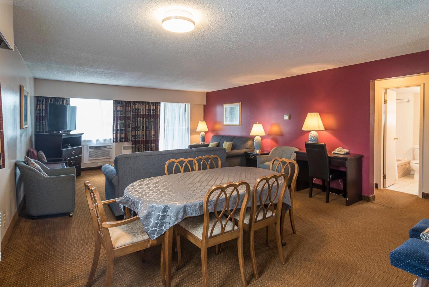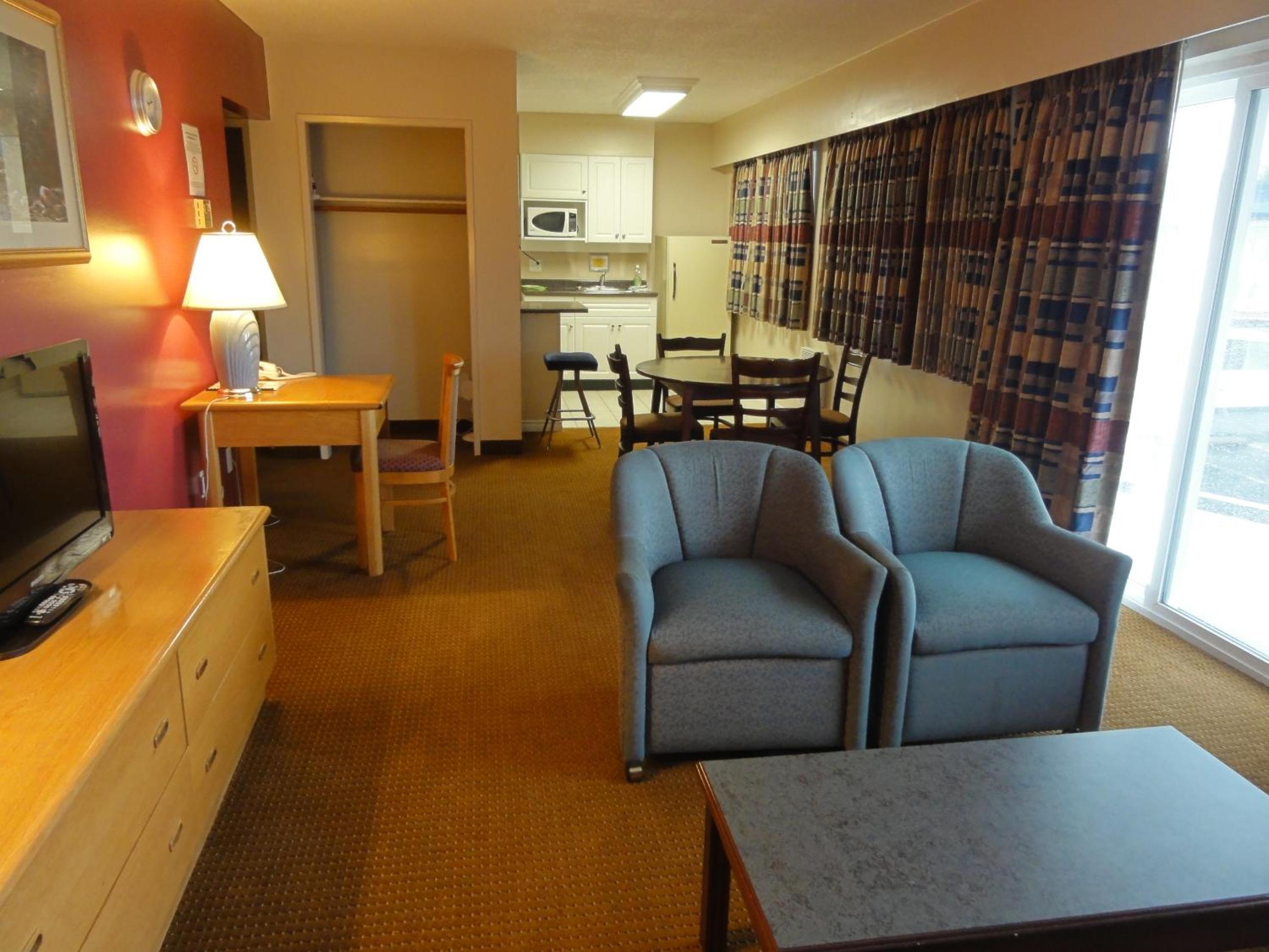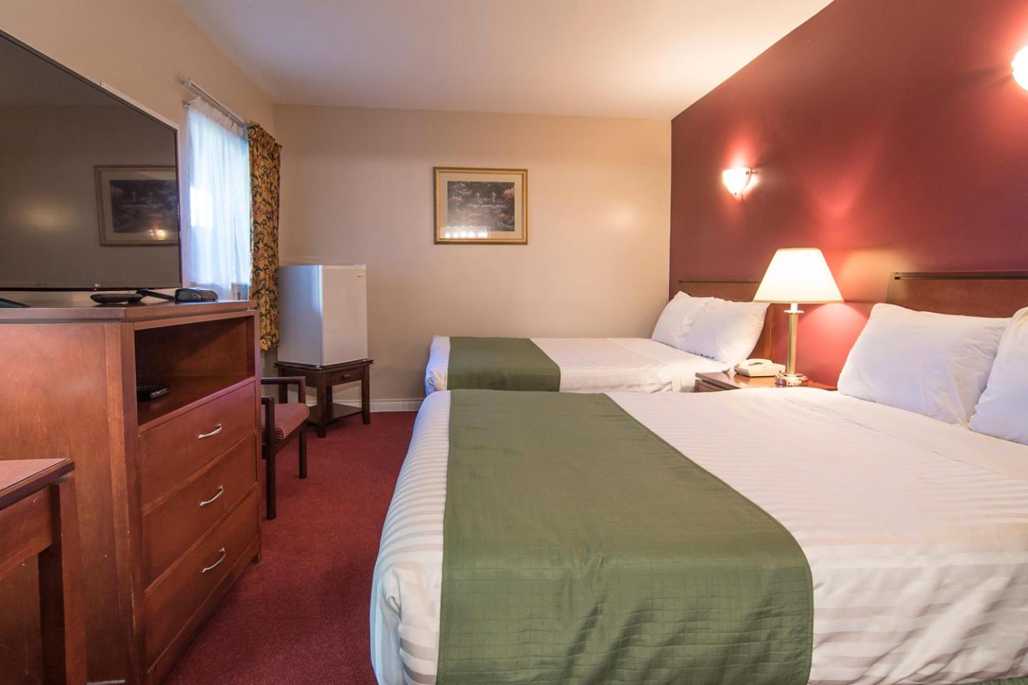 Comfortable Rooms with Modern Touches: Unwind in rooms equipped with flat-screen cable TV, free WiFi, and convenient amenities like a coffee maker, fridge, and work desk. Everything you need for a comfortable stay.