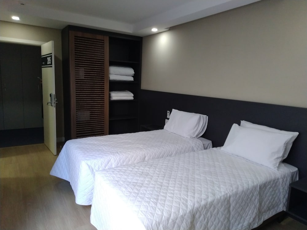 O staff é solícito e simpático, as instalações são bem limpas e organizadas. O quarto também tem amplo espaço. Há um ótimo espaço no rooftop com piscina e mesas, com vista das planícies ao redor de Pelotas.