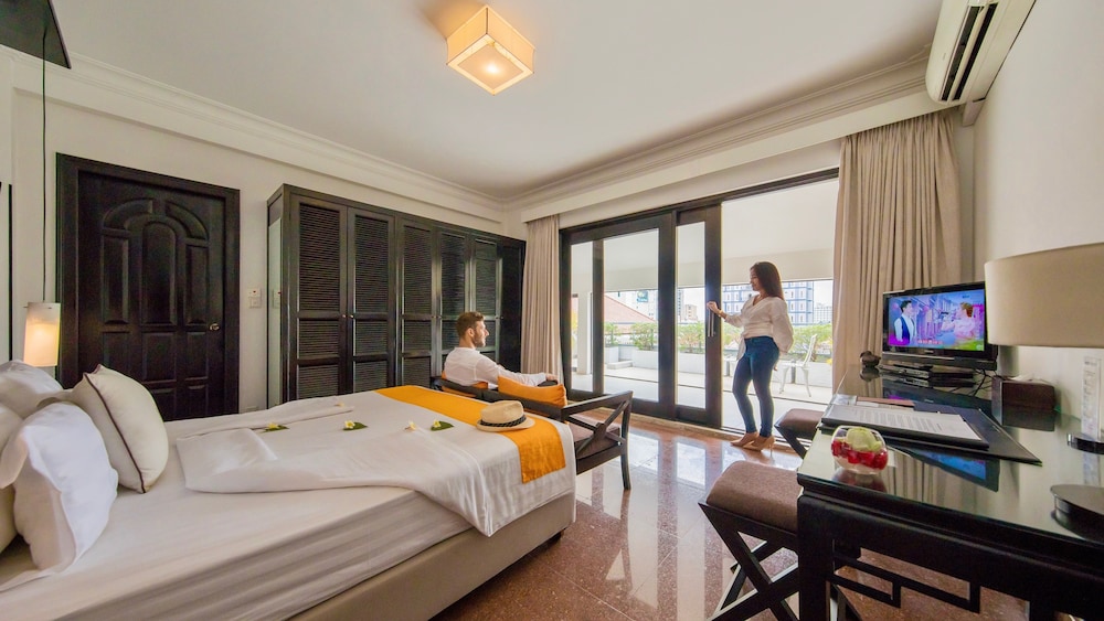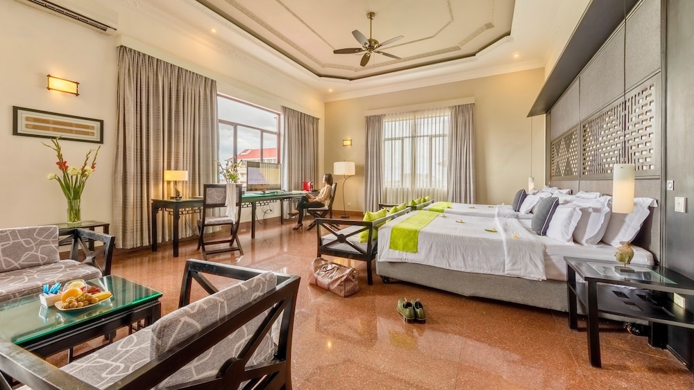 A very colonial hotel on a quiet side street, tucked away behind a small entrance and featuring beautifully landscaped gardens. The room was spacious and grand, with a comfortable, large shower in the expansive bathroom. The room was very clean and comfortable. The staff at the front desk are polite and pleasant, responding promptly to a couple of requests that I had. The hotel itself was formerly the American Embassy, which contributes to its grand interior, including an amazing staircase. I couldn't find any faults; the hotel is truly first class by Phnom Penh standards. This gives it a five-star feel at first sight, along with genuine warmth and charm. The location is central to key historical sights and local restaurants, so I highly recommend it. It was a truly amazing stay, and I will return.