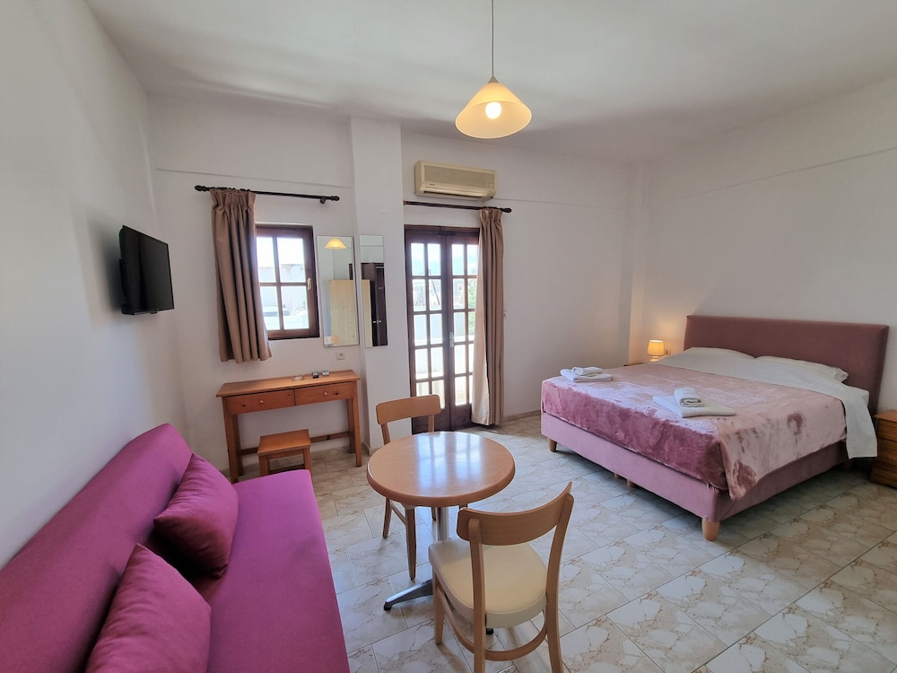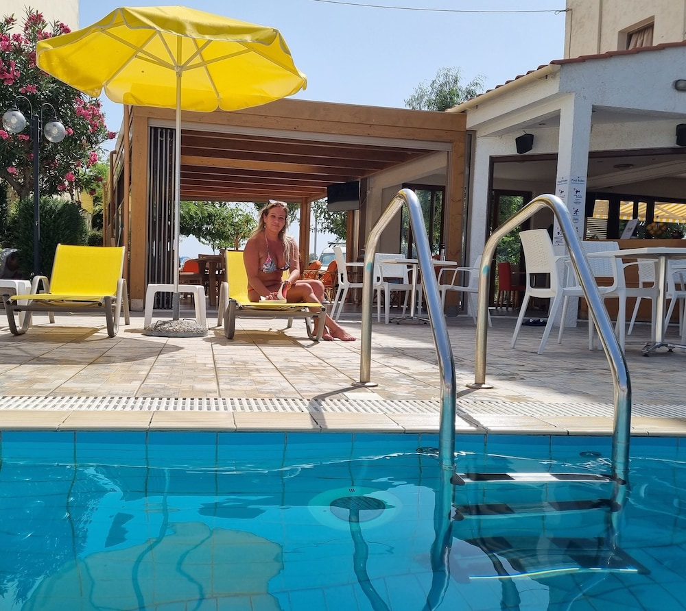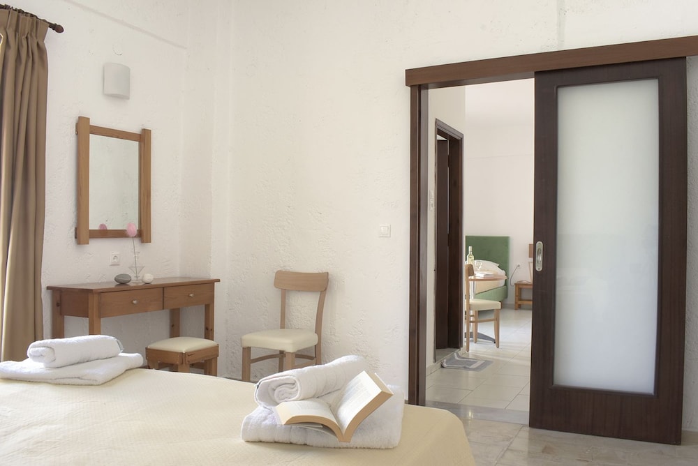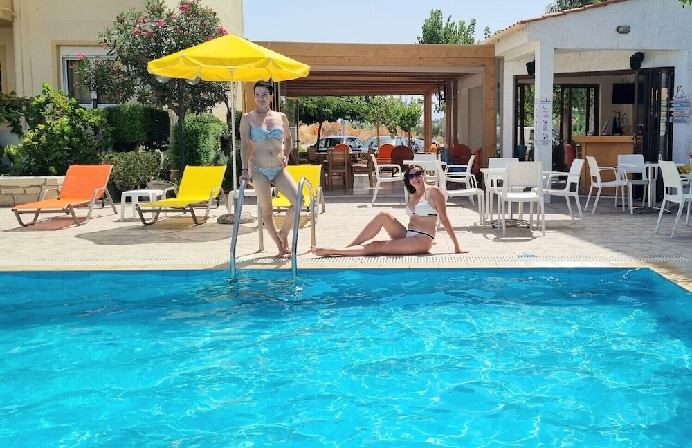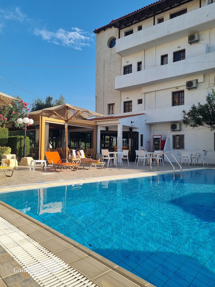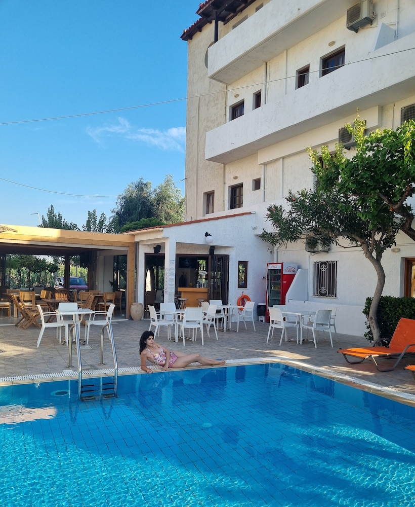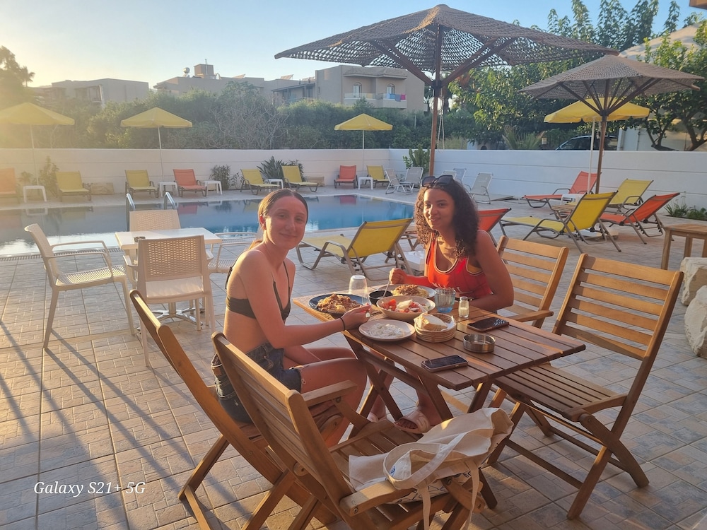Our stay was arranged last minute but the very friendly family hotel owners were incredibly flexible and considerate when catering for our particular needs. Our room was spacious and clean. Although self-contained in terms of bar, food and swimming pool, it is only 5 minutes walk from the beach and beachside shops/restaurants. An enjoyable and memorable short stay. Homemade ice cream a speciality. Also have on sale interesting local wines, honey and oil for gifts. Only 15 minutes drive from Heraklion airport.