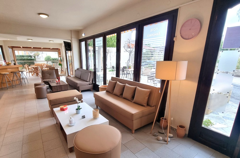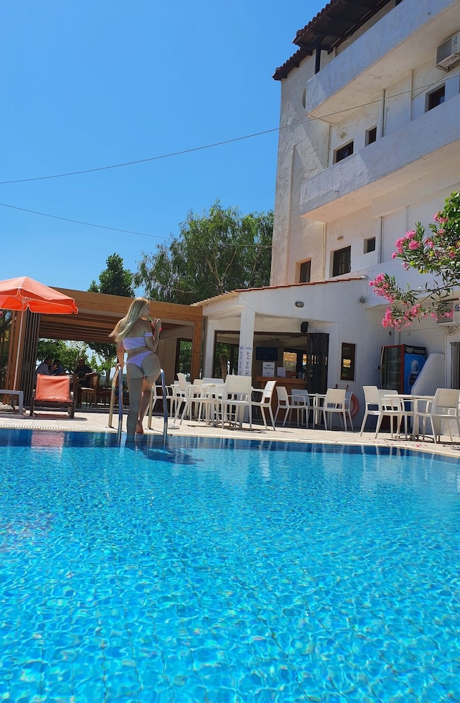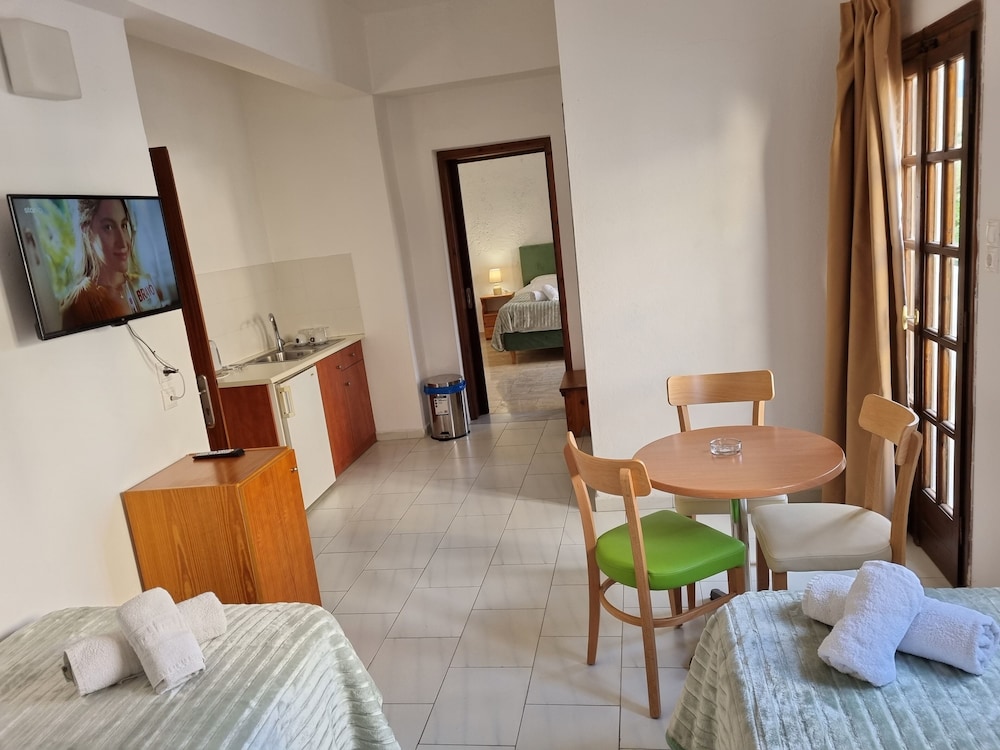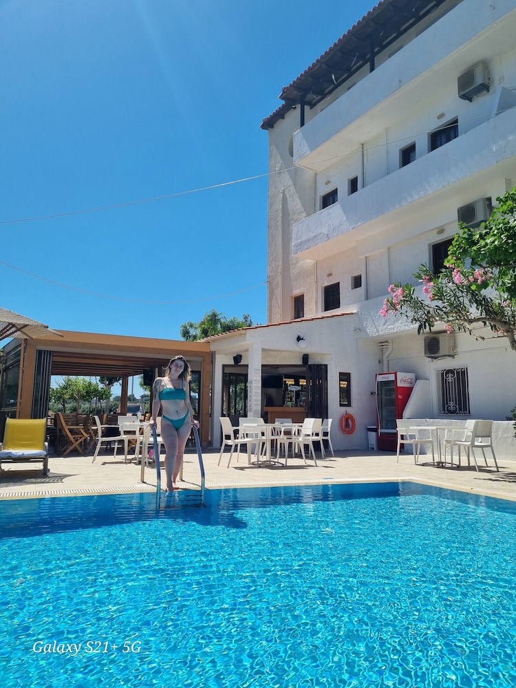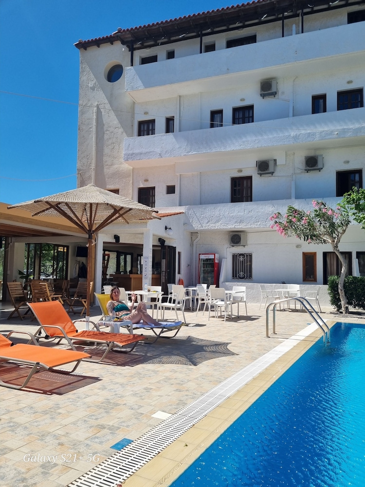 I was at the Arhodiko for five nights, October 2015. I loved that I could walk to the Main Street, shop, and eat in some very good restaurants close by. I loved that I had a balcony from which to watch the sunset, a fridge, and the older couple who mostly were there gave me a kettle to make tea in my room. The grandson spoke excellent English but he isn't there much so you explain as best you can. They are a lovely family. The pool was immaculately clean and perfect for sunbathing on the loungers. I found that a few mosquitoes came in at night, because there are no screens and I had the doors open a bit. The shower is very small indeed, hardly room to turn around, and you have to just hold the shower head in your hand. But the room was cleaned daily. Plus the breakfast of ham, cheese, bread, juice and egg set me up for the day. This is a bargain hotel and for me it was perfect, but don't expect luxury!