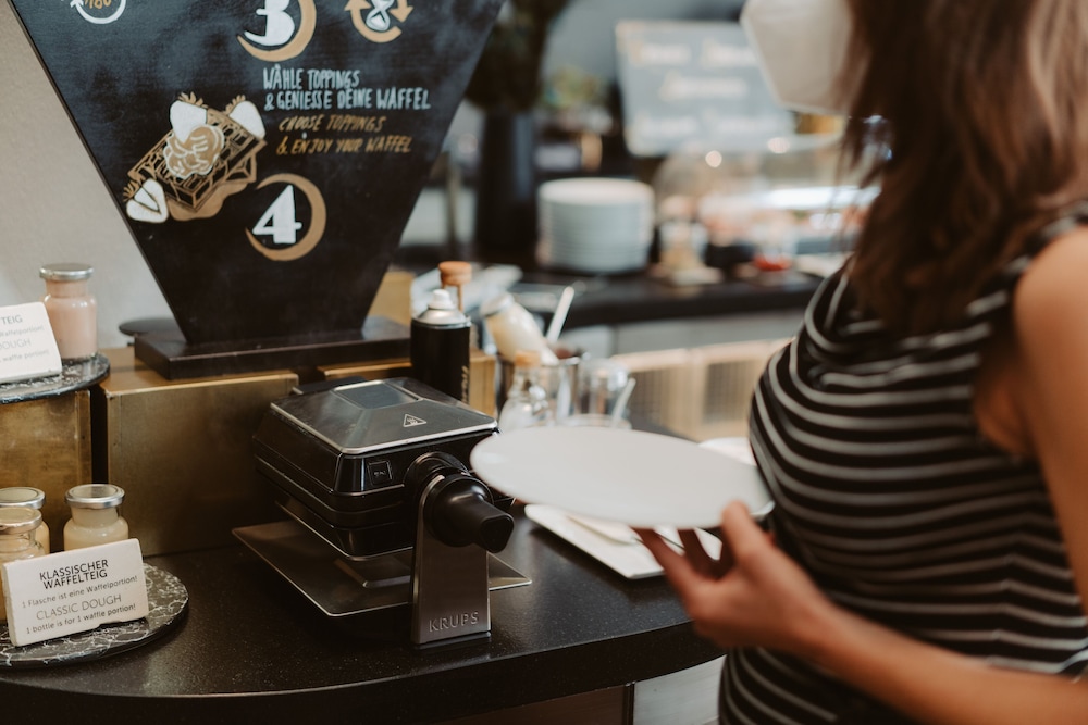Hotel was nicely designed and decorated. Bar was lovely. Service took a while to get a drink, but waiter was funny and kind. Breakfast food was delicious, but self service which was ridiculous as the room is small and so many guests milling around was time consuming and inefficient. Need more than one coffee machine! One waiter in breakfast area was really rude.