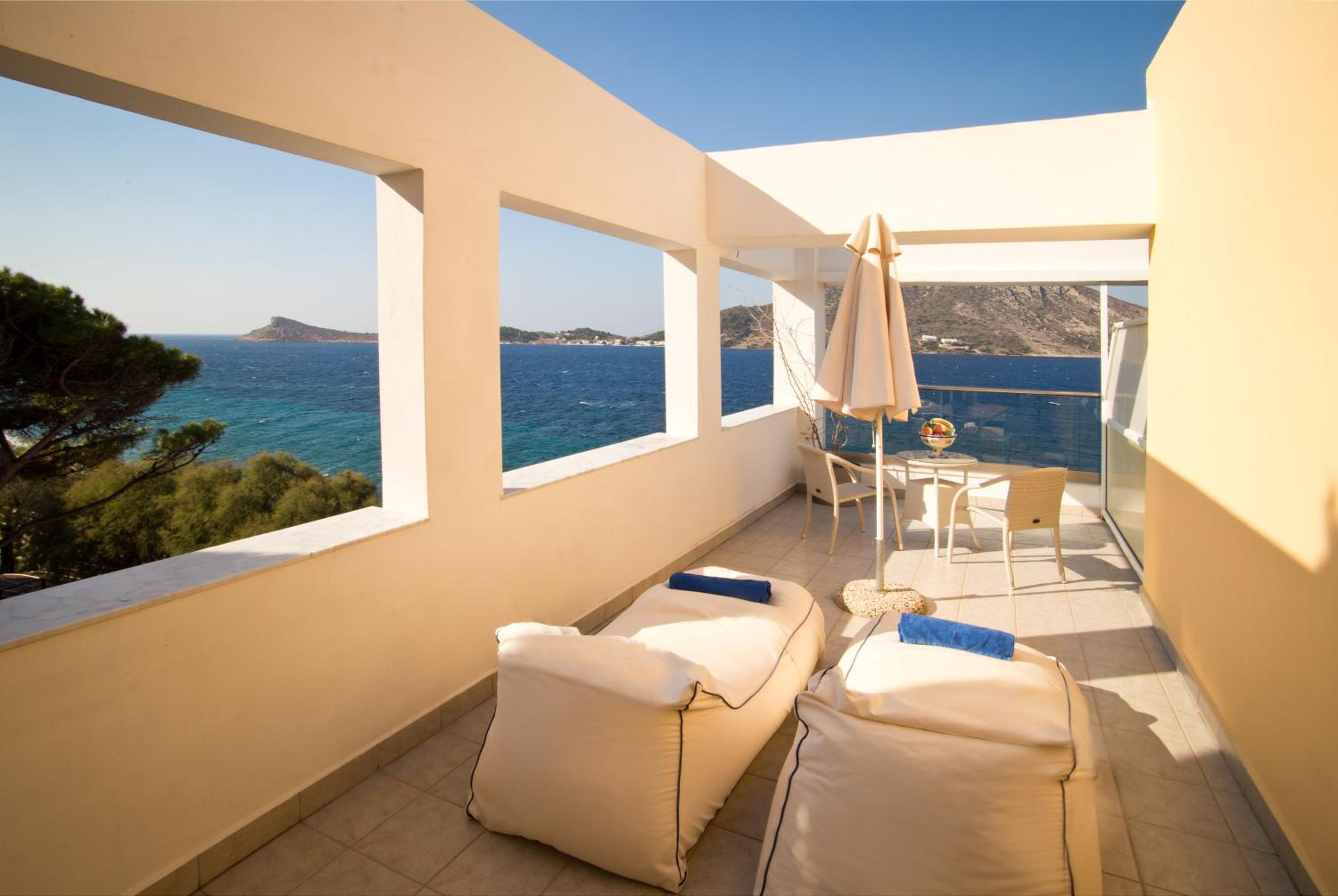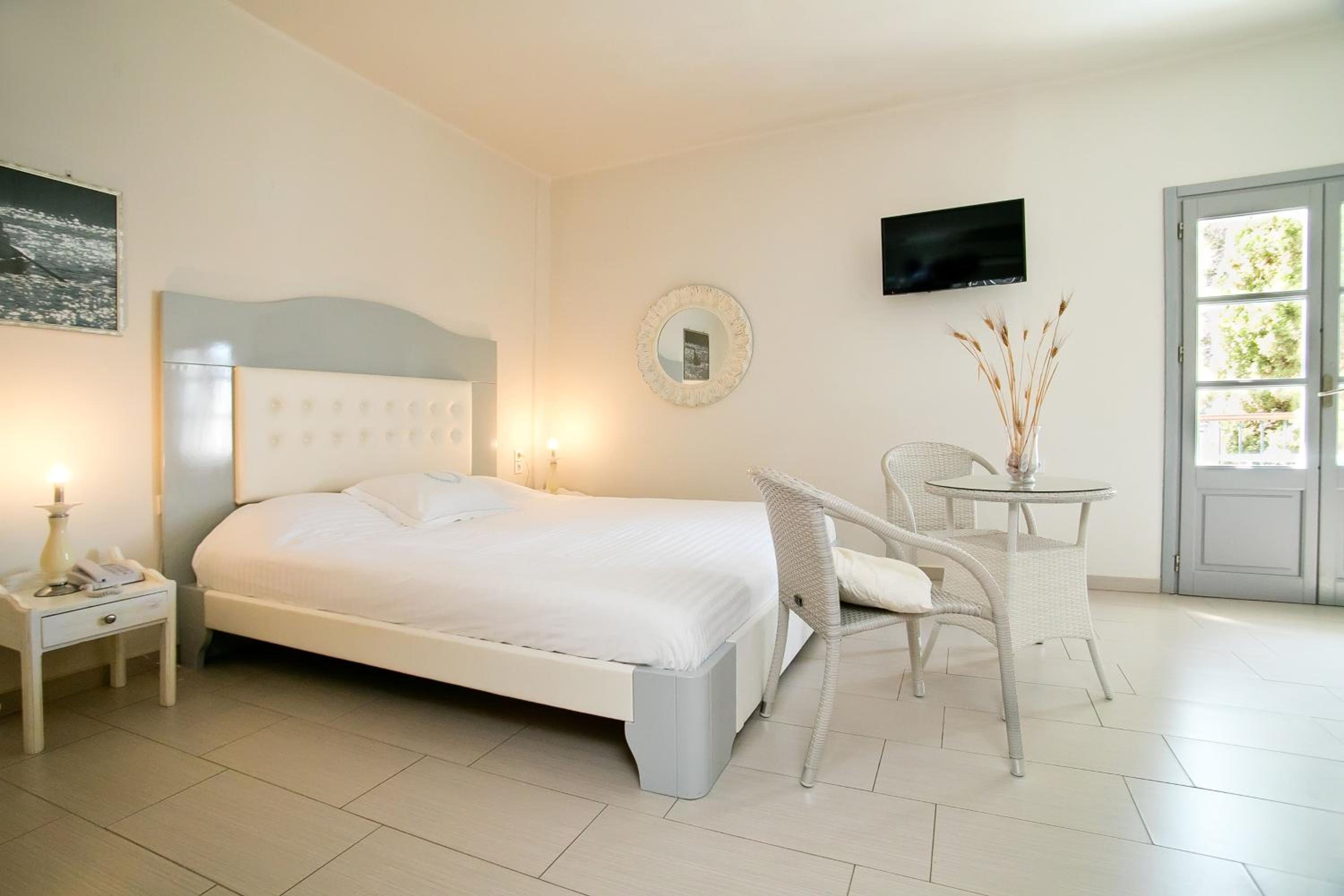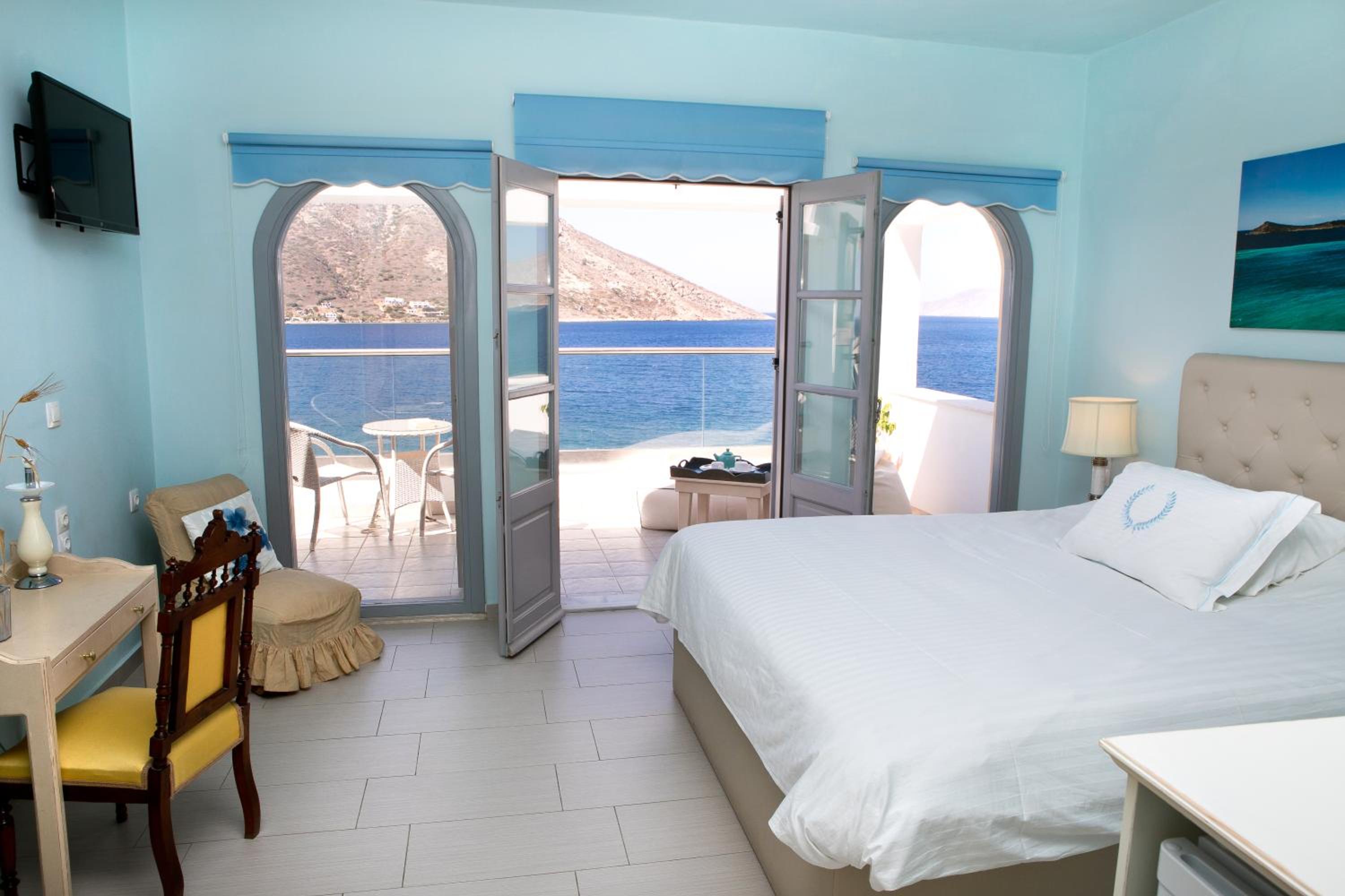 Indulge in the mesmerizing Aegean Sea views from the comfort of your uniquely decorated room or suite with a private balcony or terrace. Enjoy modern amenities like a satellite TV, air conditioning, and a well-equipped bathroom for a relaxing stay.