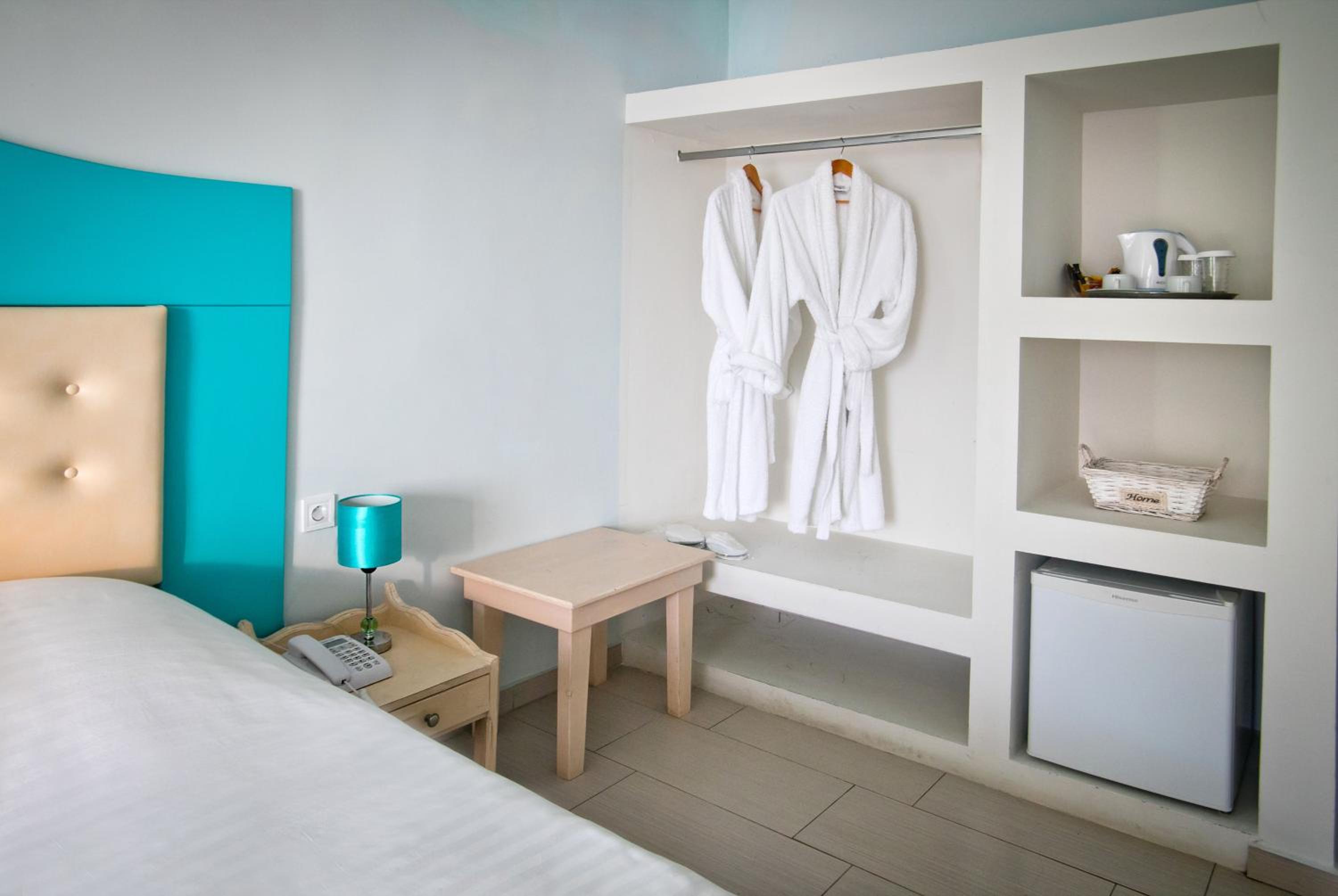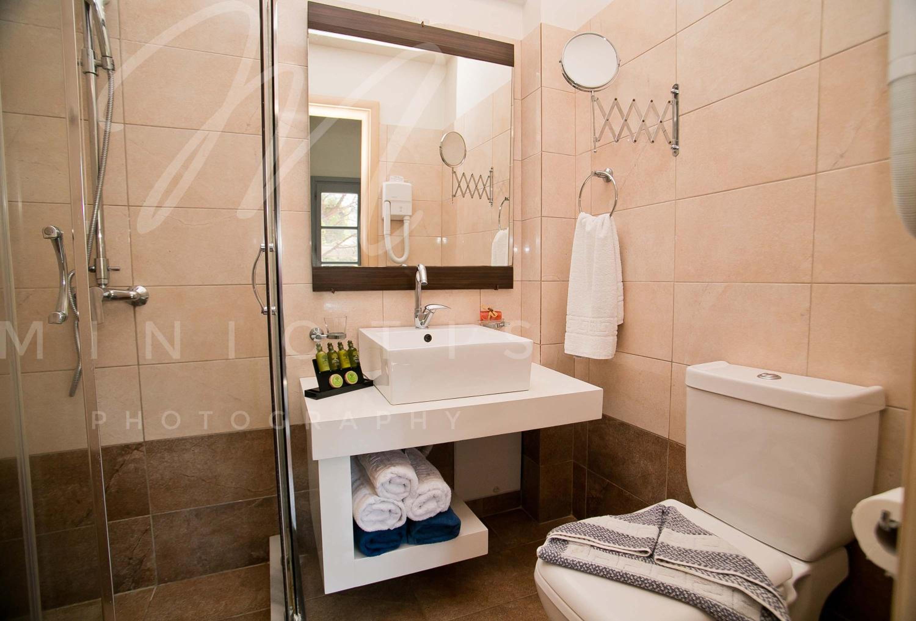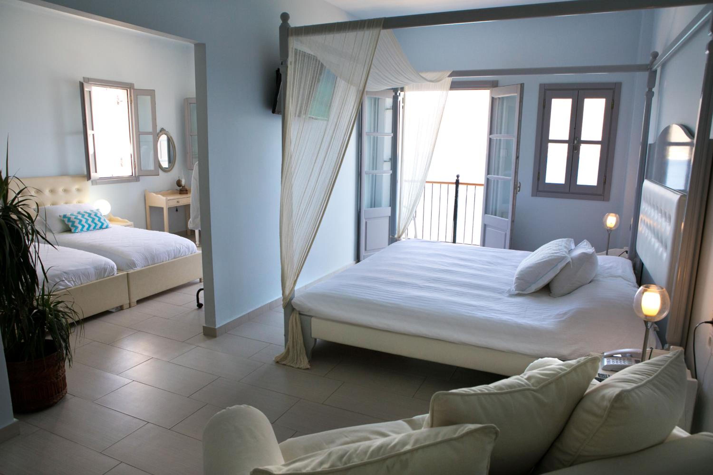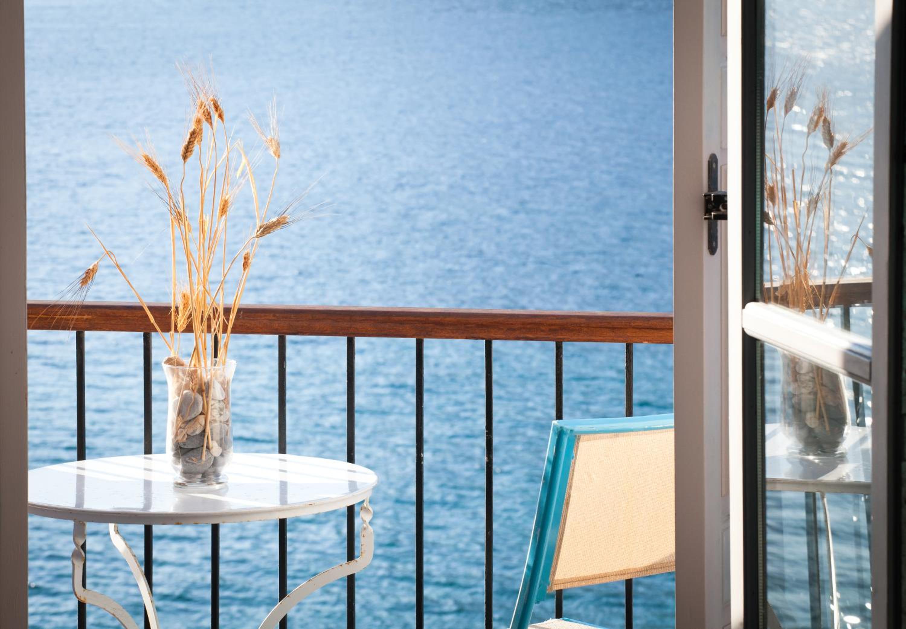 Indulge in the mesmerizing Aegean Sea views from the comfort of your uniquely decorated room or suite with a private balcony or terrace. Enjoy modern amenities like a satellite TV, air conditioning, and a well-equipped bathroom for a relaxing stay.