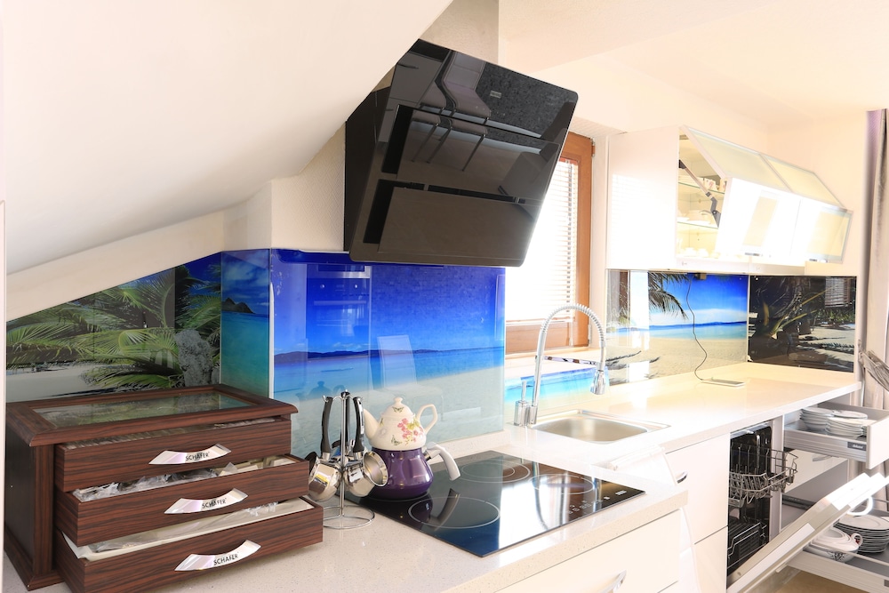 Despite the 2nd room being in dramatically better shape it still faced critical issues of the wifi modem needing to be replaced , the oven controls broken , the dishwasher filter being so clogged as to render it useless , the shower drained being so clogged that the hot tub was the sole bathing option , and cooking pots and pans in barely usable condition . Despite all the linens being immaculately clean , all the furniture was disturbingly stained and scuz build up abounded in many places , particularly around drains , vents and floor crannies .