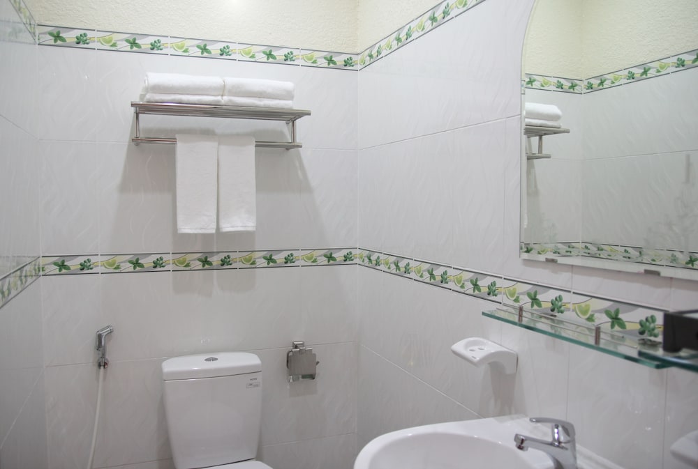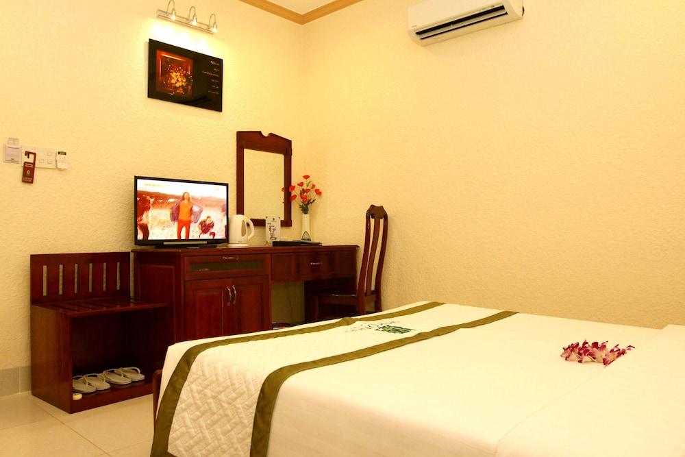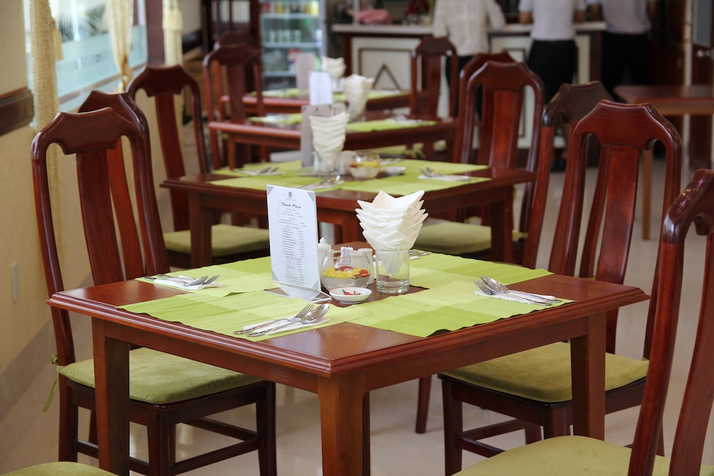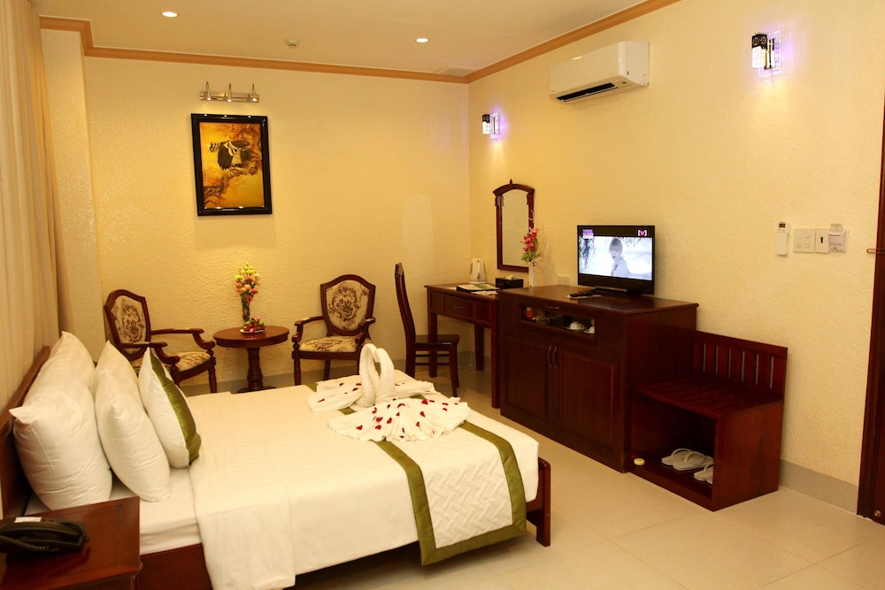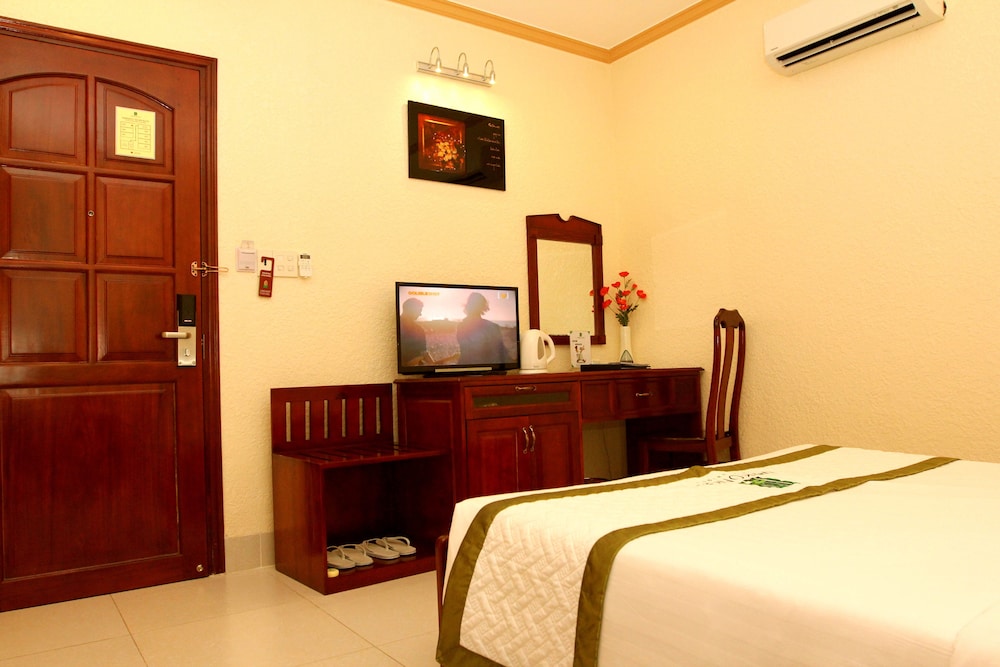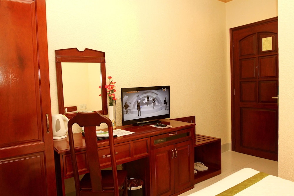 Friendly staff, very clean facility and room, new equipment (fridge, a/c, bathroom, nicely decoration, reasonable size in a quiet neighborhood. The bathroom is very clean - however, standard room only has shower, no bathtub so it takes some time to get use to taking a shower without a shower curtain. So it may be better to reserve a deluxe room for a few dollars more per day. The restaurant food is average. Breakfast buffet (with Western and Vietnamese food) is included in the price. They also offer a very inexpensive business / work lunch menu. There are a few restaurants in the neighborhood, including a few café.