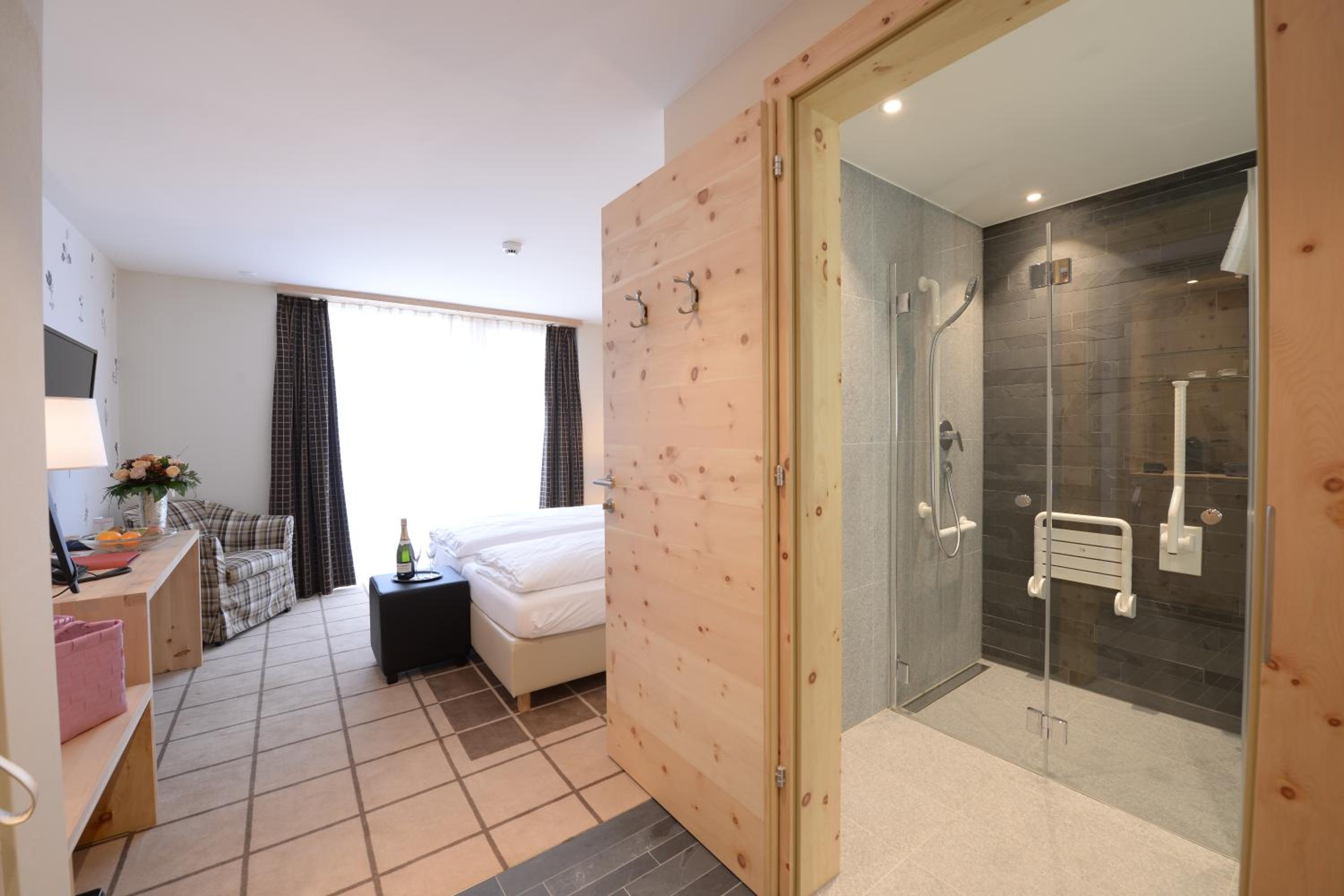 The room was very spacious, with both a shower and a bathtub, and a beautiful view of the Matterhorn.
