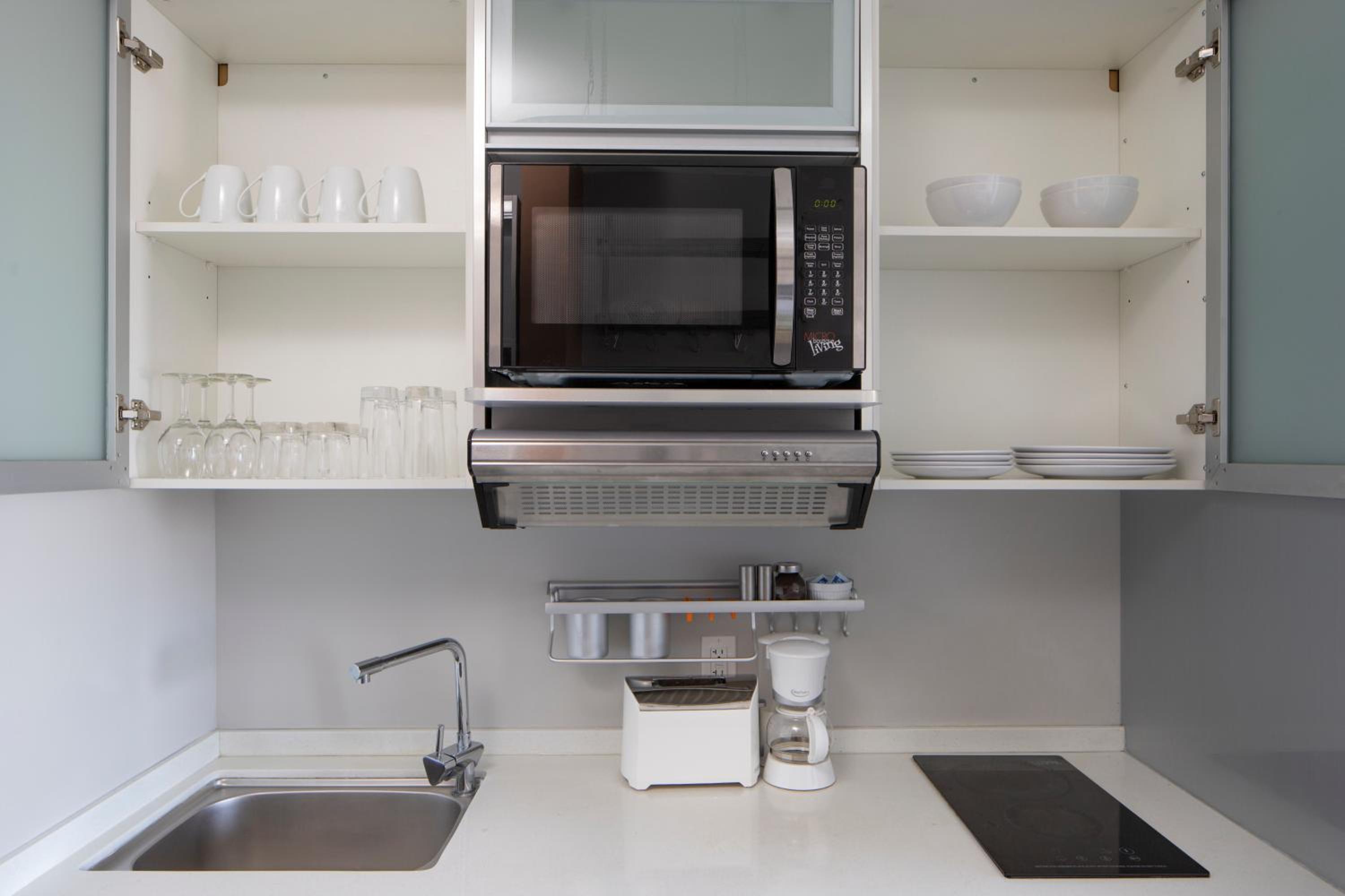 Luxurious Kitchenette Suites: Enjoy the convenience of a well-equipped kitchenette with granite counter-tops and stainless steel appliances, perfect for preparing meals during your stay.