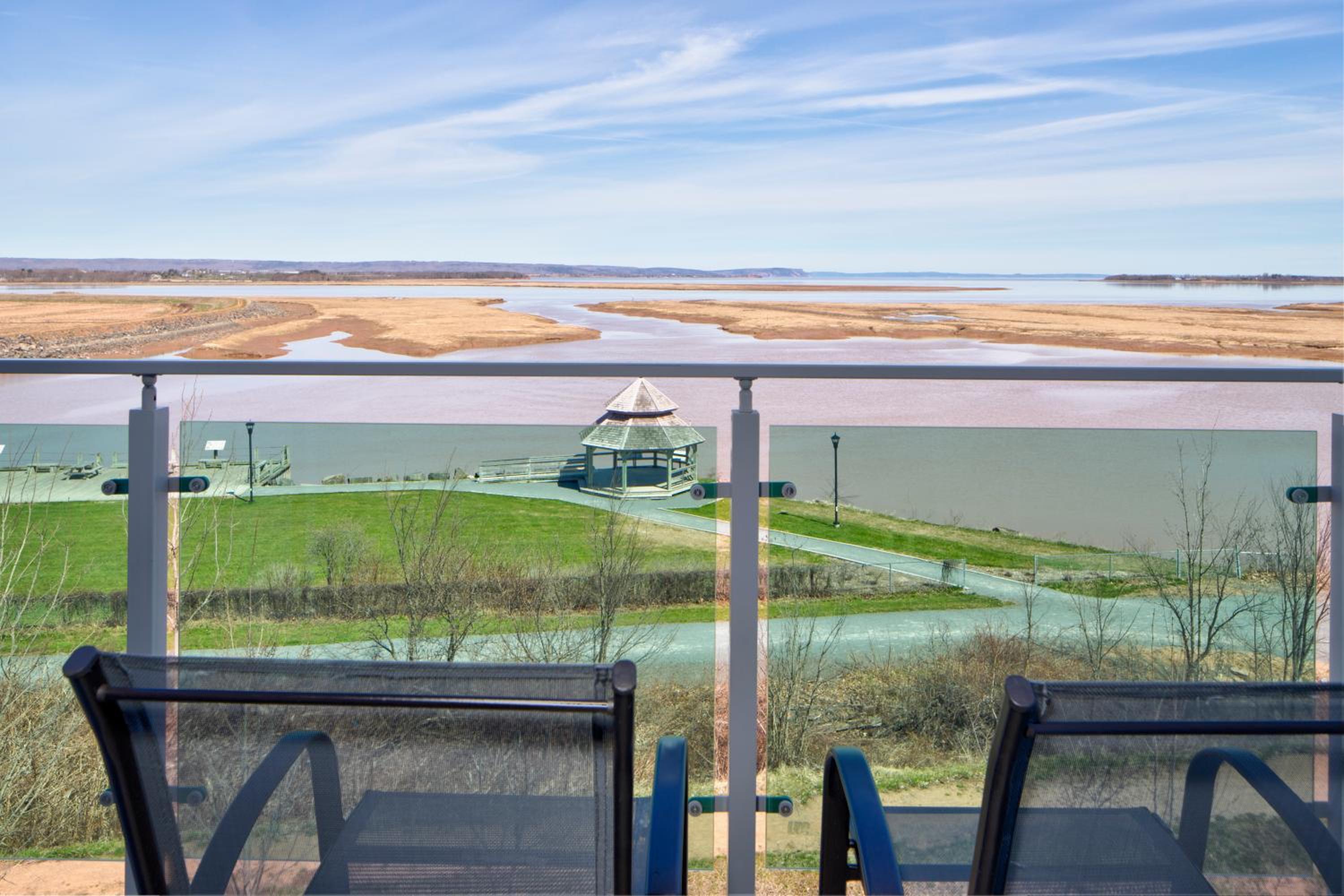 Scenic Views of the Minas Basin: Relax on your private balcony overlooking the stunning Minas Basin, known for some of the world's highest tides, creating a picturesque backdrop for your getaway.
