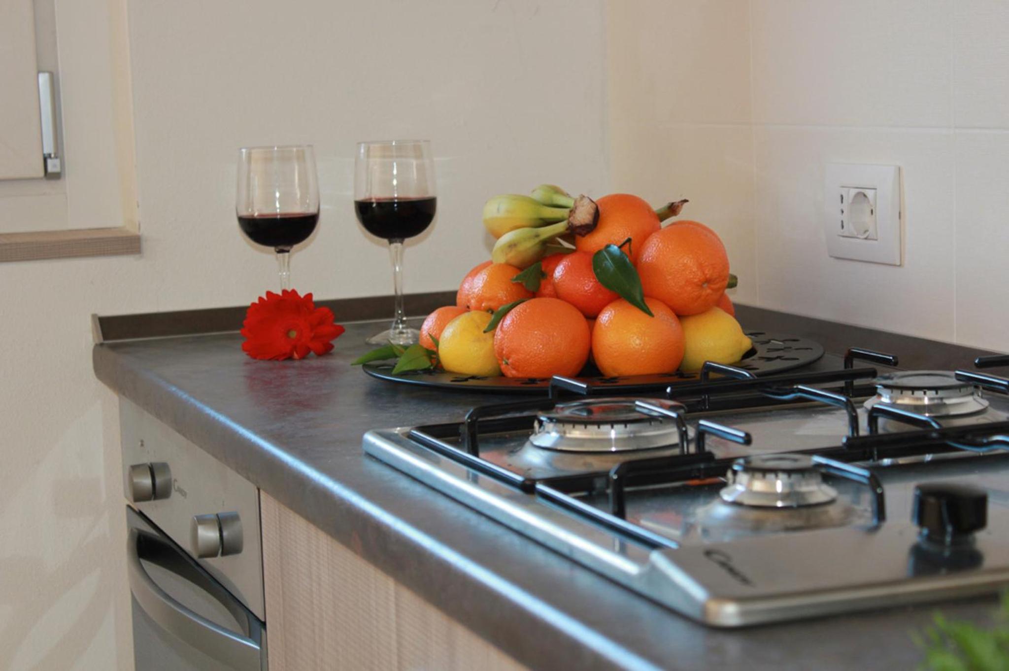 In der Küche findet man Spülmaschine, Mikrowelle und Ofen. Besteck und Geschirr sind neben Kochgeschirr vorhanden. Ansonsten sollte man , sofern man kochen möchte, alles mitbringen. Es gibt keine Gewürze, Zucker o.ä.