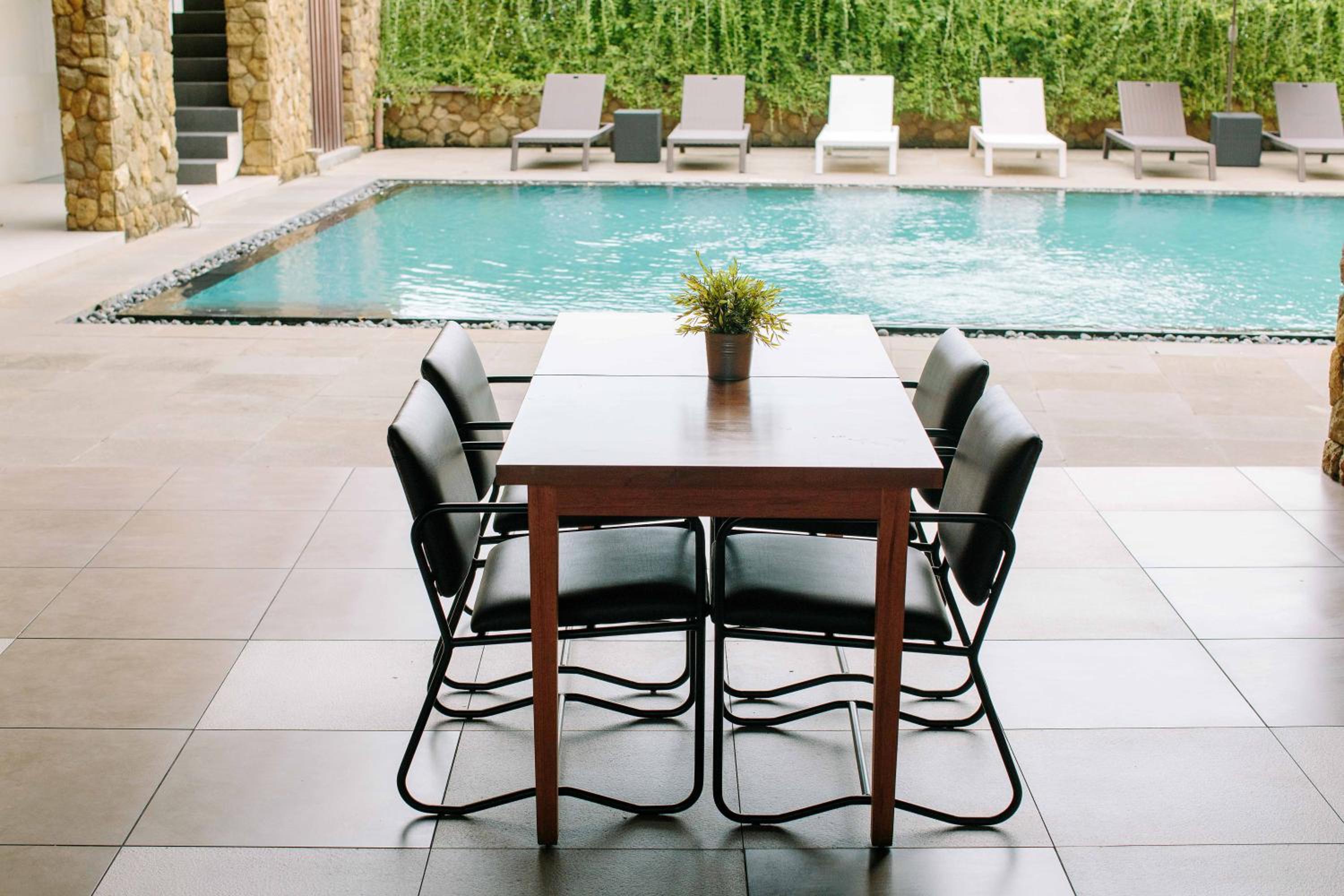 Modern style, nice clean pool, nice sports bar set up. Amazing staff, very friendly and helpful.
