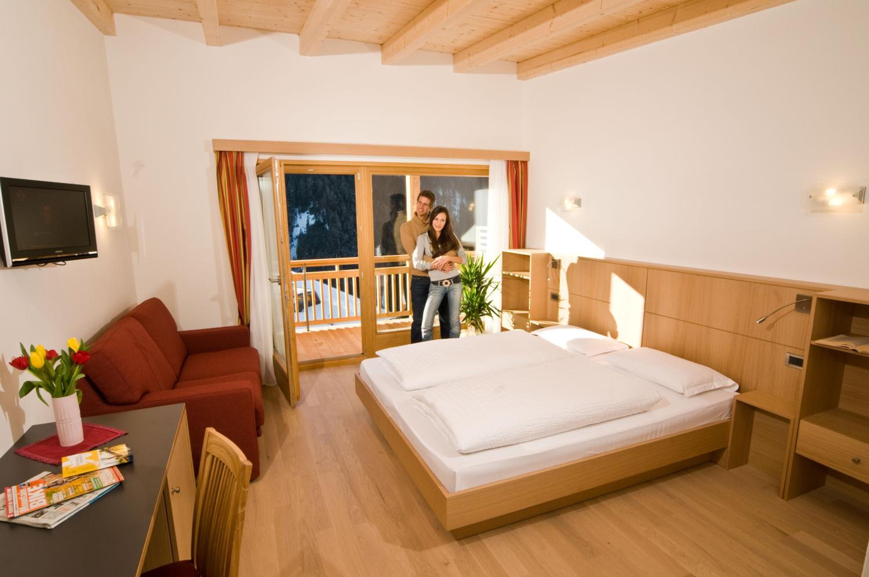 Experience comfort and style in the modern yet rustic rooms adorned with classic Alpine wood furniture. Each room features a balcony, flat-screen TV, and a private bathroom, providing a cozy retreat after a day of adventures.
