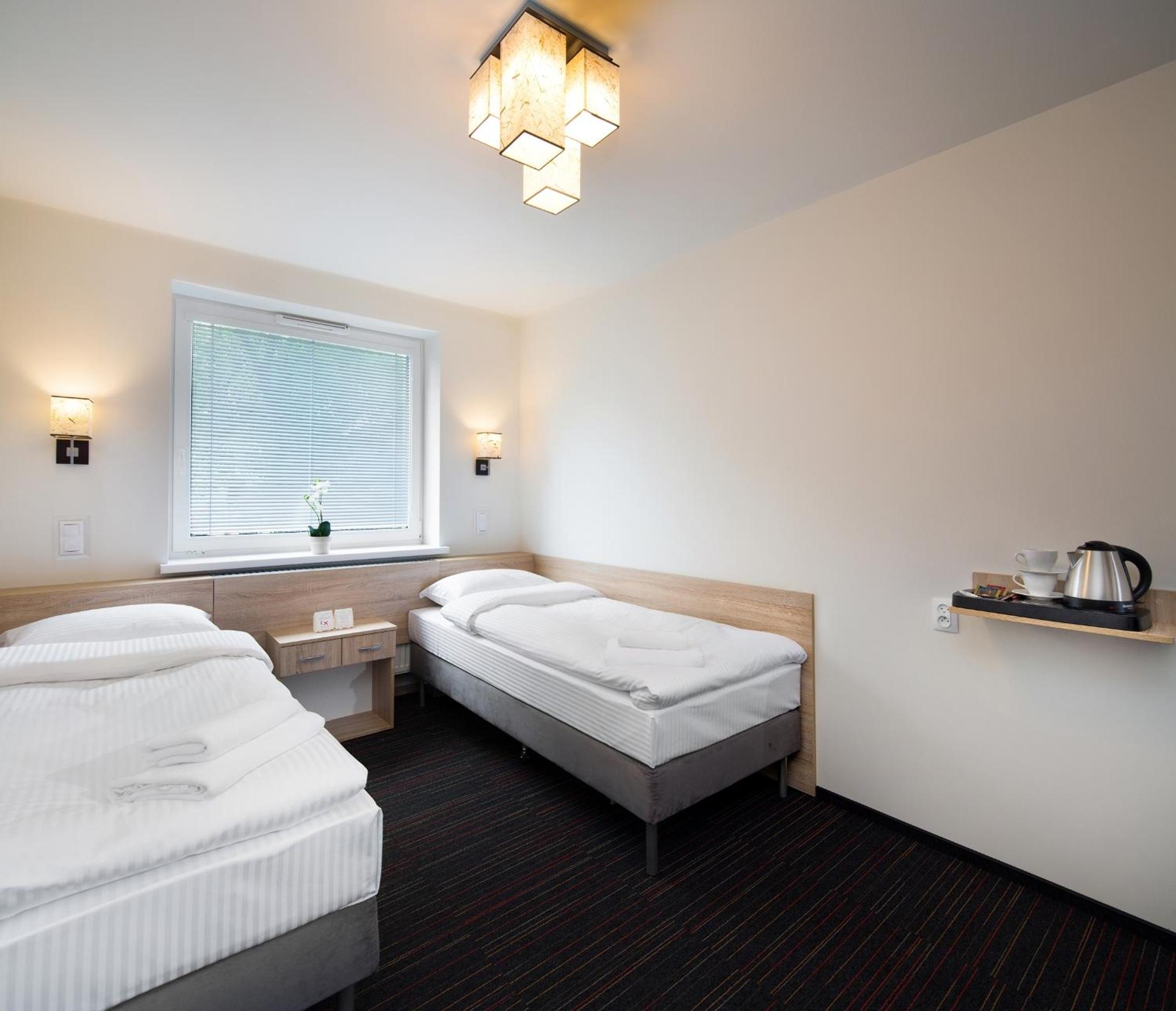 Az ágyak nem egymás mellett vannak, de így is volt hirdetve, illetve összetolhatóak. A szoba ablakán nem volt redőny, csak egy sötétítő, szóval aki erre érzékeny, az nem fog tudni vaksötétben aludni, mert a szomszédos telephely világítás bevilágít a szobába.