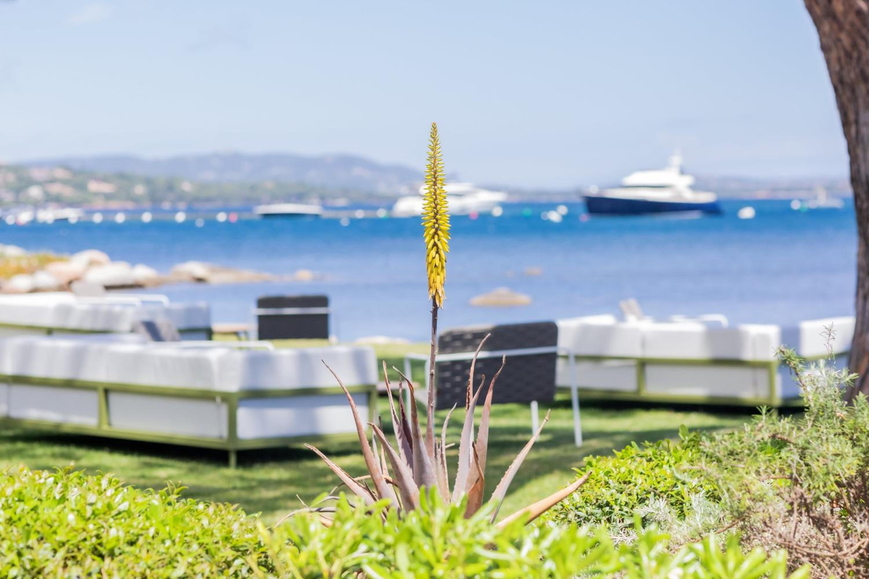 Enjoy the tranquility of our private beach and beautifully landscaped sea view-garden with pine and palm trees.