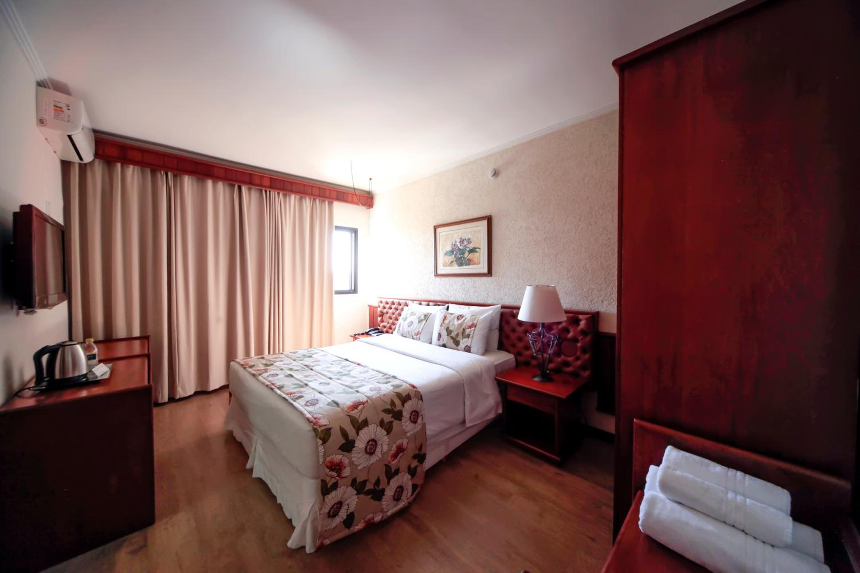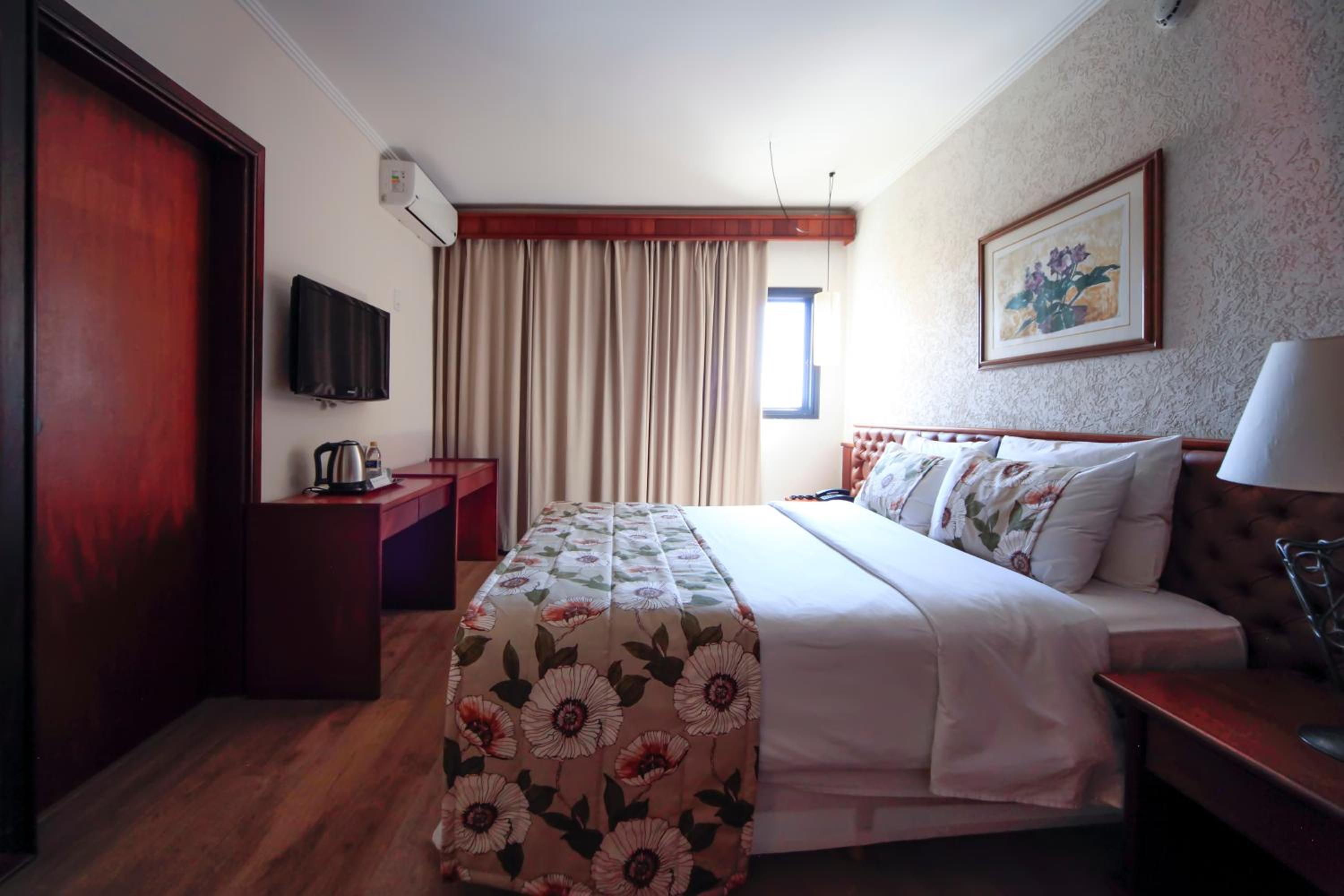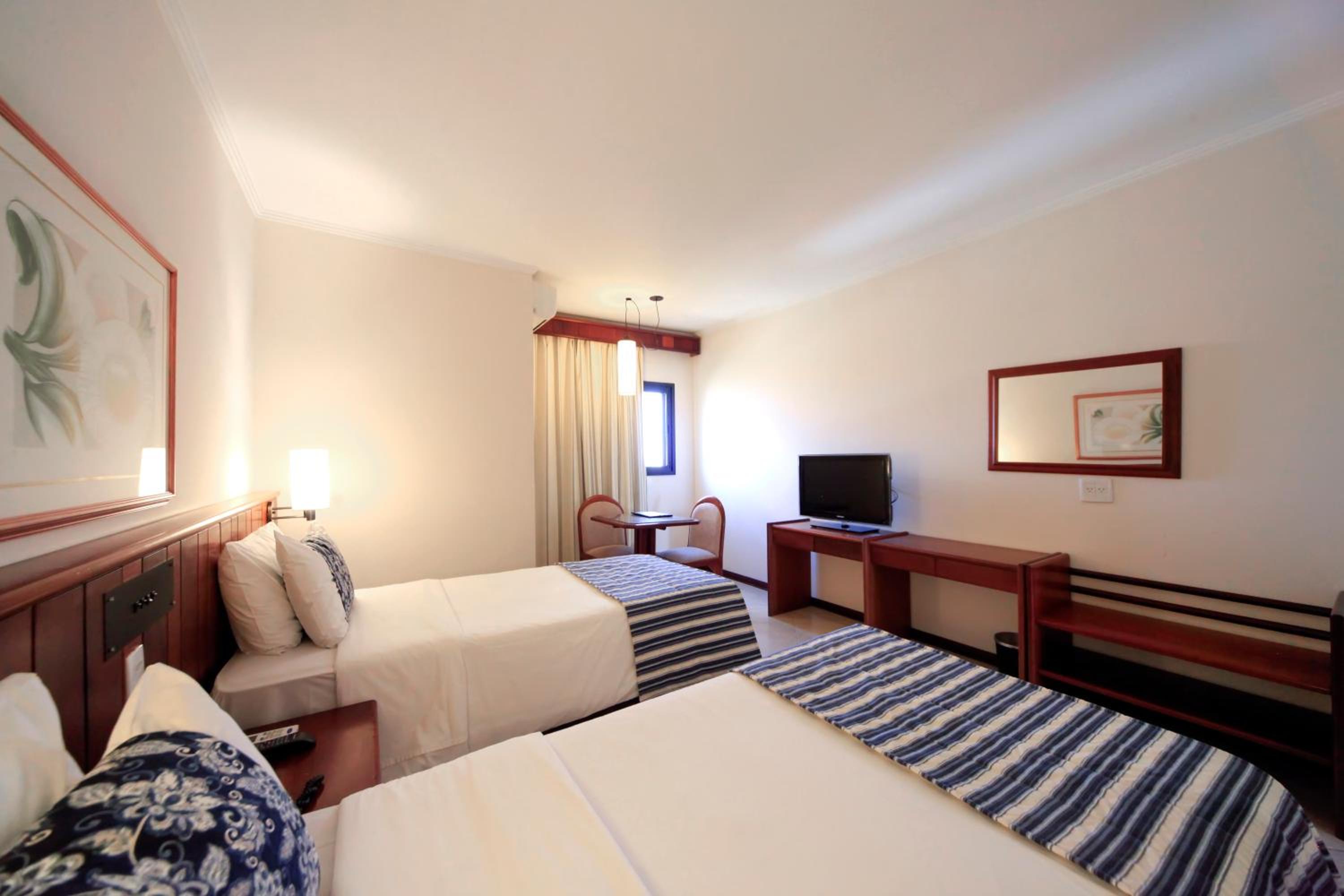 Experience comfort and convenience in every room at Sorocaba Park Hotel. From air conditioning to free WiFi, each room is equipped with modern facilities to ensure a pleasant stay. The neutral carpeted floors and colorful bedding add a touch of style to the accommodation.