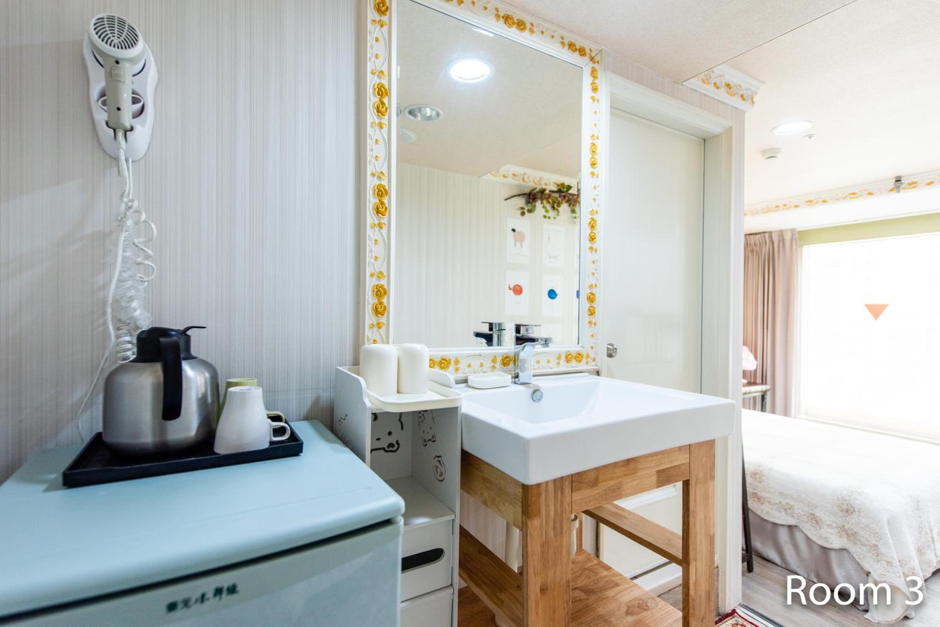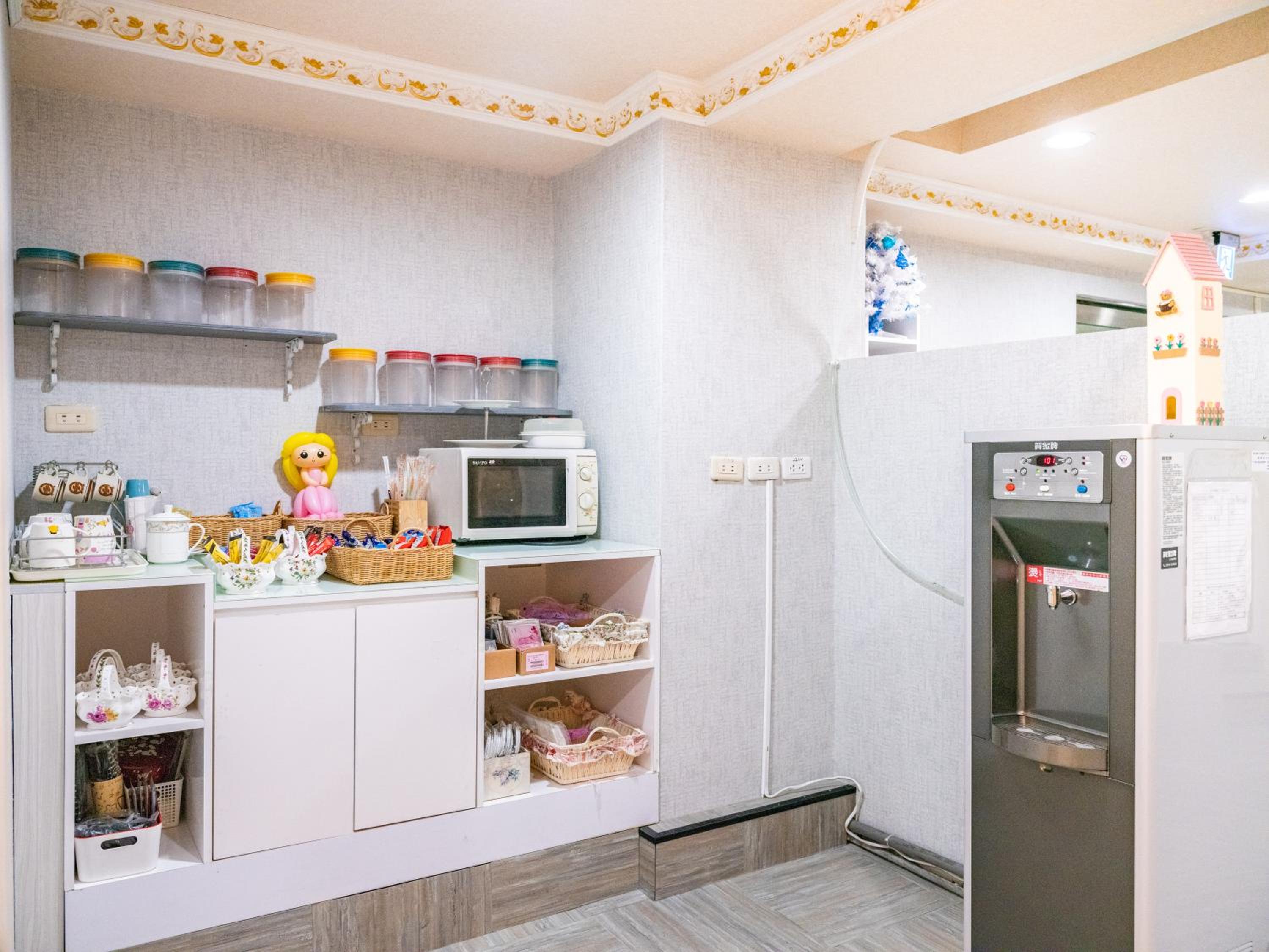 員工態度好,有免費小點心可以拿,共用也有飲水機微波爐小廚房冰箱,房間滿大的
