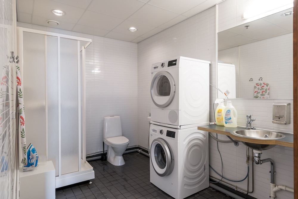 Prices are very reasonable in this hotel because they haven't any check-in services or breakfast there. You only get a key code by e-mail or by text message 30-60 minutes before your check-in time. A shared laundry room, a shared mini kitchen and a very large shared living room with three microwave ovens, many table groups and a coffee machine (with charge) are available.
