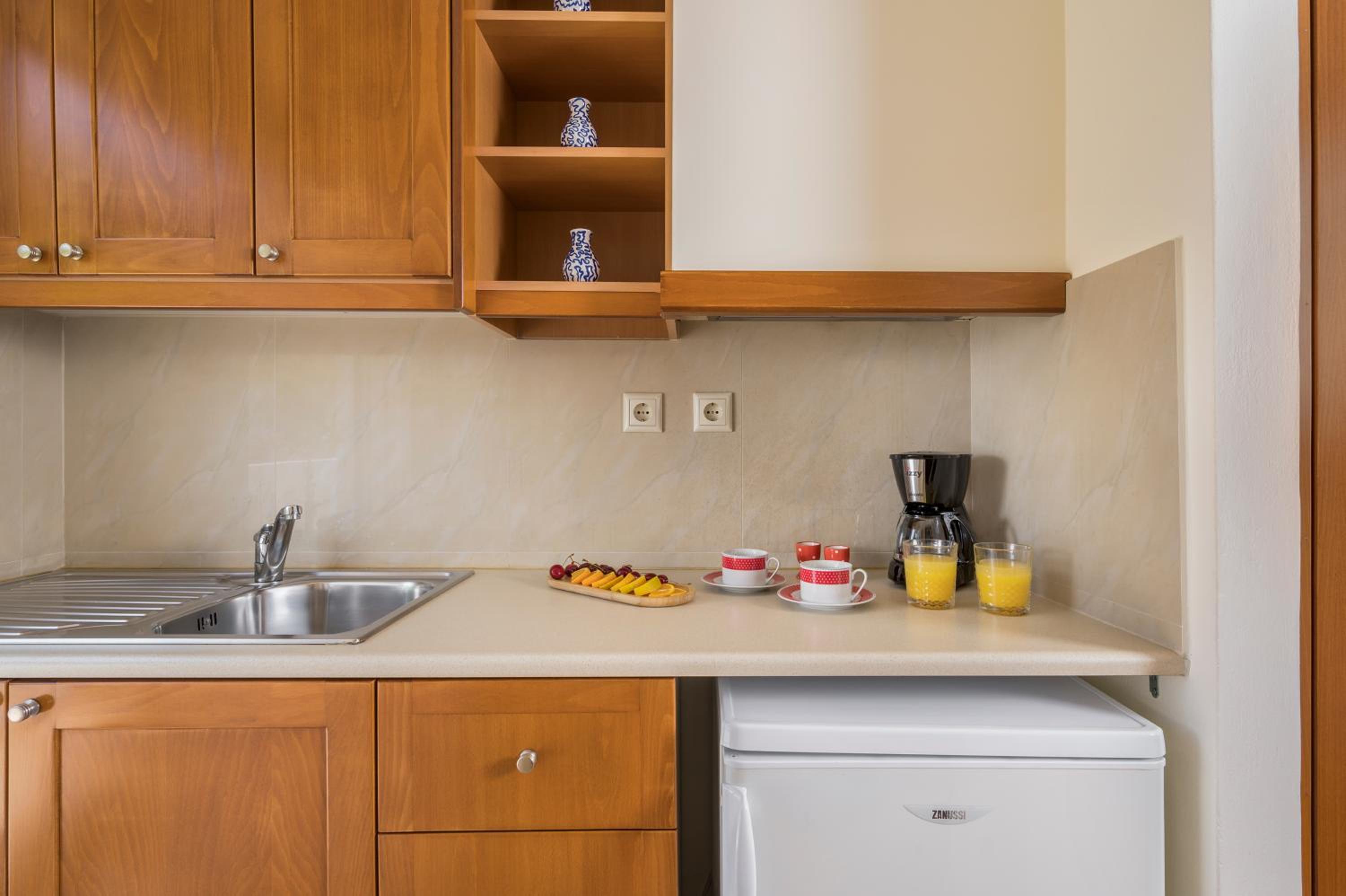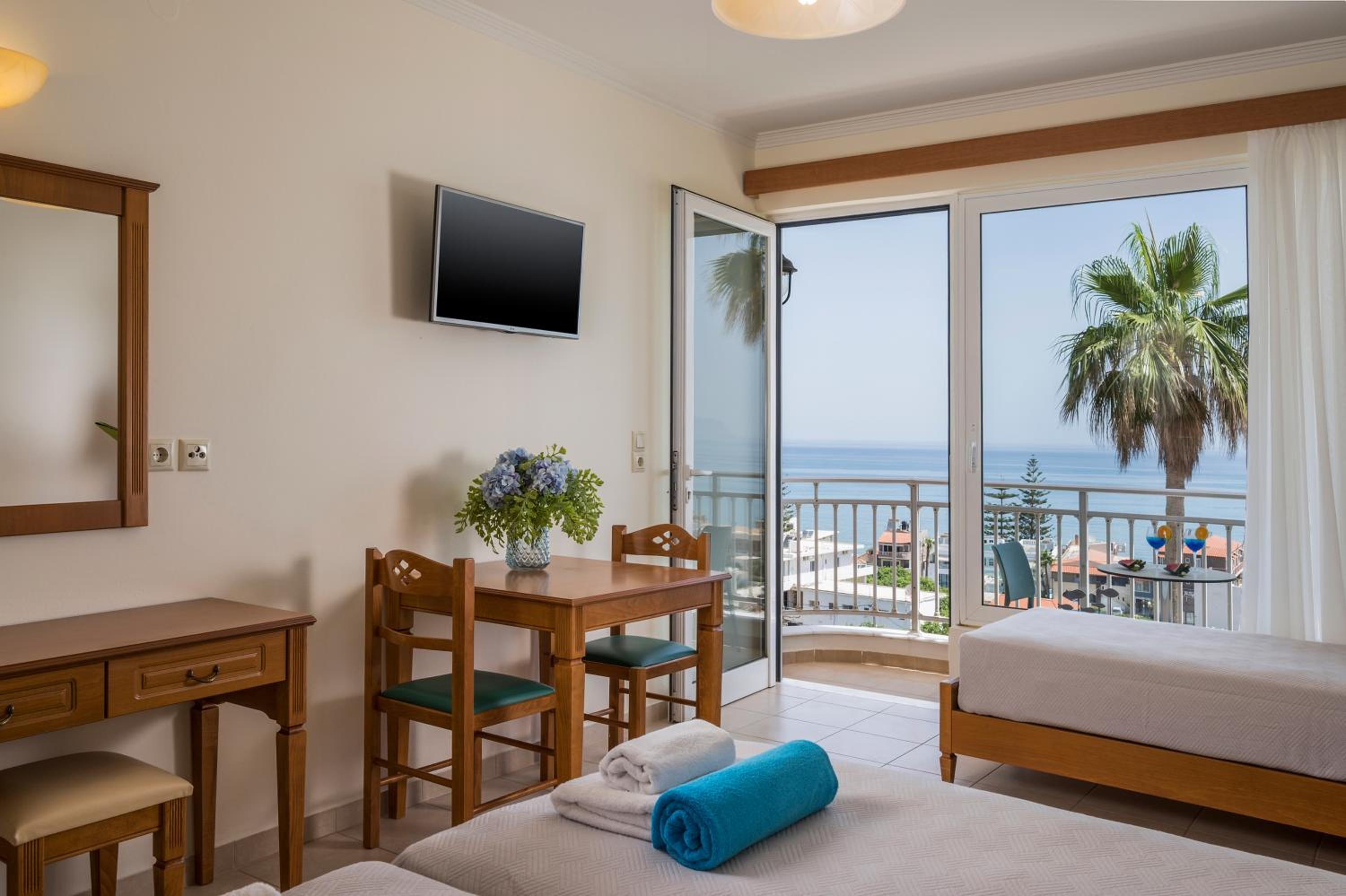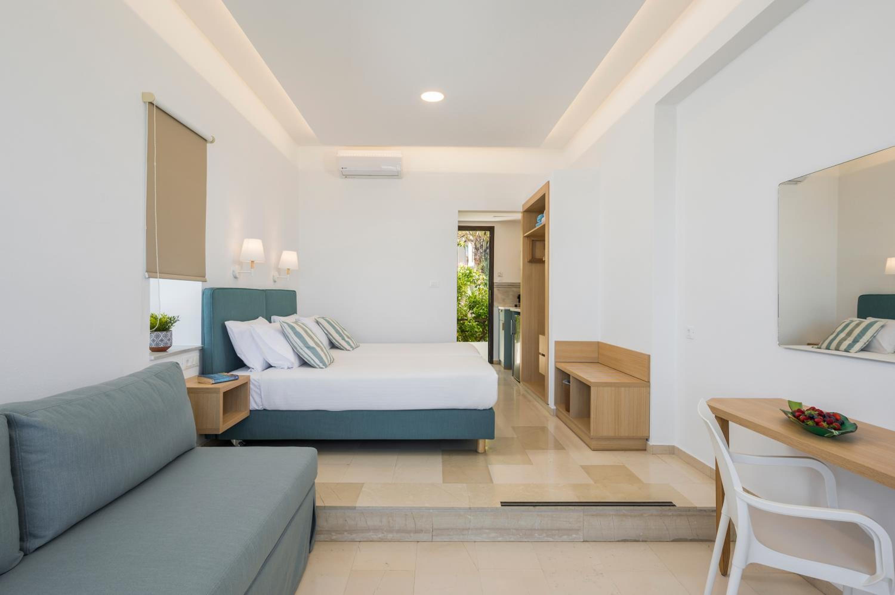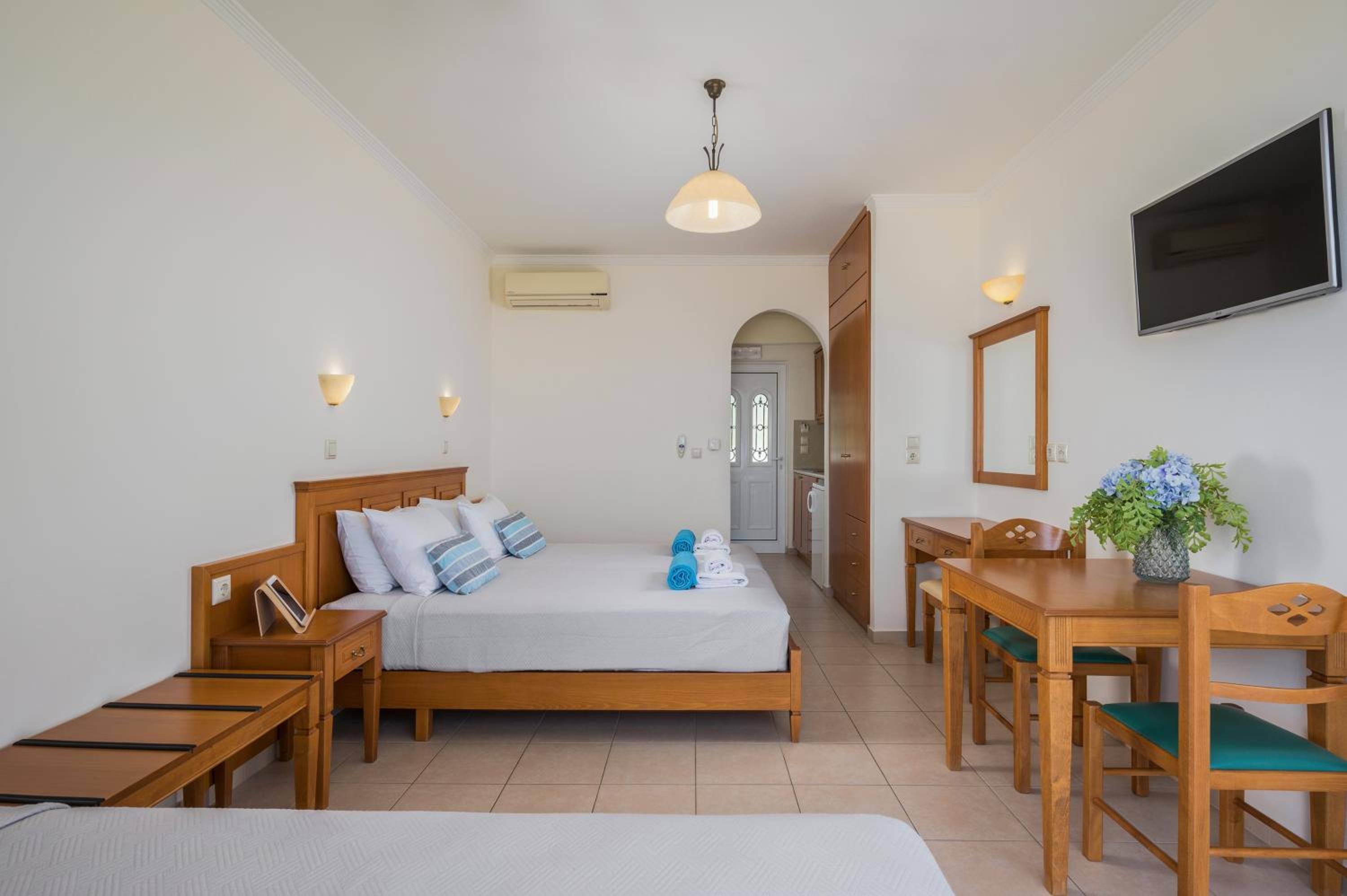 Clean and comfortable with a great view. Well equipped kitchenette. Really comfortable beds. Pool/beach towels provided. Water, coffee & tea provided on arrival. Air con very efficient. All staff exceedingly helpful and friendly.