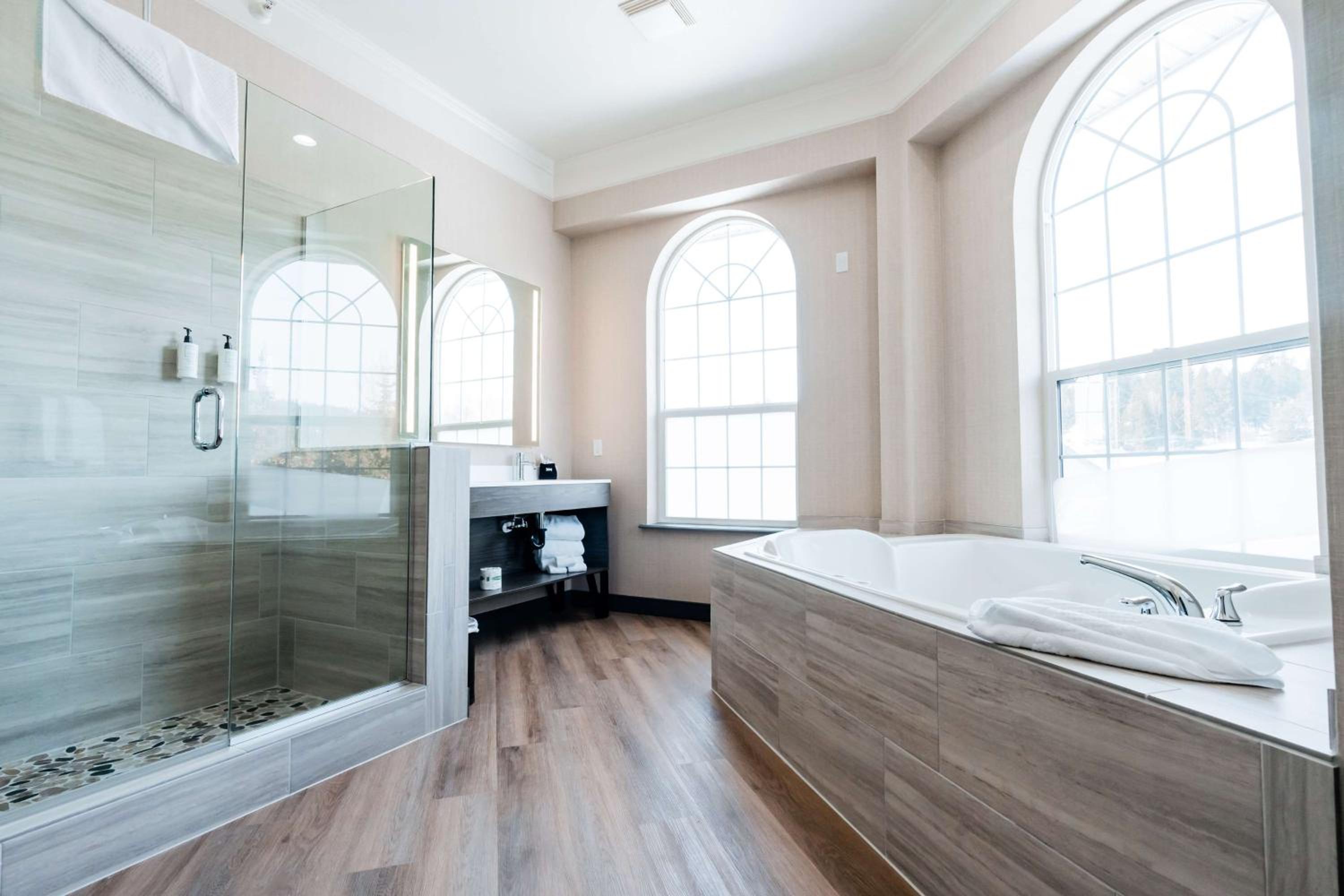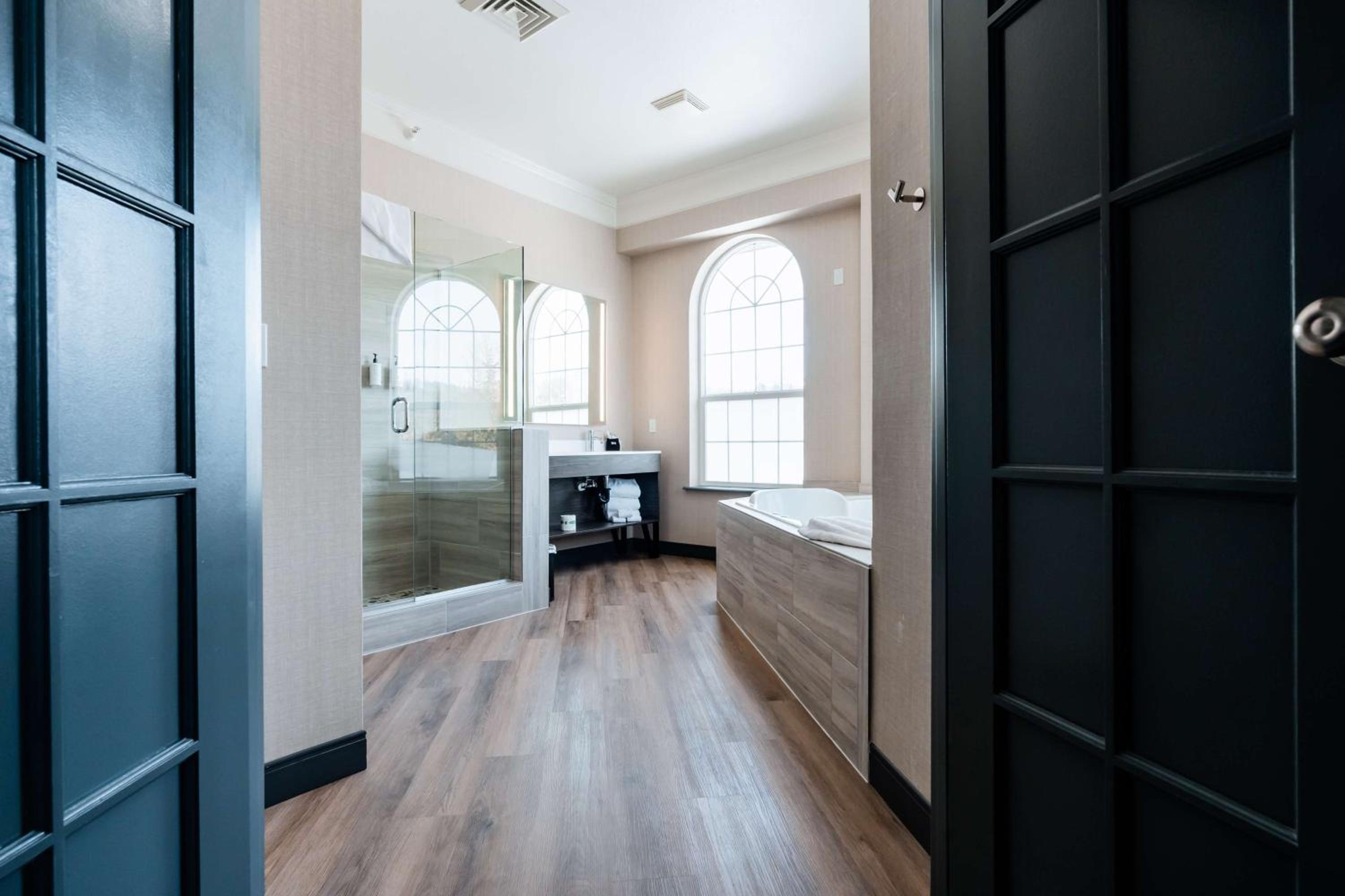Relax in style with elegantly decorated rooms featuring fireplaces and bay windows. Unwind in the indoor heated pool and hot tub, or enjoy modern conveniences like free Wi-Fi, cable TV, and DVD player in every room.