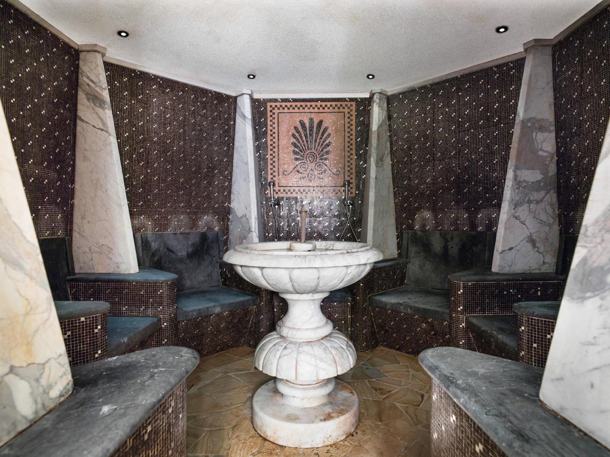 Die Mosaiksteine am Boden sind abgeplatzt, der Putz von den Wänden bröckelt ab und die Stufen und Sitzbänke im wirlpool sind rau und scharfkantig.