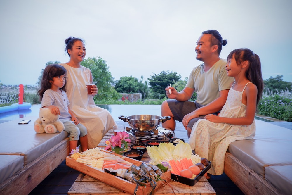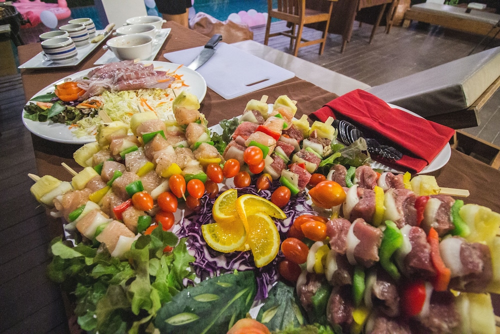 酒店可代訂bbq食物種類齊全。海鮮 肉類 串燒 炒飯足夠7人份量。酒店位置其實不是十分偏僻 ,當然最好是自己渣車。酒店不到1分鐘有7 11 fmaily mart等等便利店。門口亦有地道咖啡同食物選擇。酒店服務良好 員工有禮貌