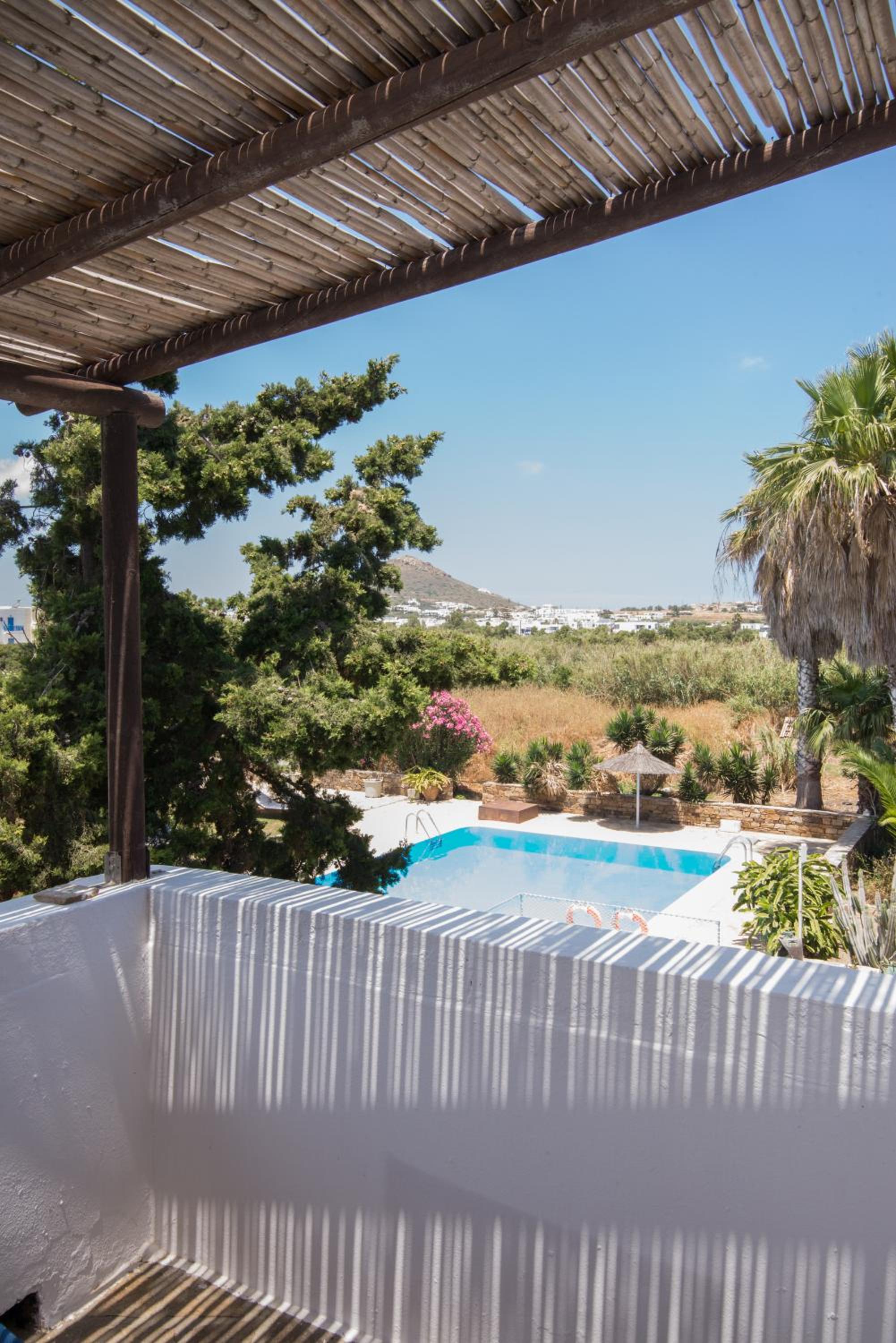 Swimming Pool and Garden Oasis: Relax in the tranquil setting of Antonina Hotel, surrounded by palm trees and bougainvilleas. Lounge by the swimming pool on the stone-paved terrace, complete with sun beds and umbrellas for your comfort.