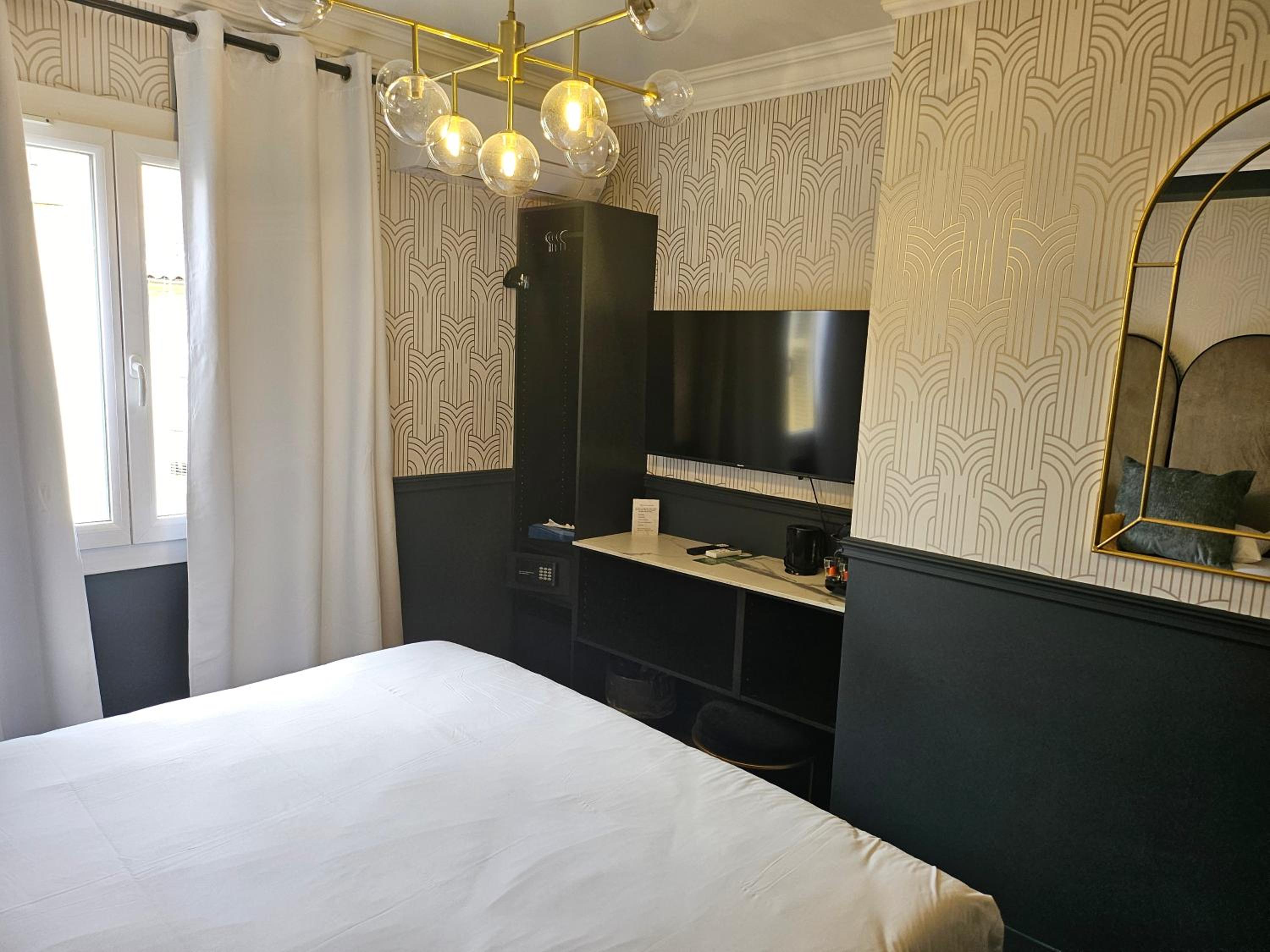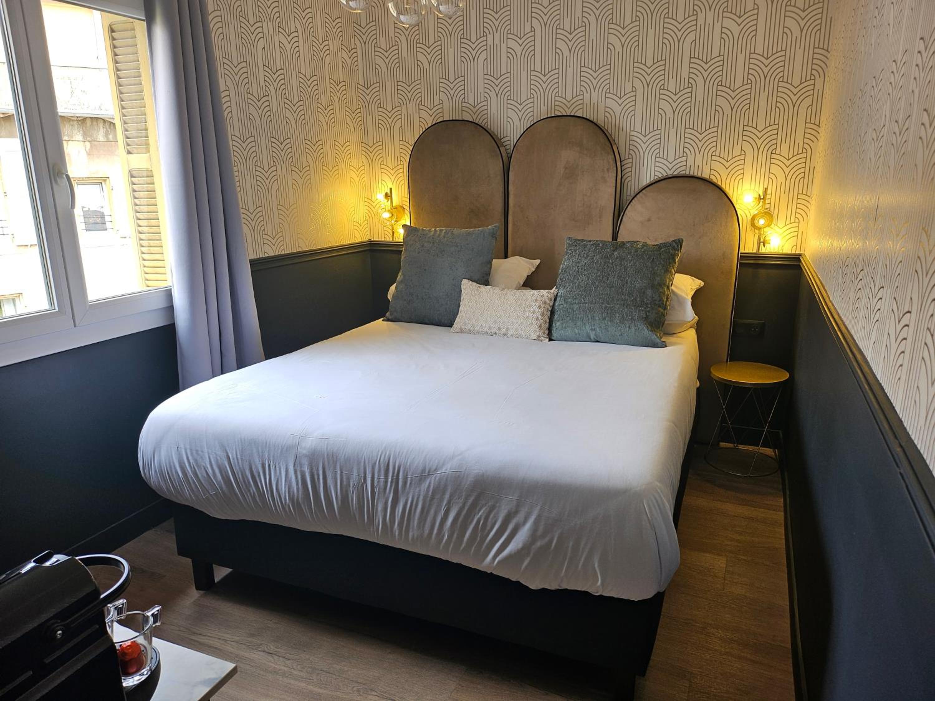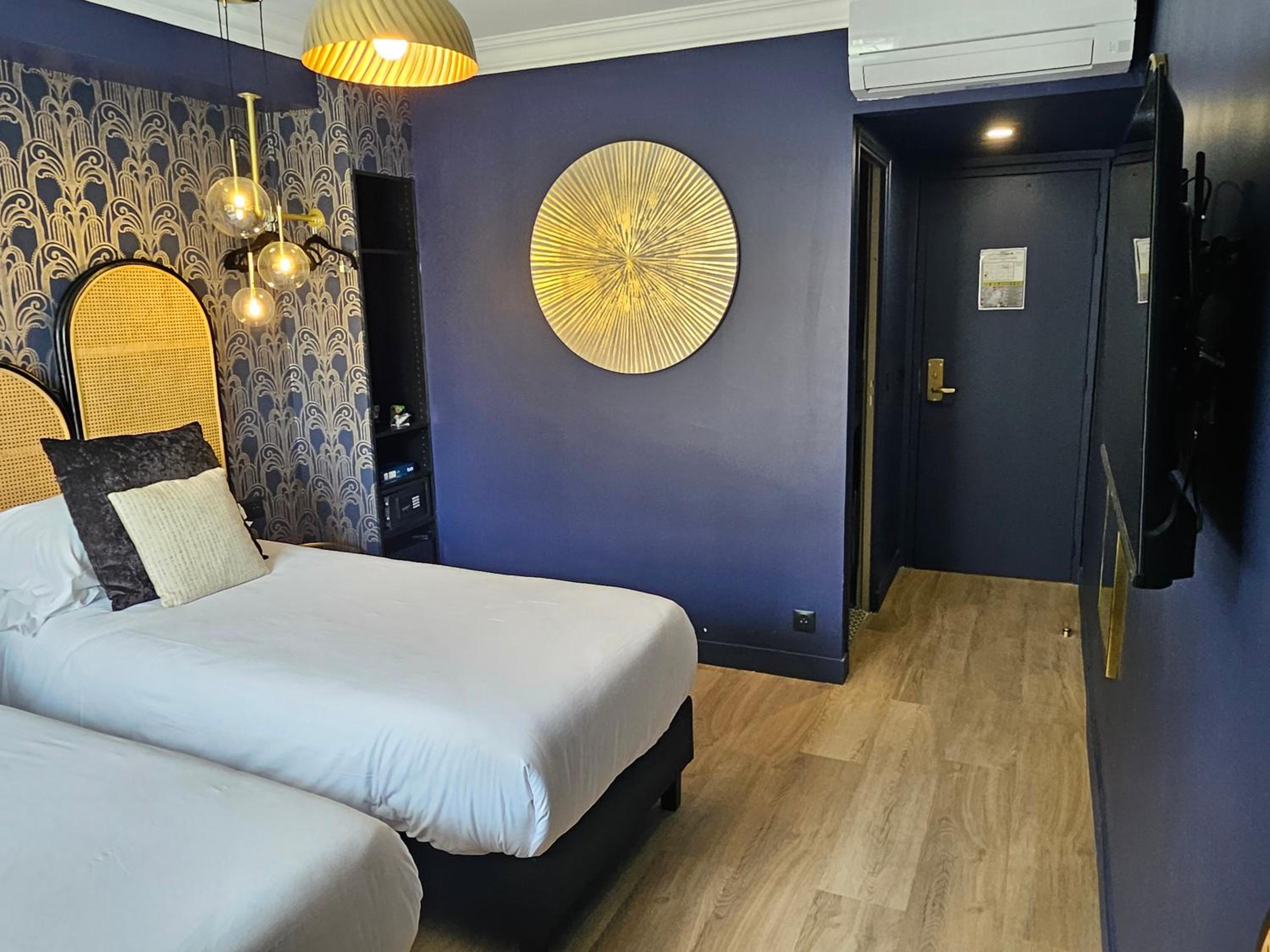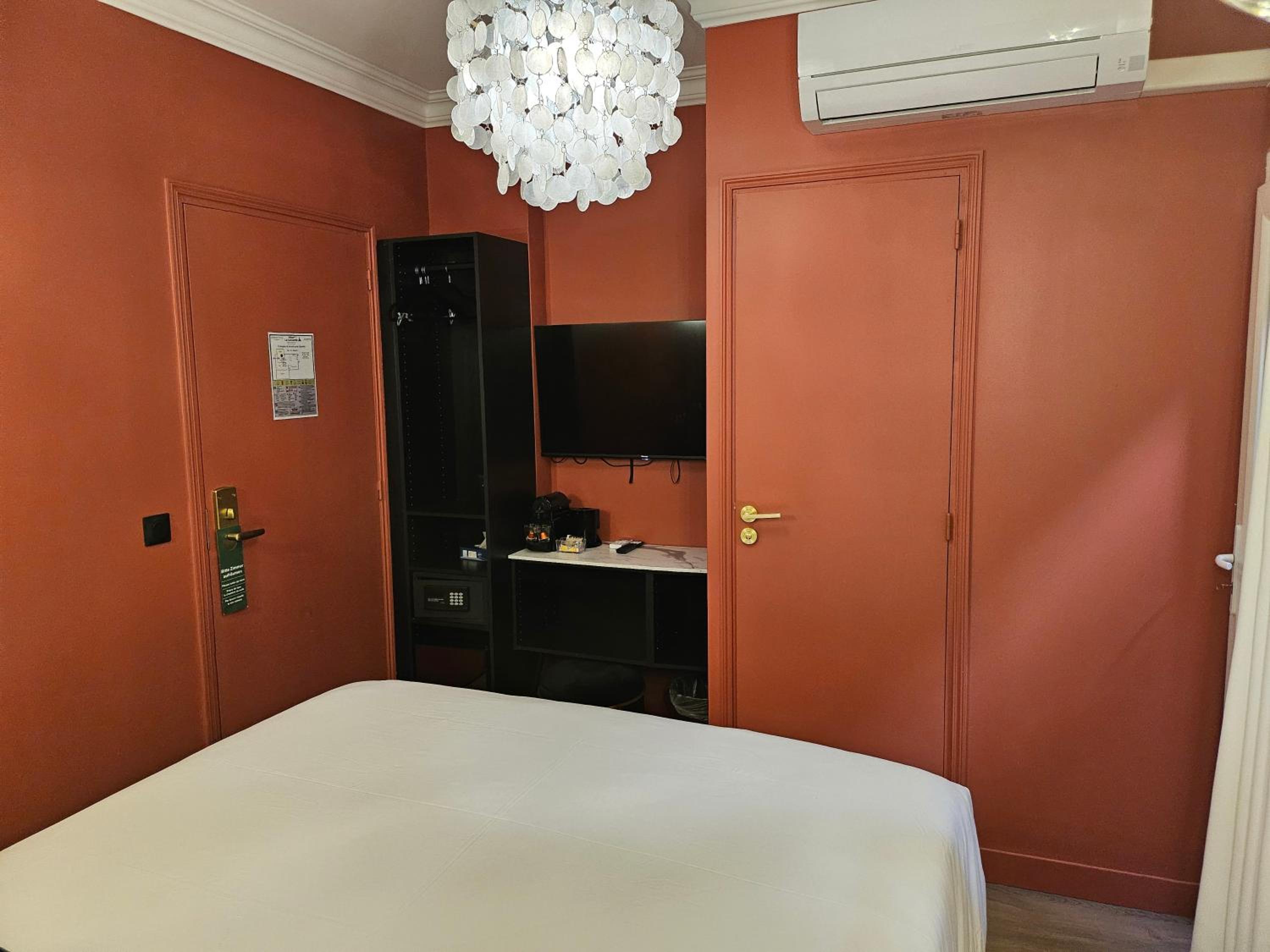 deco agréable et bonne machine à café style nespresso à disposition dans la chambre. très jolie salle d’eau (étroite..faut pas être large sinon on passe pas de face). bonne literie et chambre propre. assez silencieux et j’ai passé une bonne nuit.