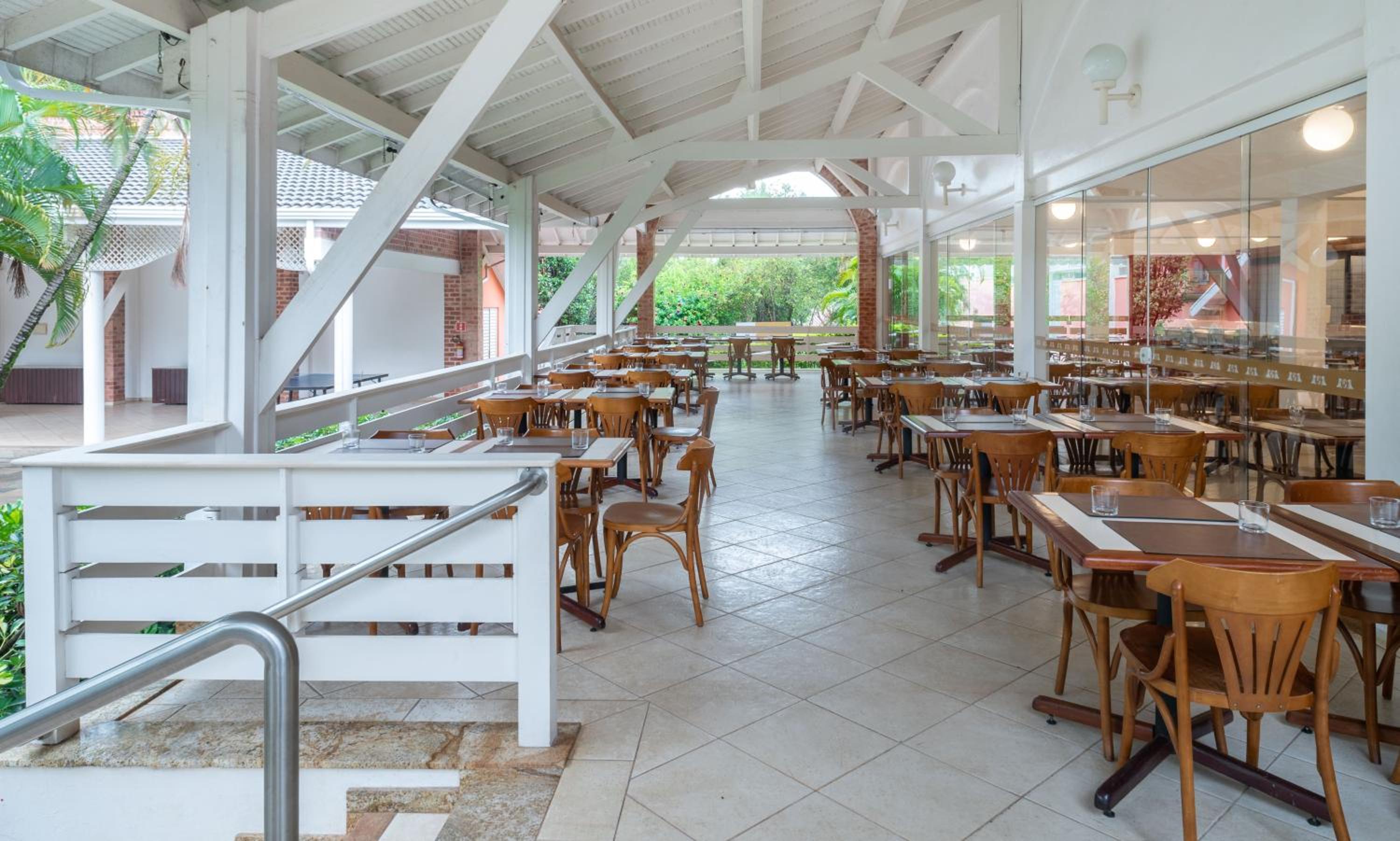 A localização, as instalações (amplos espaços, jardins e piscinas) que permitem lazer sem manter o hóspede preso no quarto).