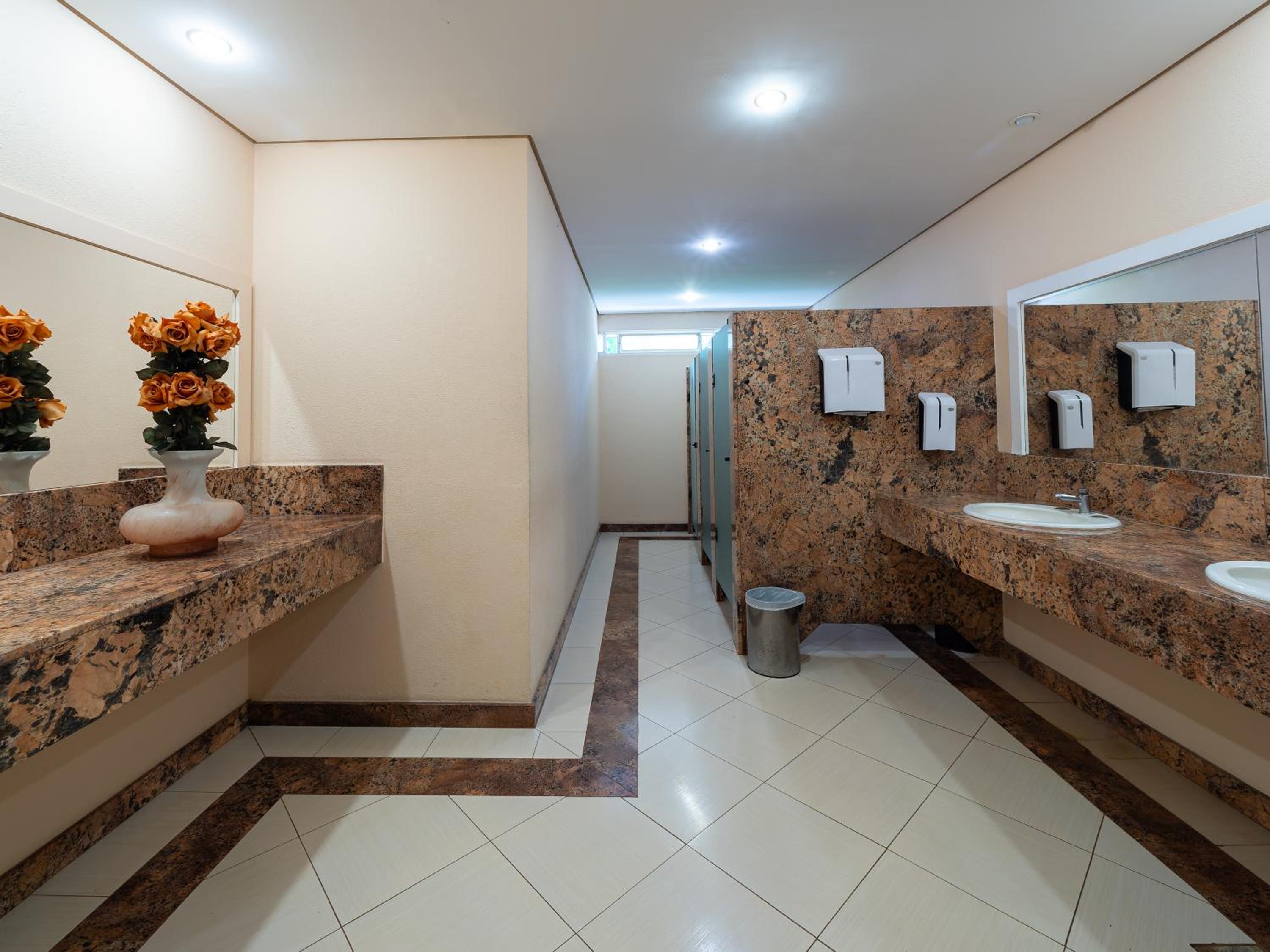 Banheiros não muito limpos e com torneiras estragadas.