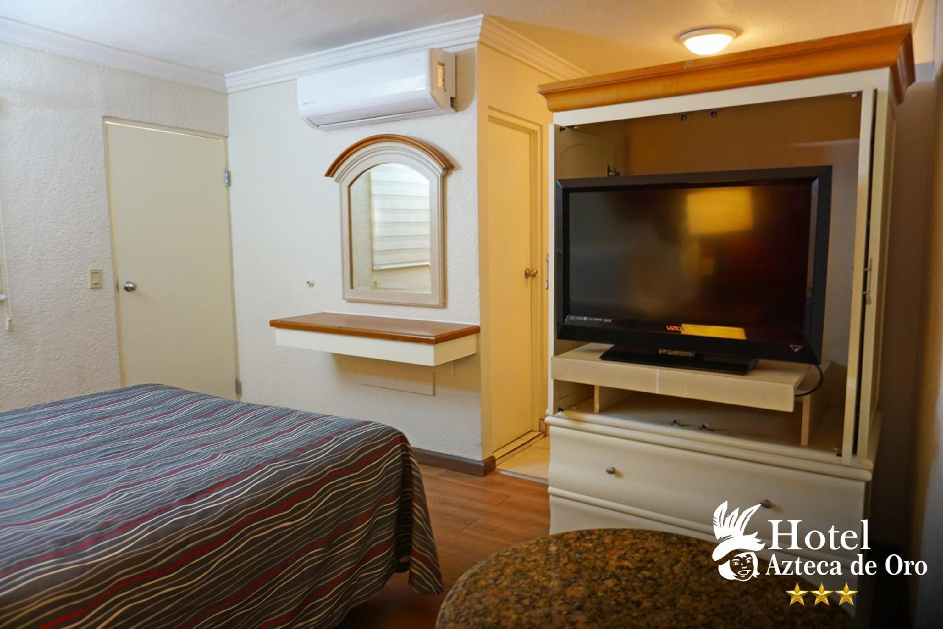 Each room at Azteca de Oro Mexicali Hotel features modern amenities such as air conditioning, a flat-screen TV with satellite channels, and a private bathroom with a shower. Enjoy a comfortable stay in well-equipped rooms.