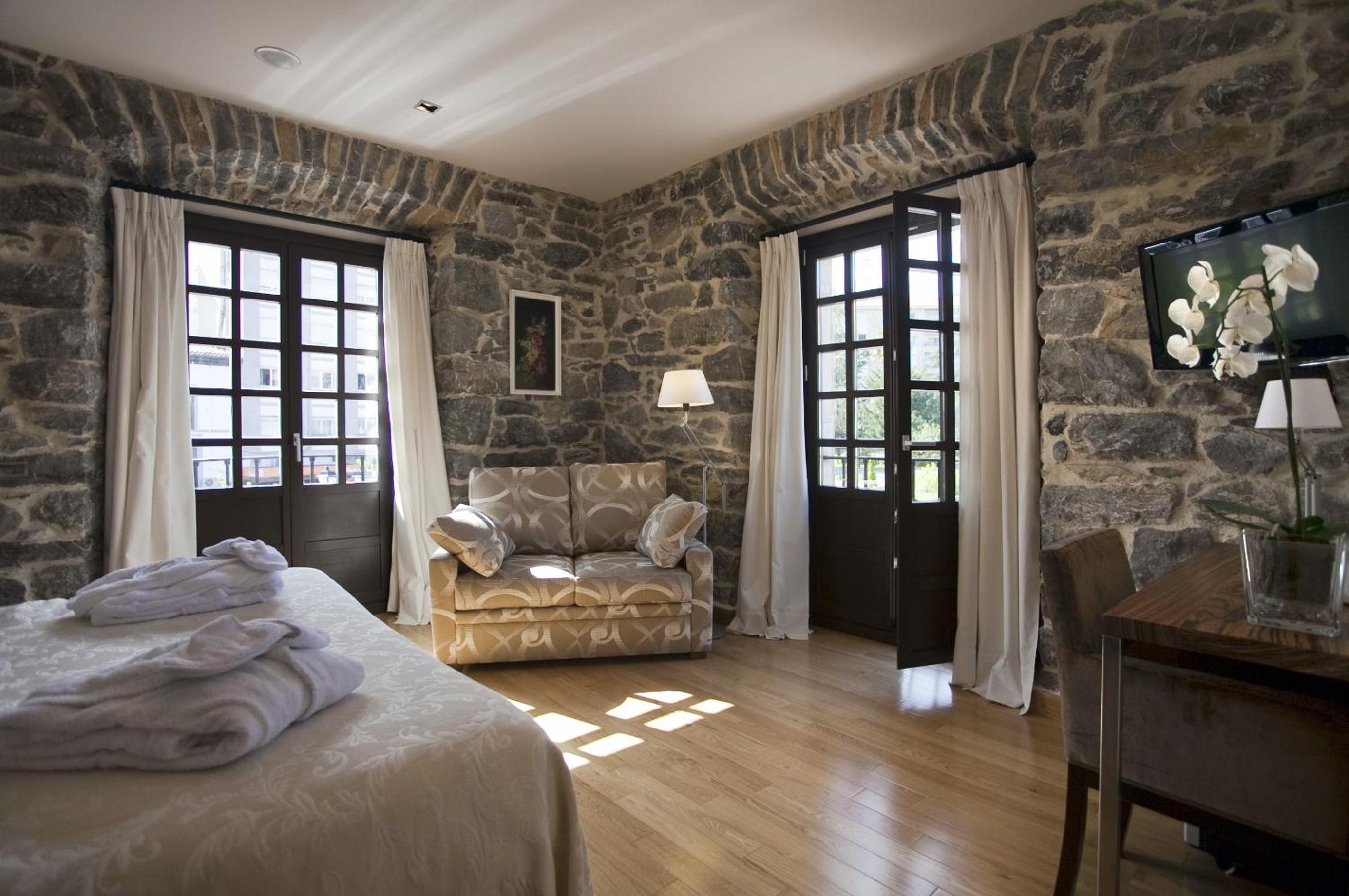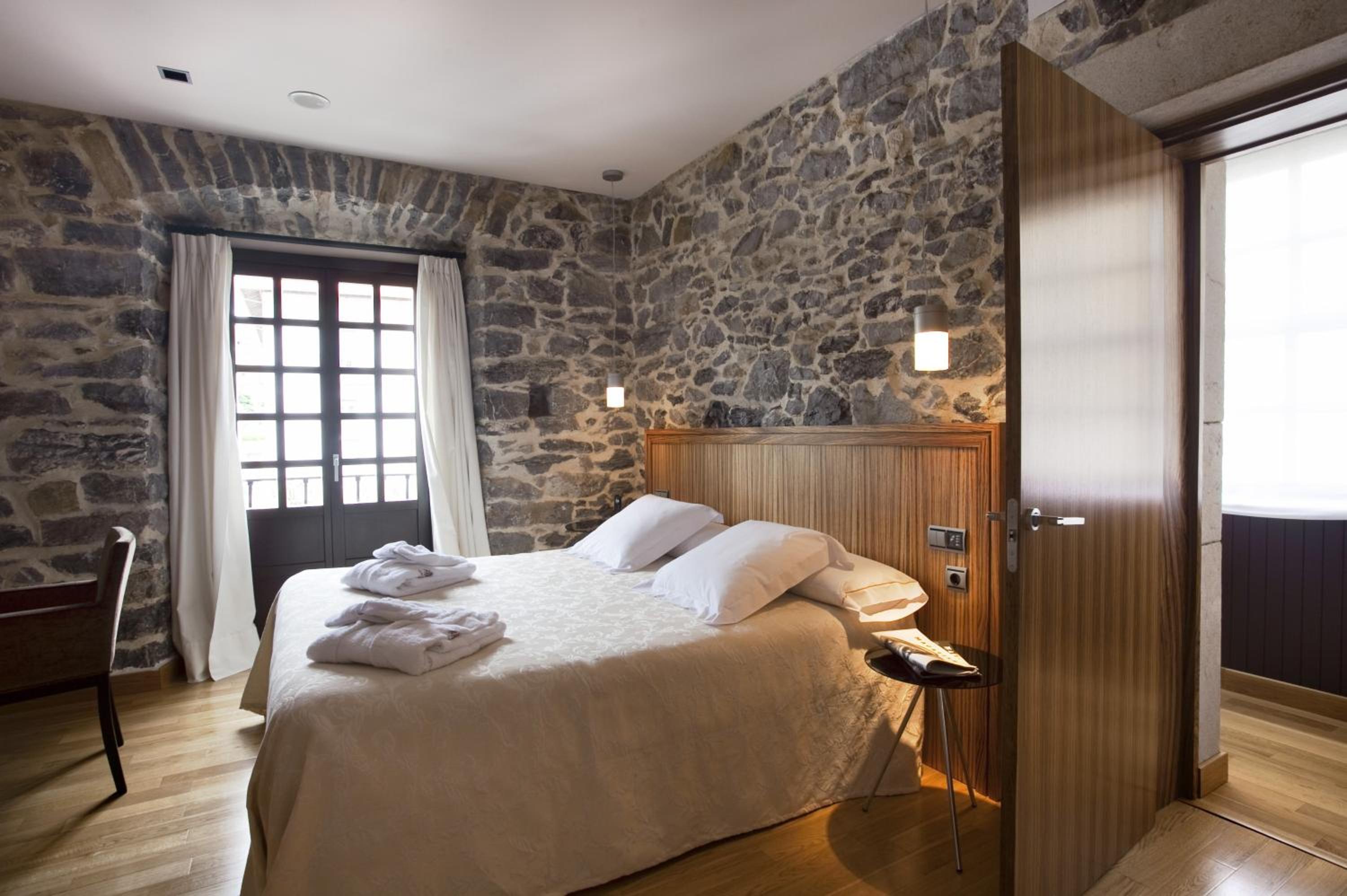 The Antiguo Casino Hotel in Pravia seamlessly blends historic stone walls and wooden galleries with elegant modern design, offering a unique and charming stay.