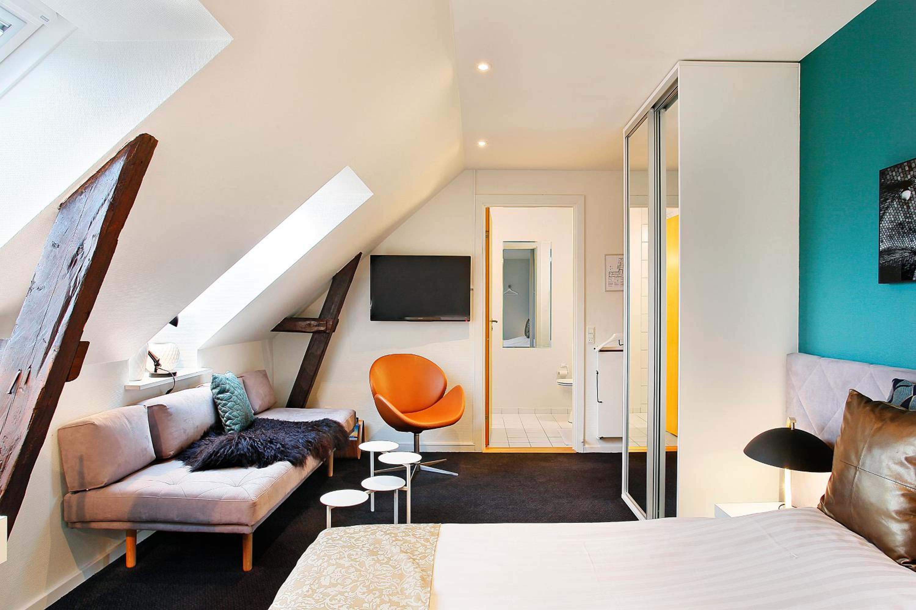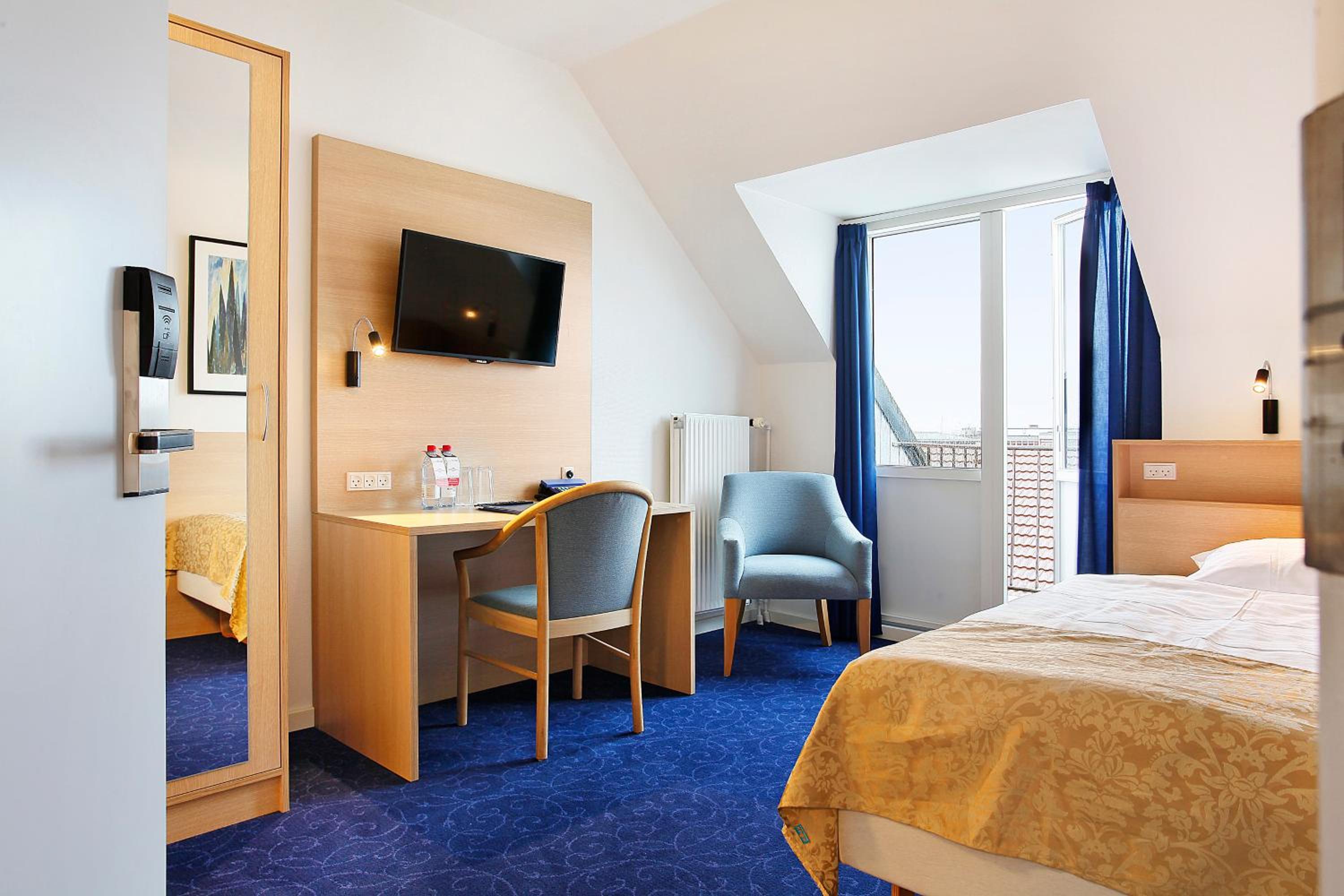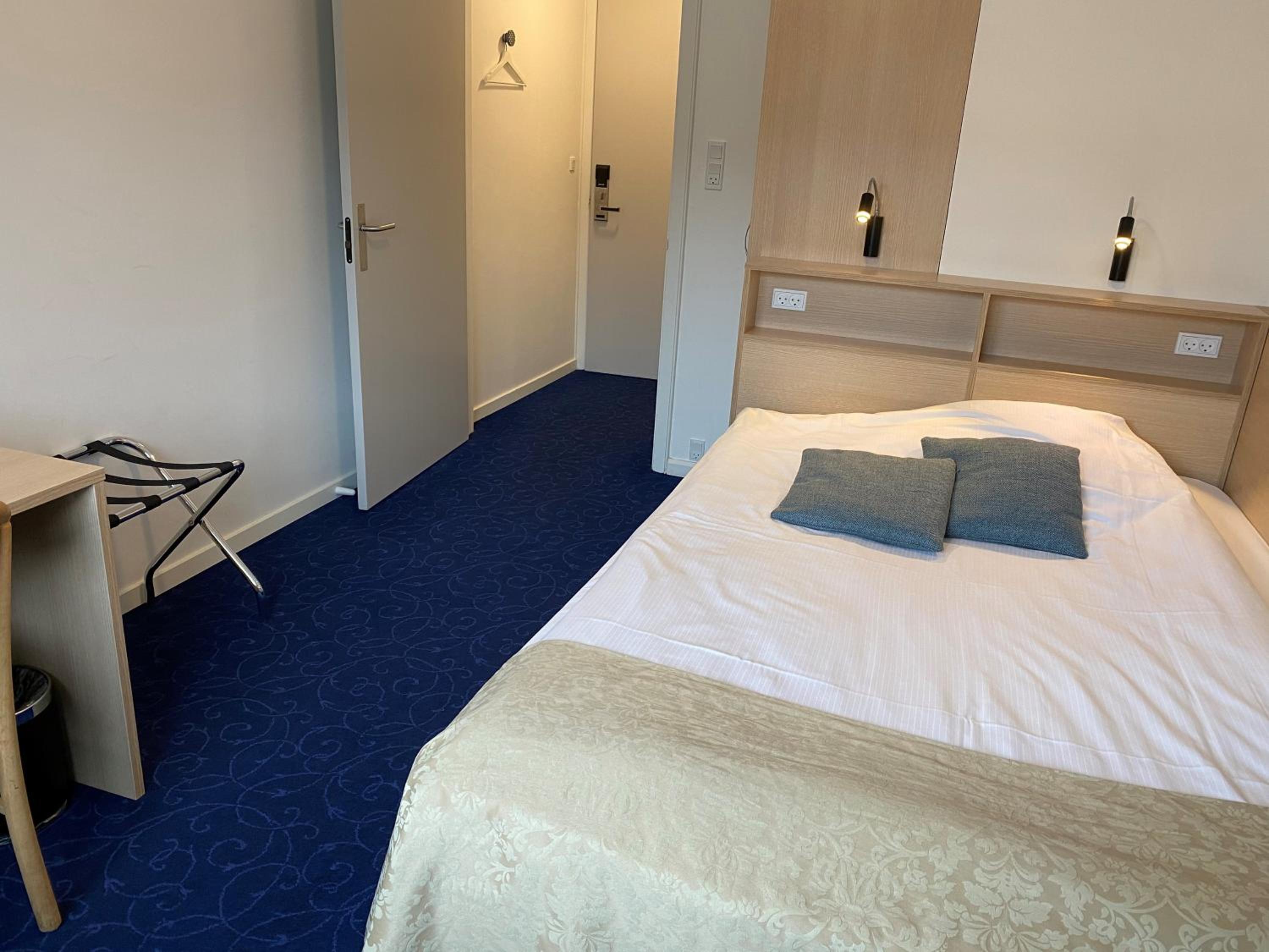 The guest rooms at Herning City Hotel are designed for comfort and convenience, featuring a flat-screen TV, work desk, and private bathroom. The simple decor creates a relaxing atmosphere for guests to unwind after a busy day.