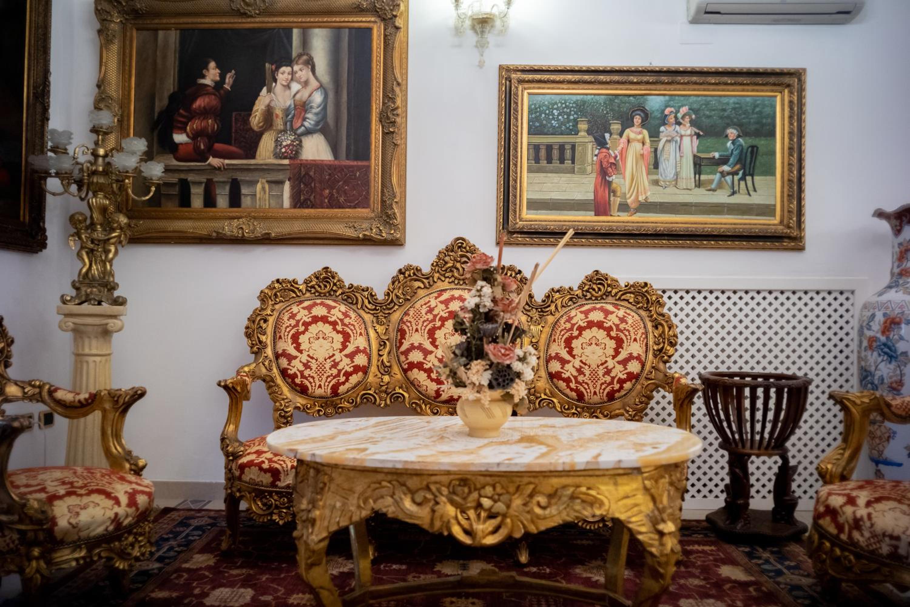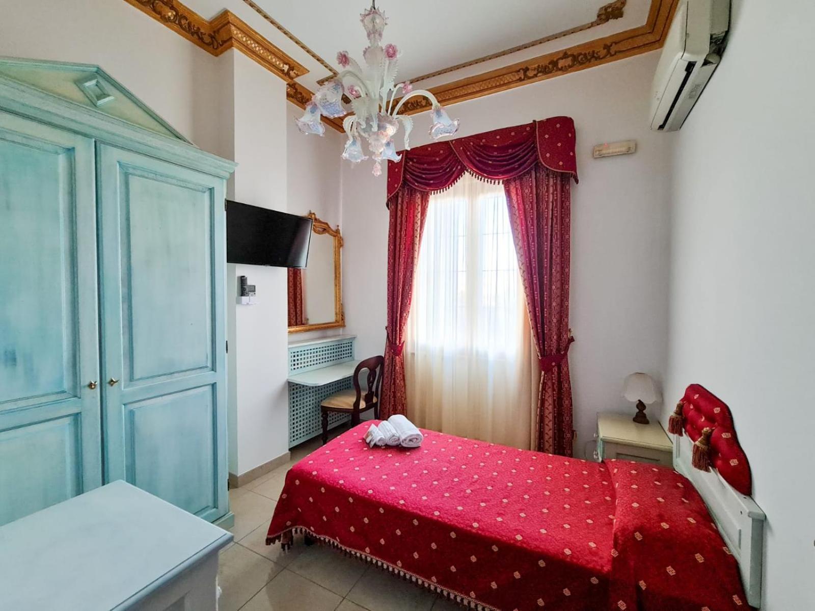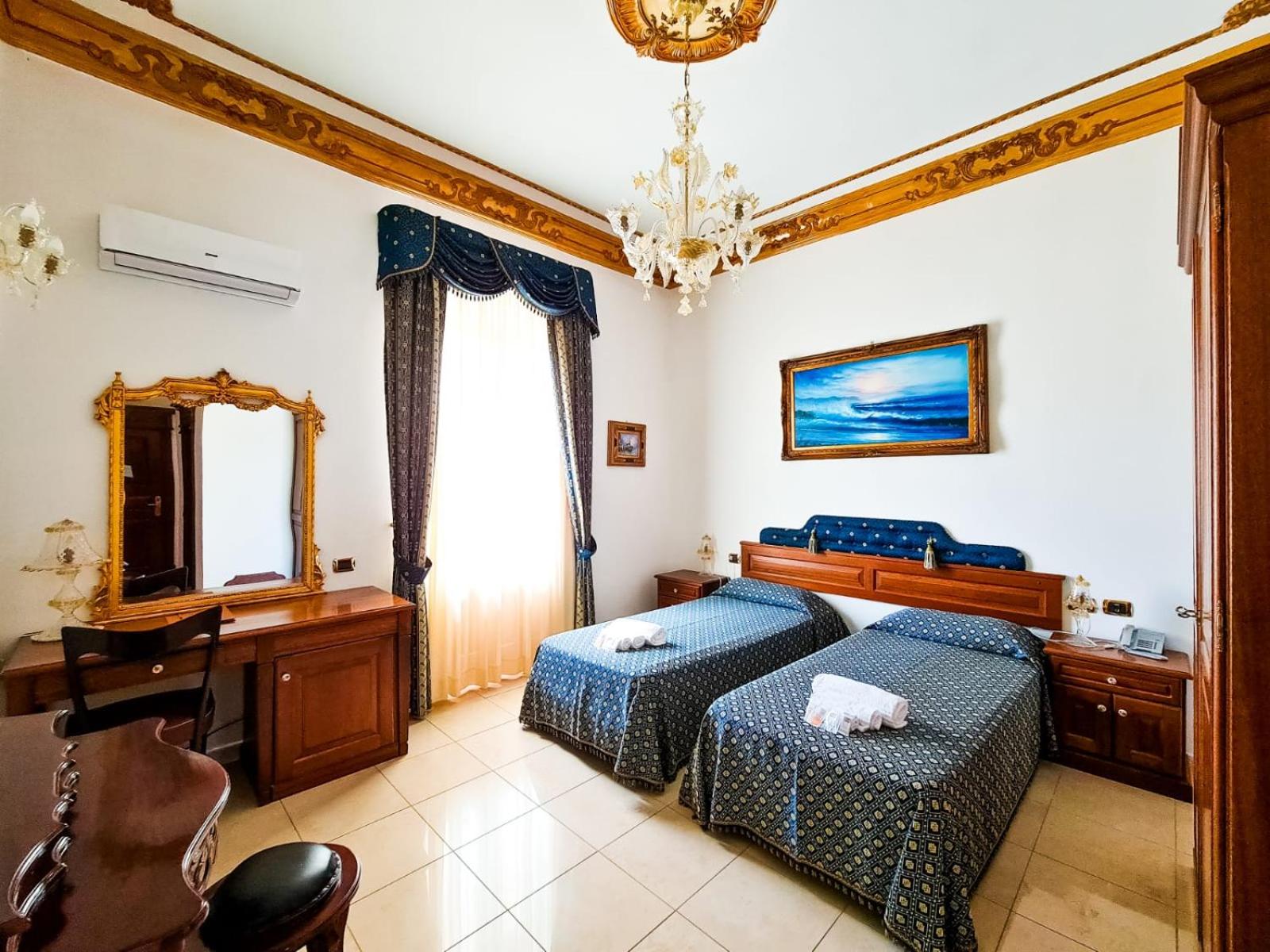 The town of Iglesias is an approximate 2-hour drive from the Sardinian capital on the west coast. The choices are somewhat limited in this town; the reviews of prior guests helped us in our choice. This area of Sardinia is essentially in a state of hibernation in March a non-tourist month on the island. The hotel was built in originally as a private home, owned apparently by lawyers during the heyday of the local mining industry. The property was bought by an interested local investor and lover of Late Broque-Rococo style décor. Legend has it that he scouted through- out Italy for the original furnishing that met his criteria. Be prepared for a visual treat. The floors are of beautiful polished marble, the woodwork throughout is of high quality. Our room’s chandelier was Morano glass…think the Italian version of Tiffany. The ceiling crown molding is real ceramic, a testimony to the high level of detail throughout the hotel.