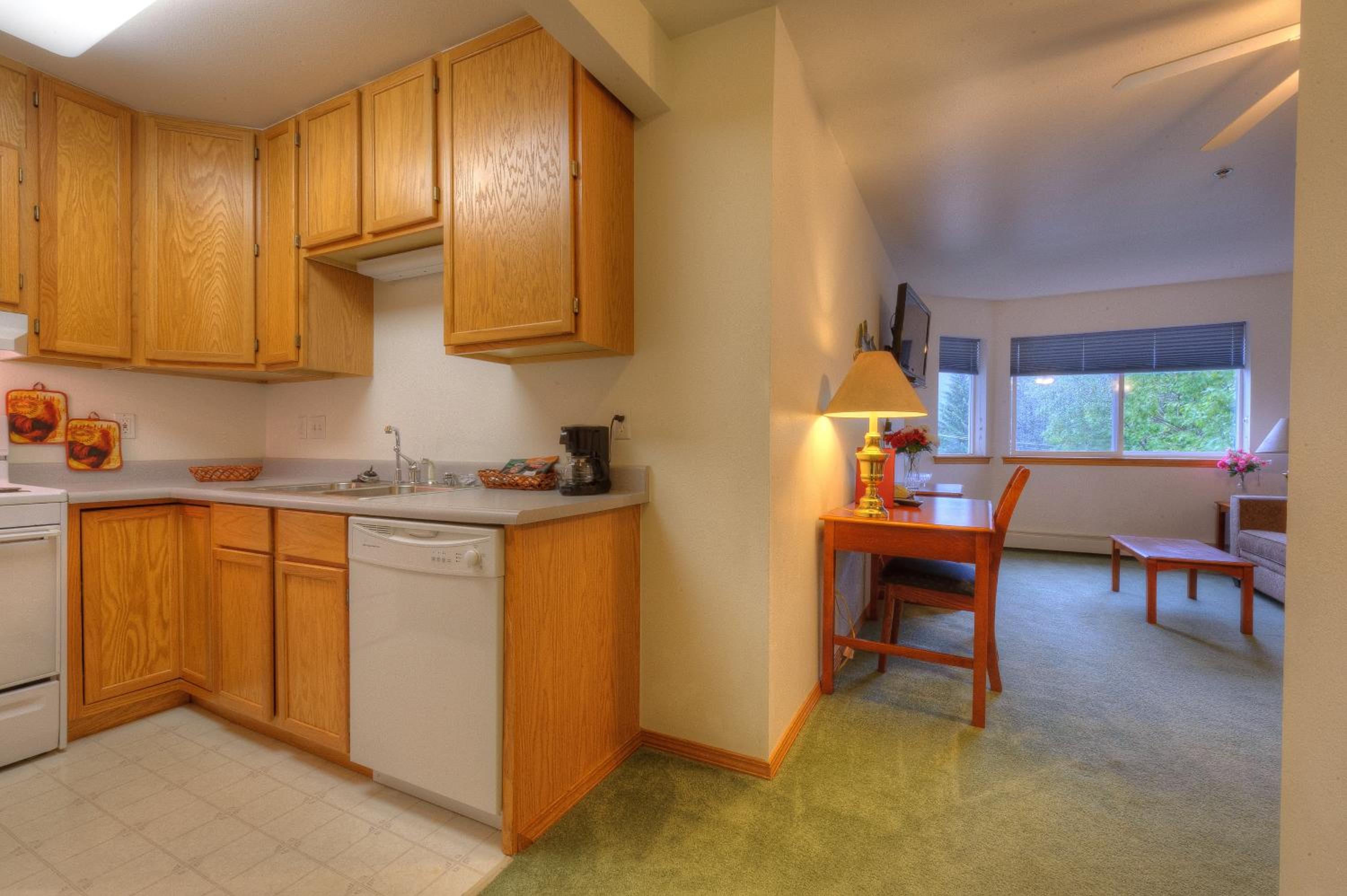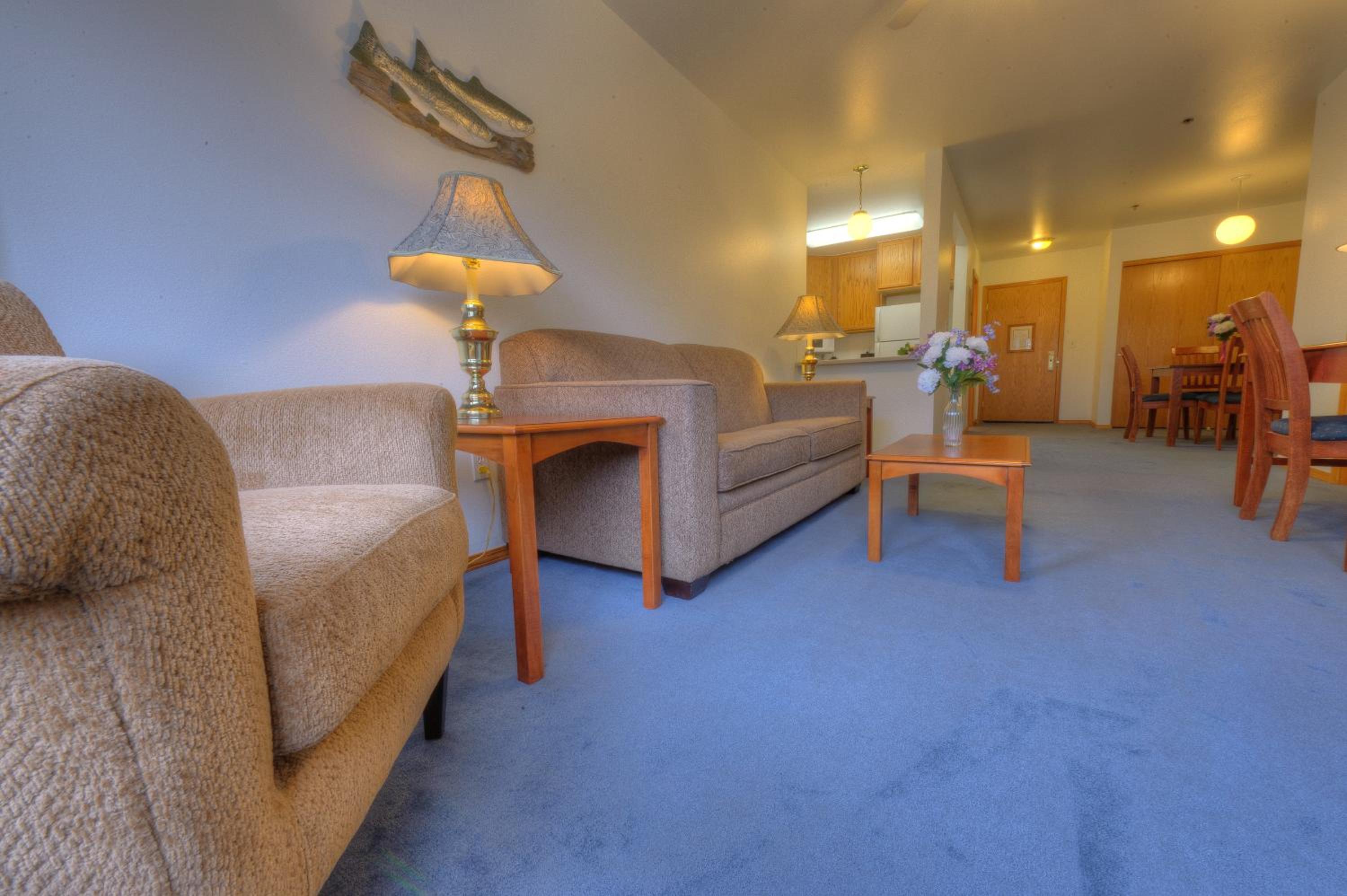 Experience comfort and convenience at Frontier Suites Hotel in Juneau. Each room is elegantly furnished with a full kitchen and work desk, providing the perfect blend of functionality and style.