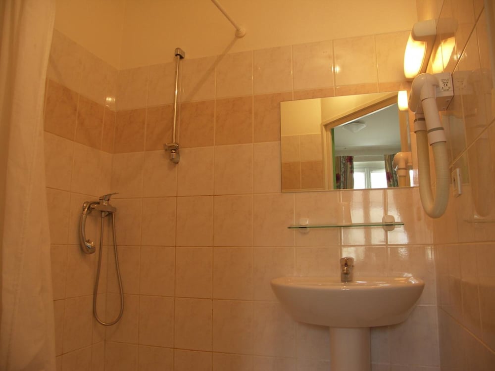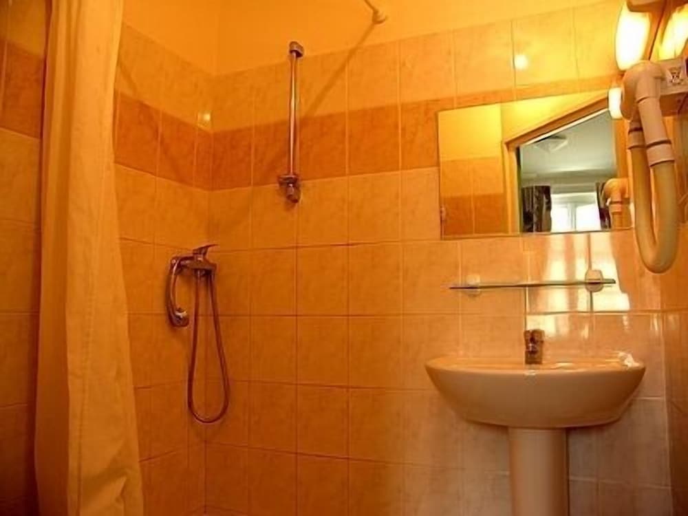 Décoration vieillotte et défraîchie, chambre petite, douche avec rideau sale