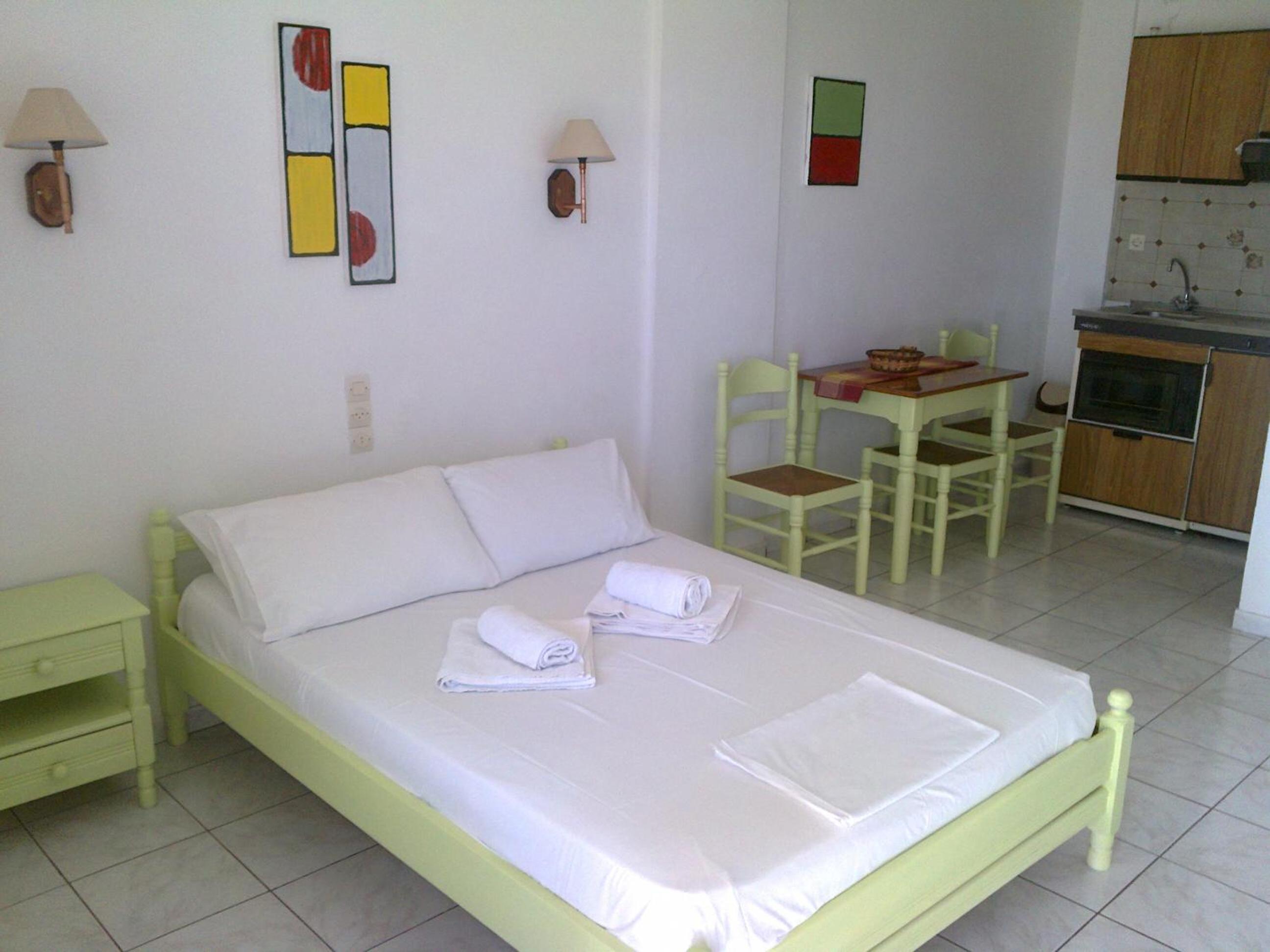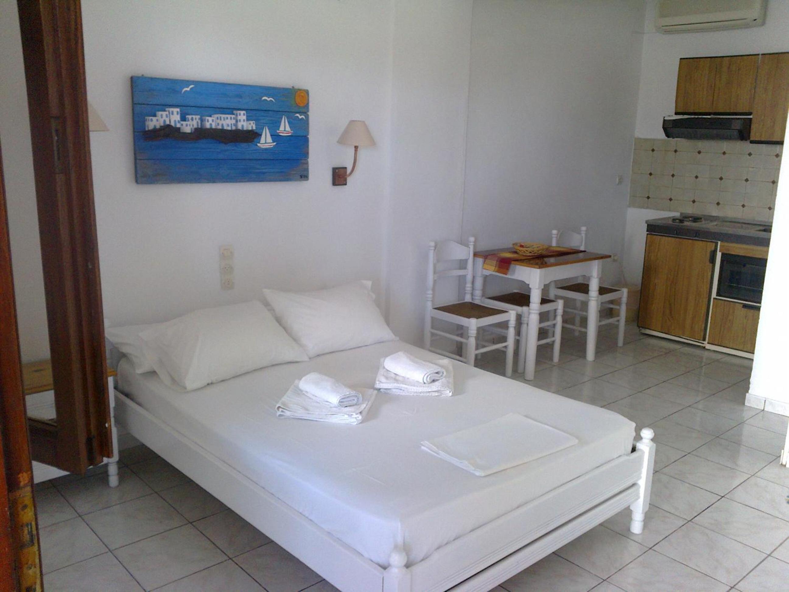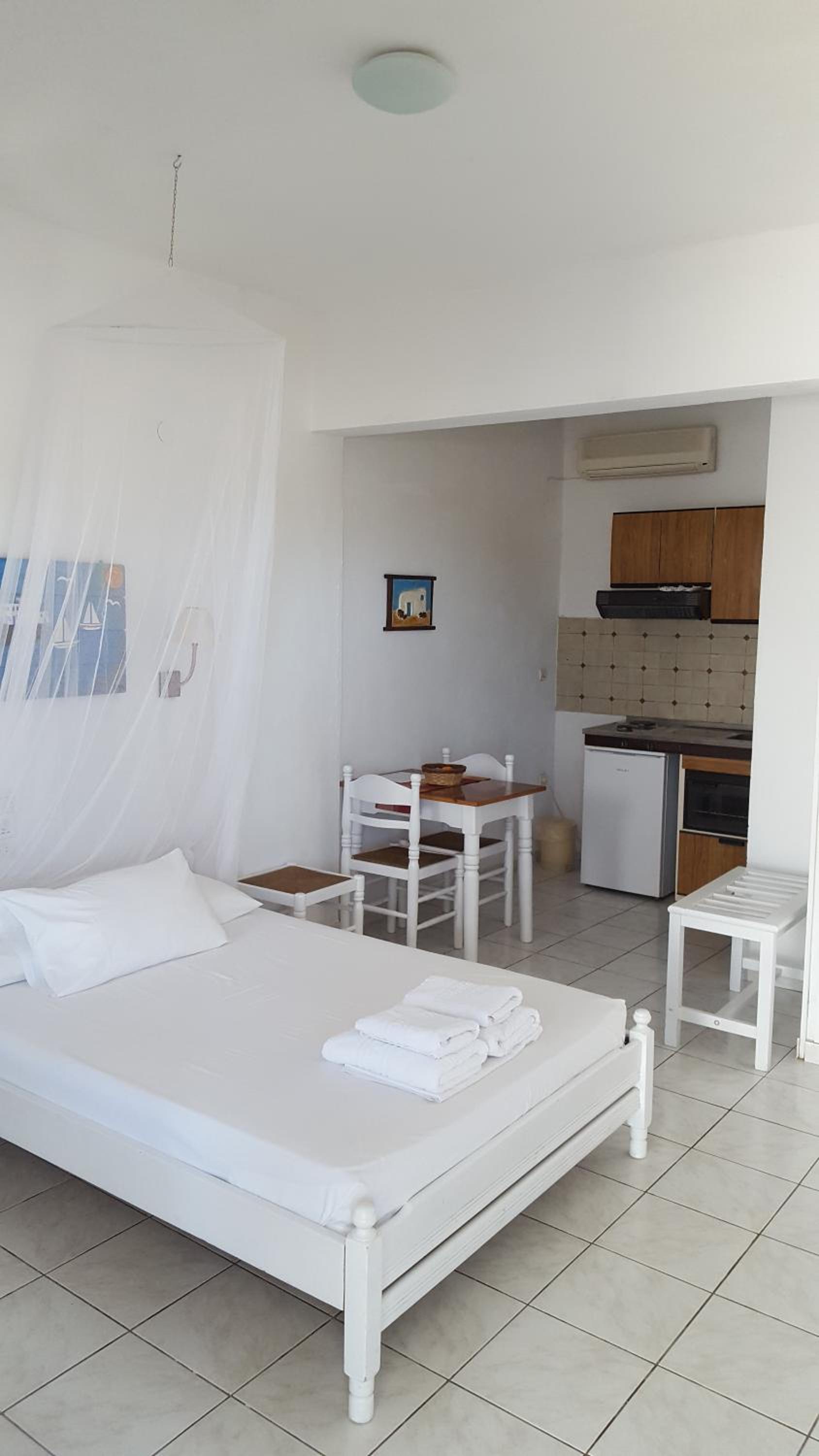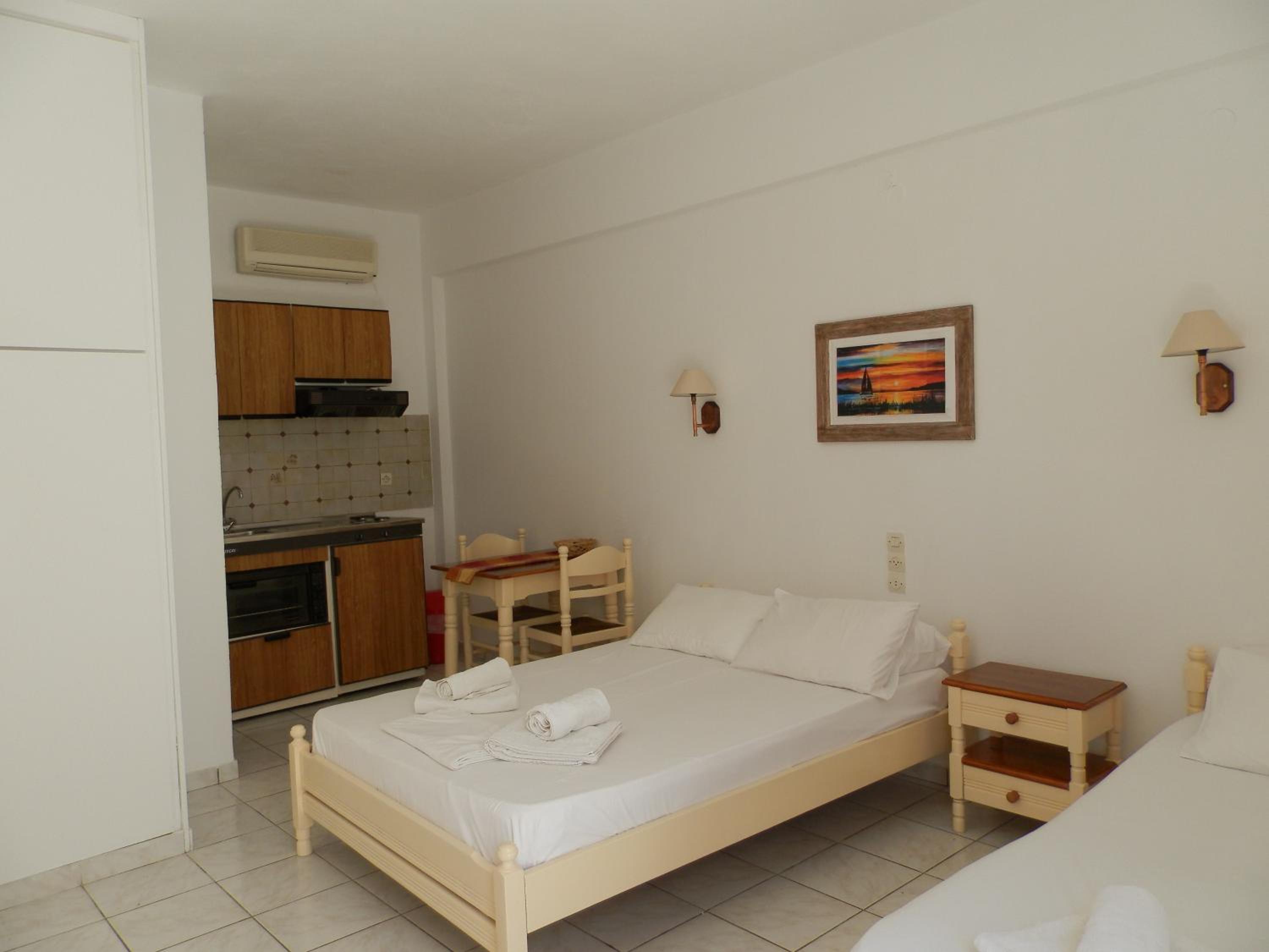 Modern Amenities: Enjoy air-conditioned studios with free Wi-Fi, kitchenette, and private balcony/patio at Aeolos Hotel Apartments.