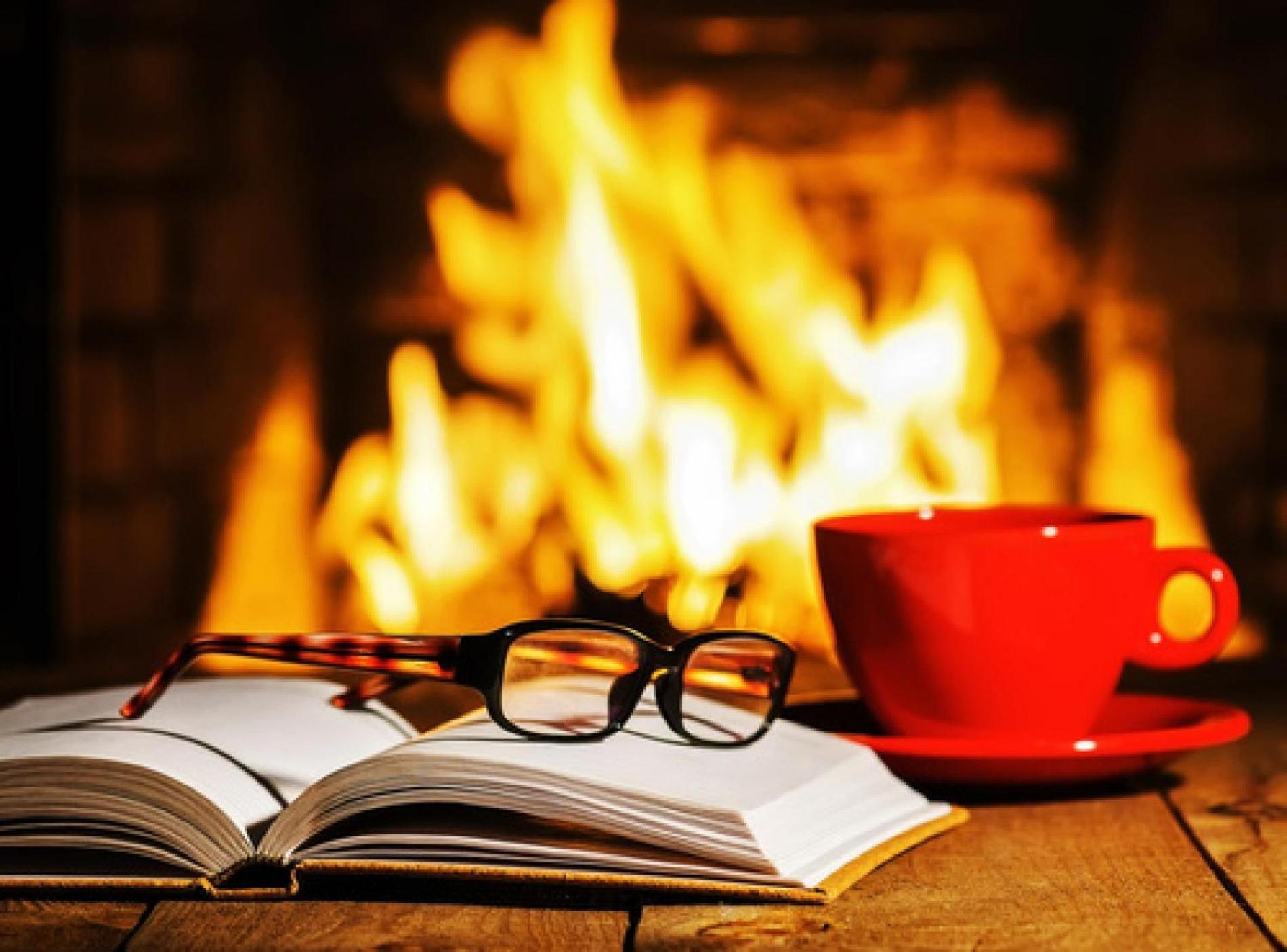 Стол у камина с потрескивающими поленьями, теплым огнем и запахом дерева у костра.