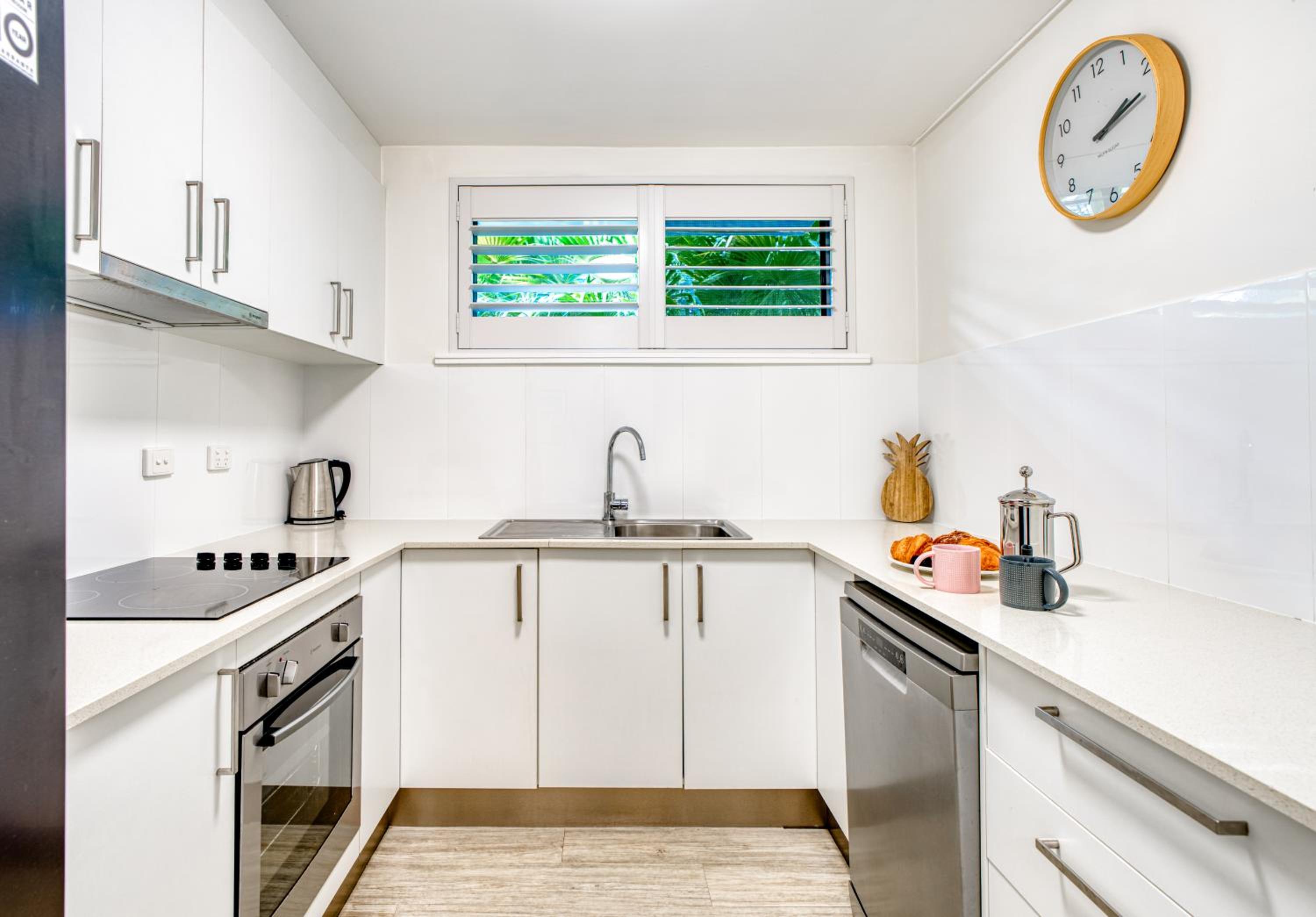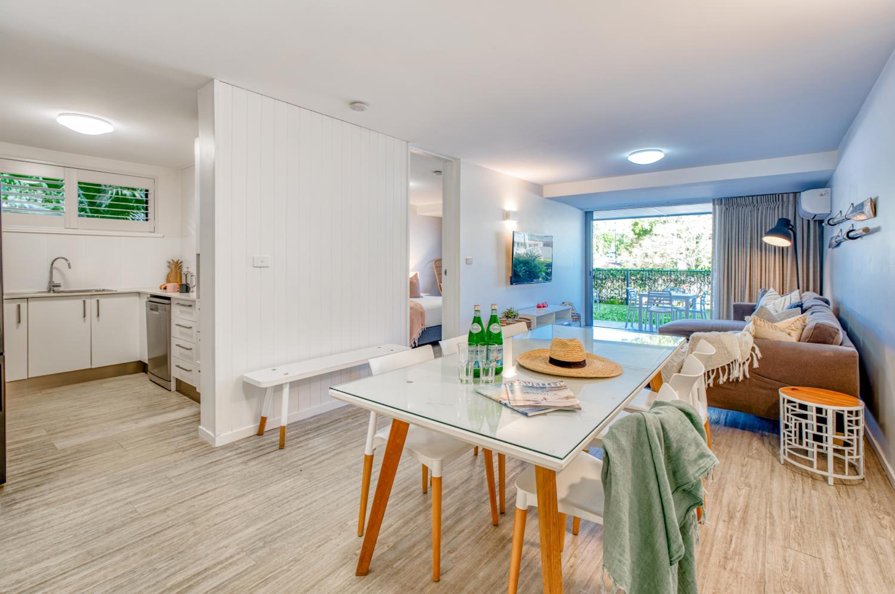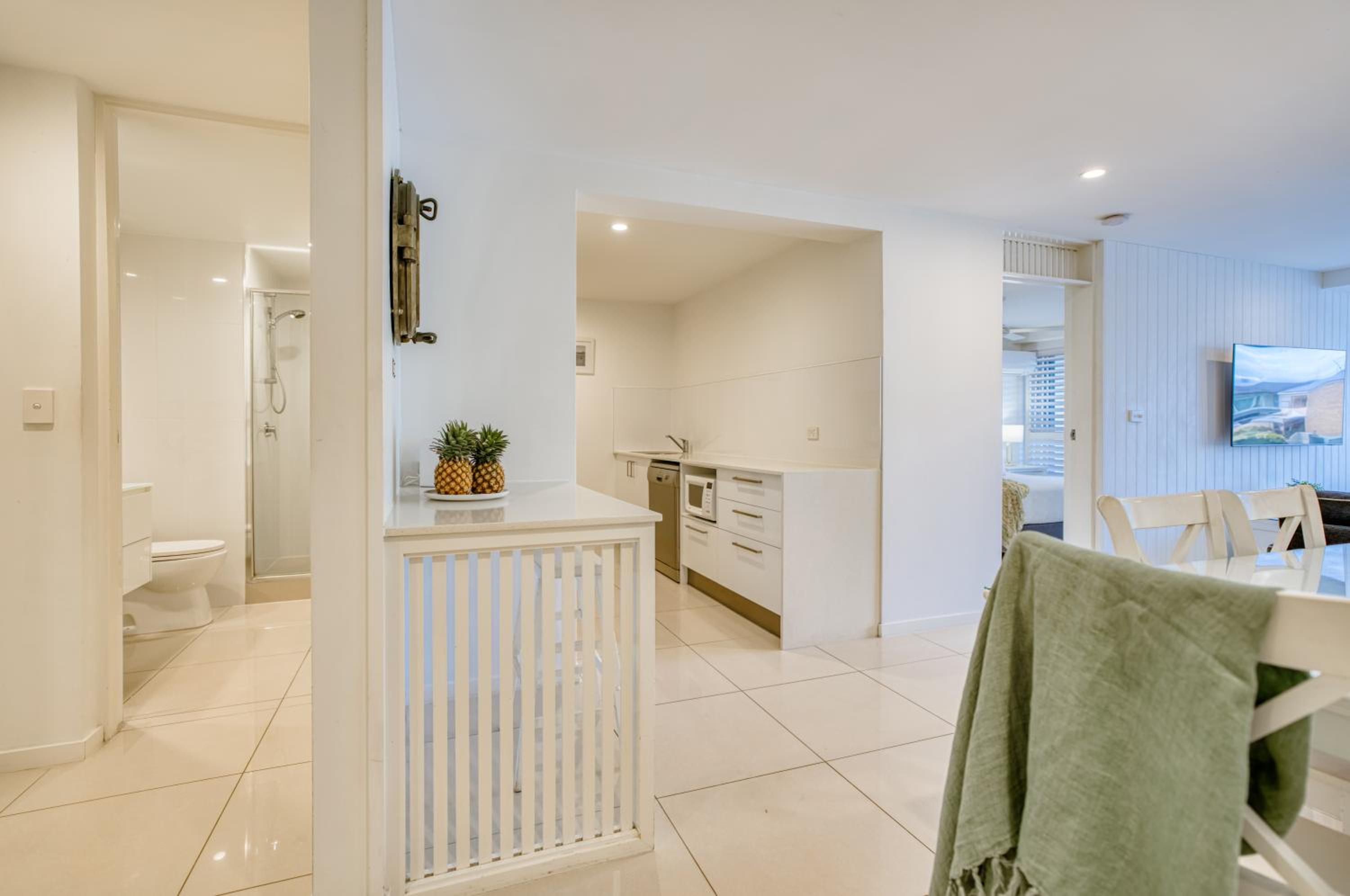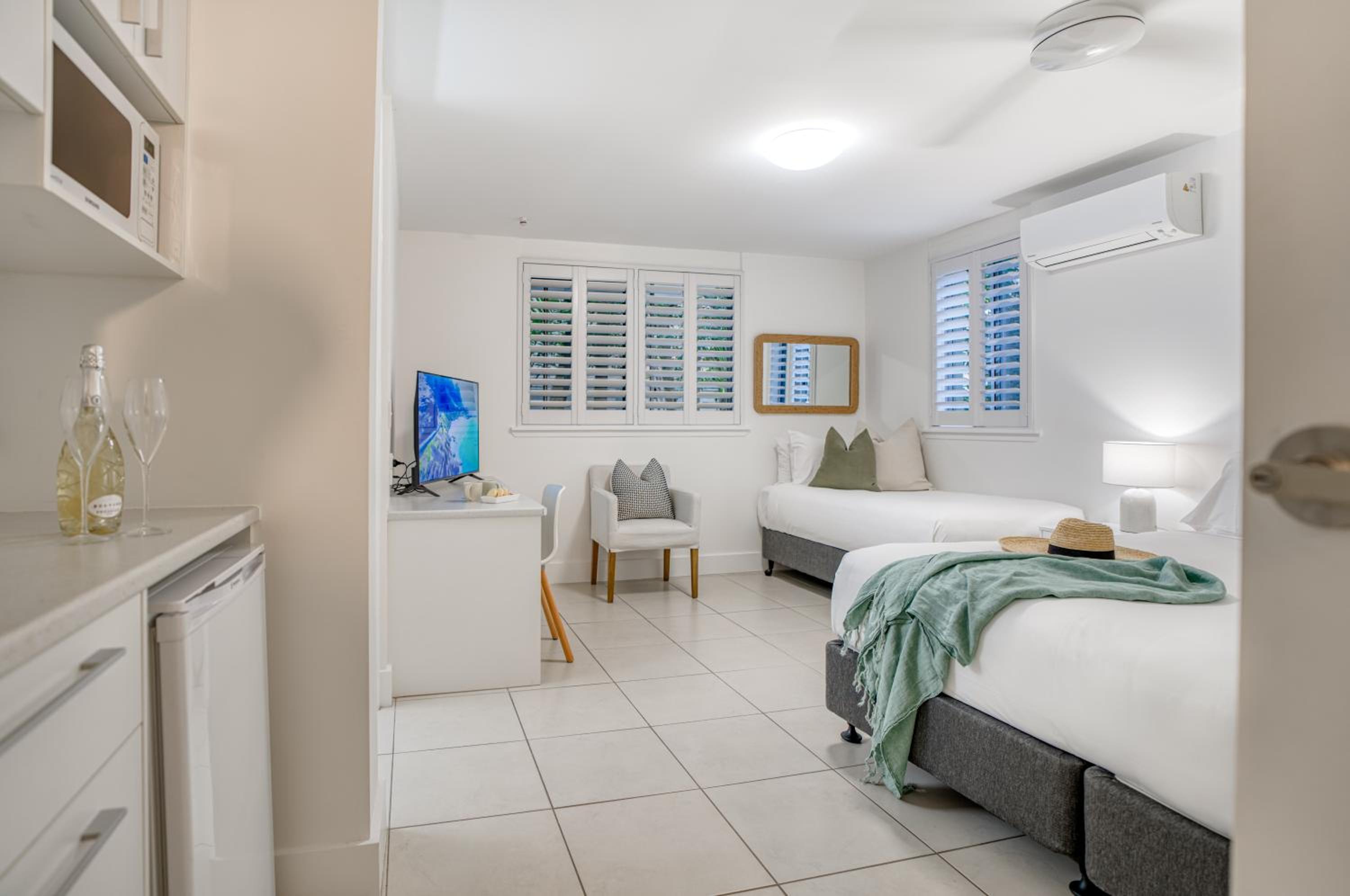 I booked a studio apartment on the ground floor. The room was very clean which was a relief (I've had others in different towns that were not clean) It was also a good sized room with a King bed and a single bed, TV with Netflix, ceiling fan and air conditioner, basic kitchenette, ironing facilities, small table and chairs. The apartments are on Hastings St but set well back from the busy street front which helped with being a bit quieter and very private. The outside areas are well attended and tidy. I was late arriving and was left my room key in a lock code box with the code for the pedestrian gate to get inside. It's secure from Hastings St and there is another coded pedestrian gate that goes out the back onto the boardwalk to the river and ferry. Car parking through a coded gate at entrance. The location was terrific. It's on Hastings St so has easy access to good cafes, restaurants, shops and the main beach. Great if on foot.