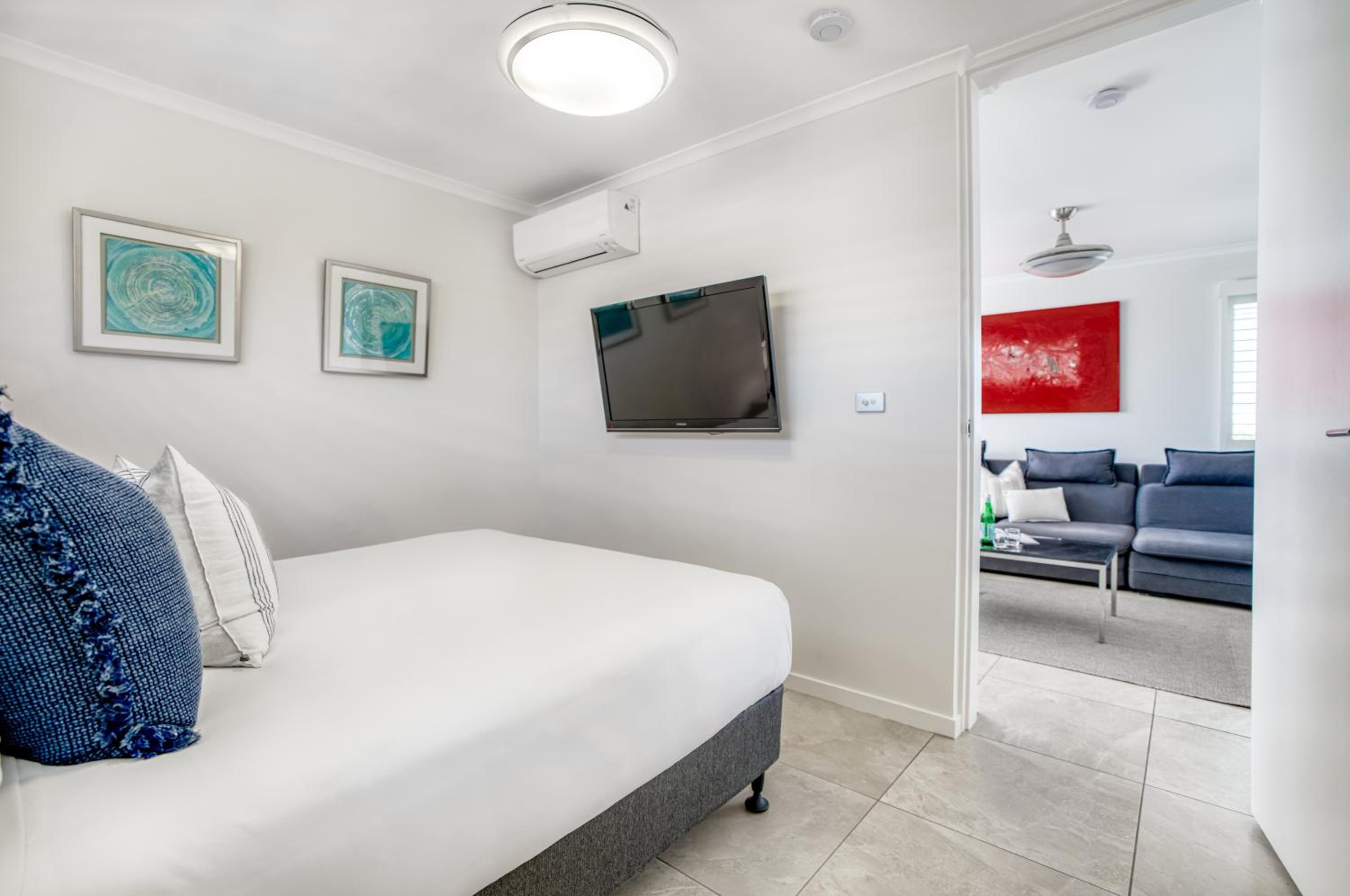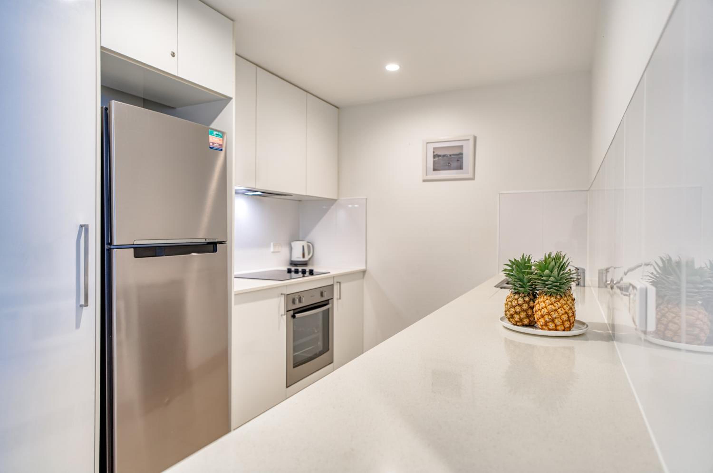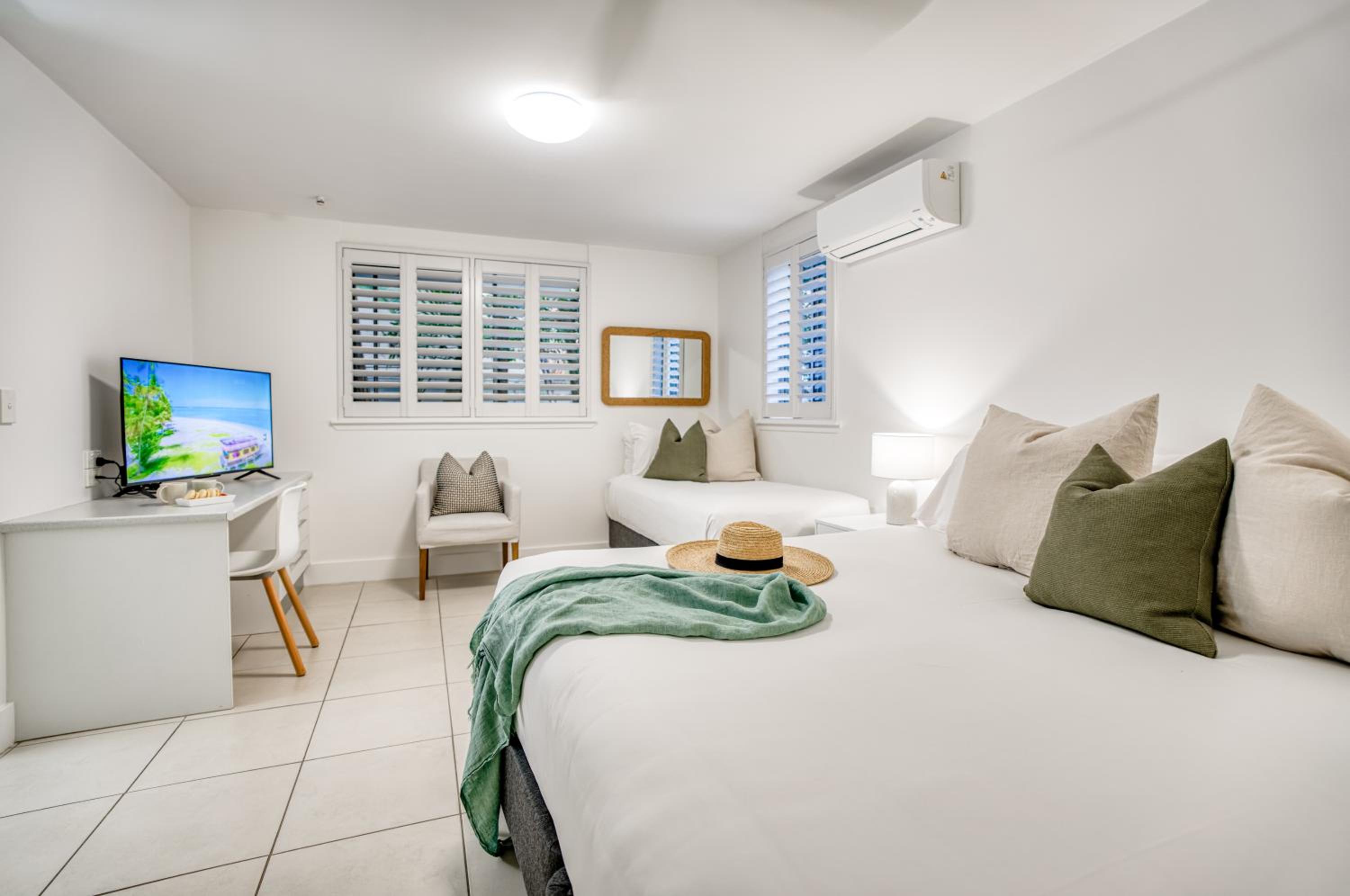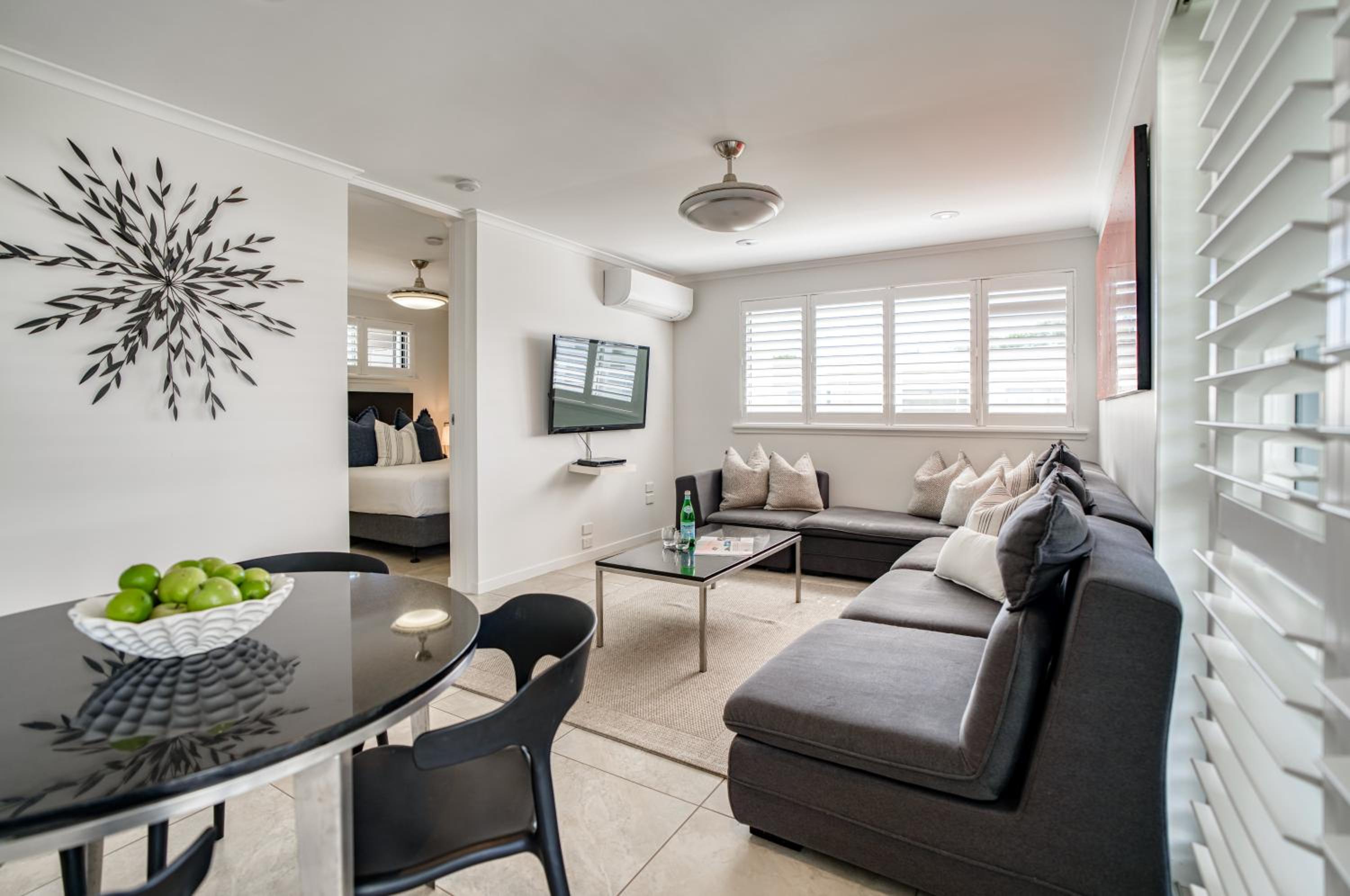 I booked a studio apartment on the ground floor. The room was very clean which was a relief (I've had others in different towns that were not clean) It was also a good sized room with a King bed and a single bed, TV with Netflix, ceiling fan and air conditioner, basic kitchenette, ironing facilities, small table and chairs. The apartments are on Hastings St but set well back from the busy street front which helped with being a bit quieter and very private. The outside areas are well attended and tidy. I was late arriving and was left my room key in a lock code box with the code for the pedestrian gate to get inside. It's secure from Hastings St and there is another coded pedestrian gate that goes out the back onto the boardwalk to the river and ferry. Car parking through a coded gate at entrance. The location was terrific. It's on Hastings St so has easy access to good cafes, restaurants, shops and the main beach. Great if on foot.