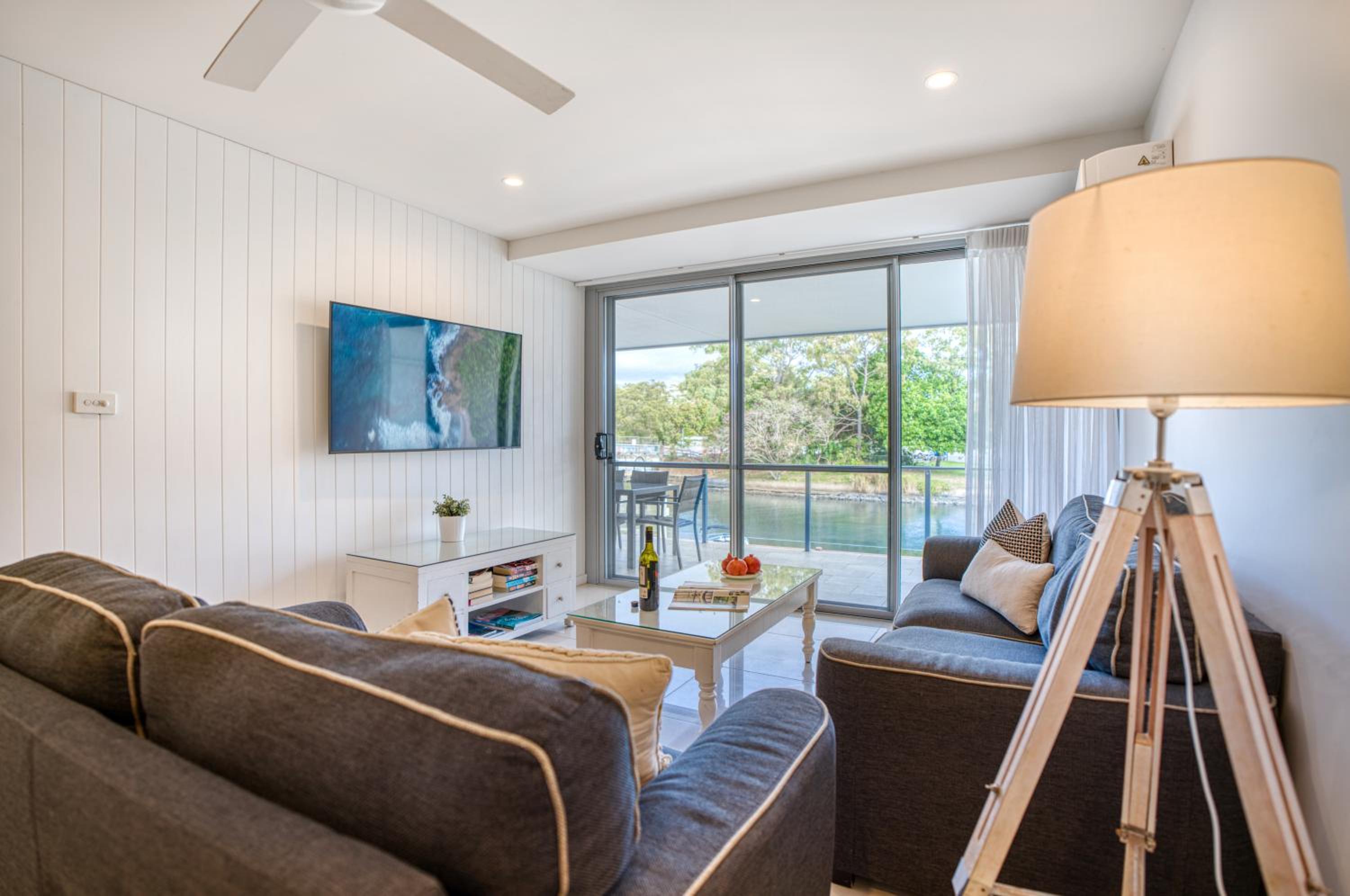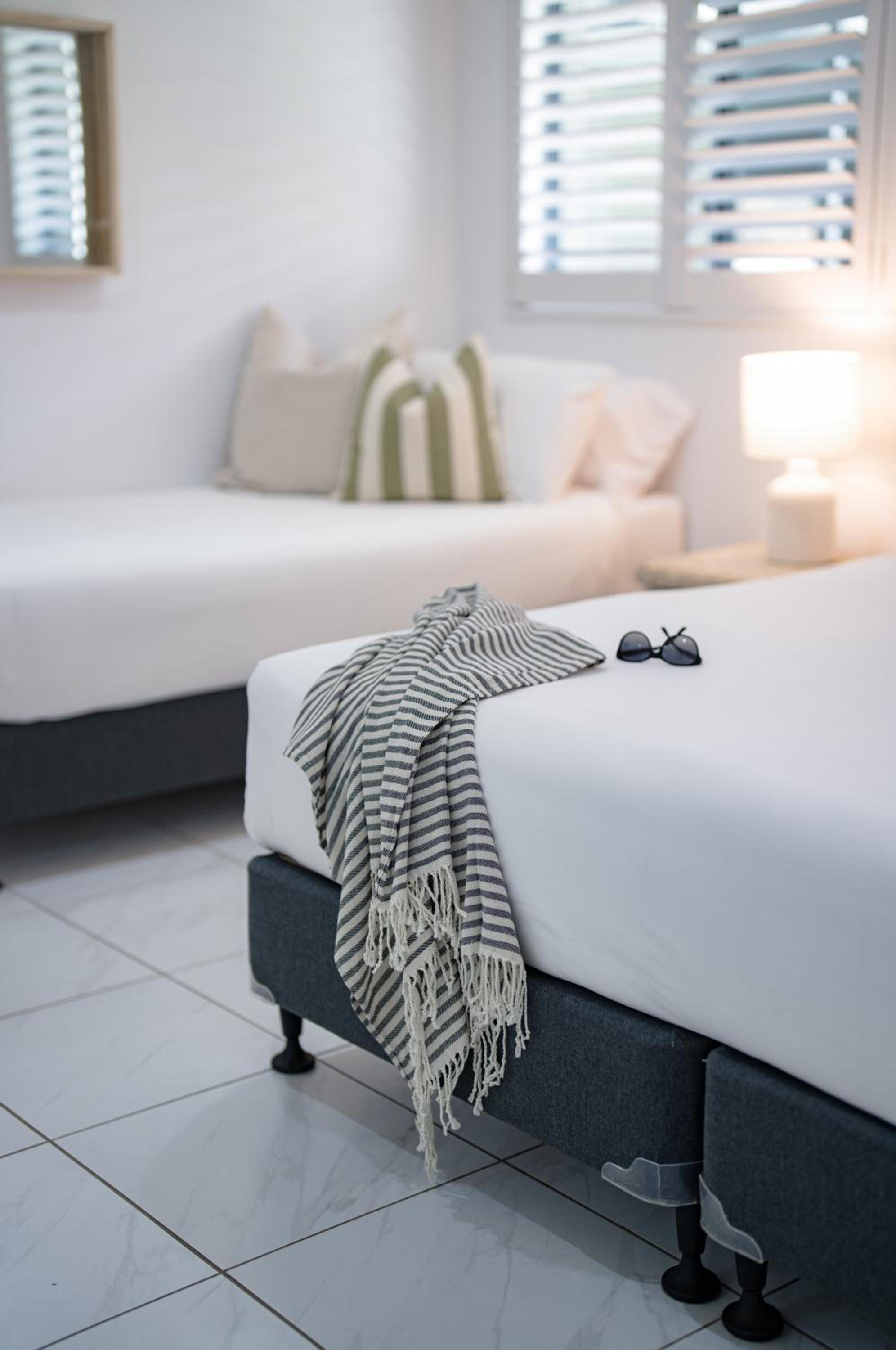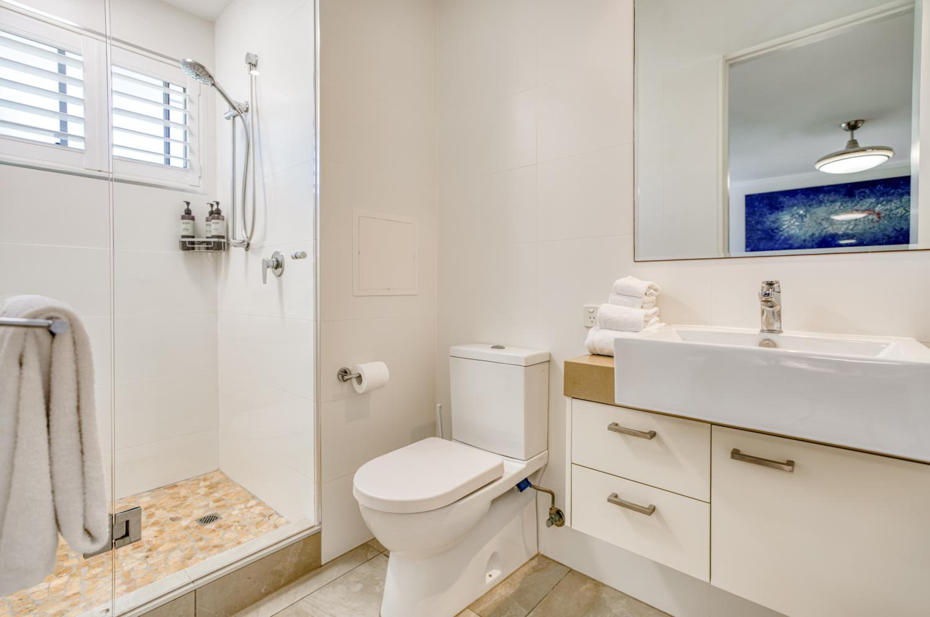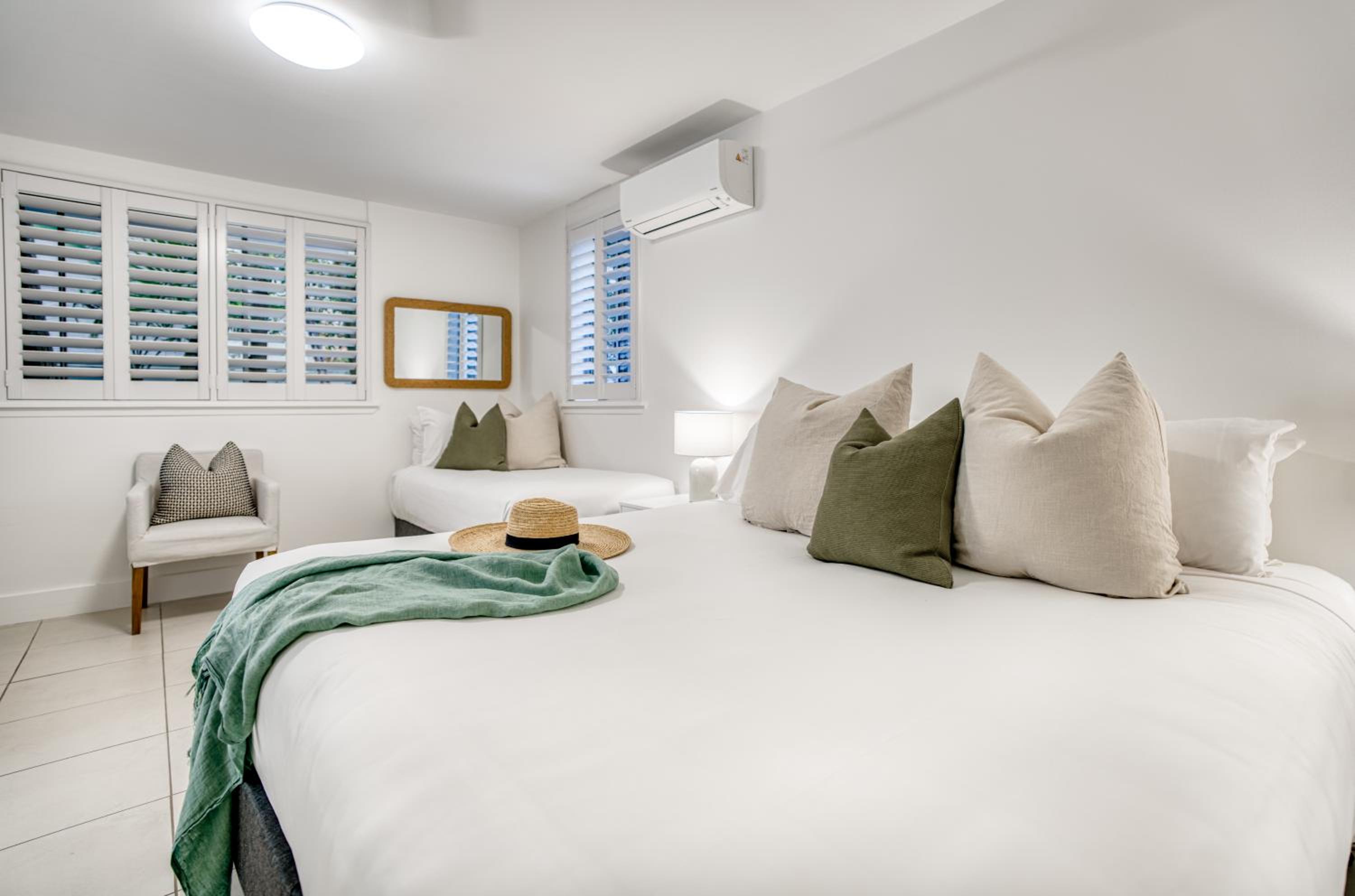 I booked a studio apartment on the ground floor. The room was very clean which was a relief (I've had others in different towns that were not clean) It was also a good sized room with a King bed and a single bed, TV with Netflix, ceiling fan and air conditioner, basic kitchenette, ironing facilities, small table and chairs. The apartments are on Hastings St but set well back from the busy street front which helped with being a bit quieter and very private. The outside areas are well attended and tidy. I was late arriving and was left my room key in a lock code box with the code for the pedestrian gate to get inside. It's secure from Hastings St and there is another coded pedestrian gate that goes out the back onto the boardwalk to the river and ferry. Car parking through a coded gate at entrance. The location was terrific. It's on Hastings St so has easy access to good cafes, restaurants, shops and the main beach. Great if on foot.
