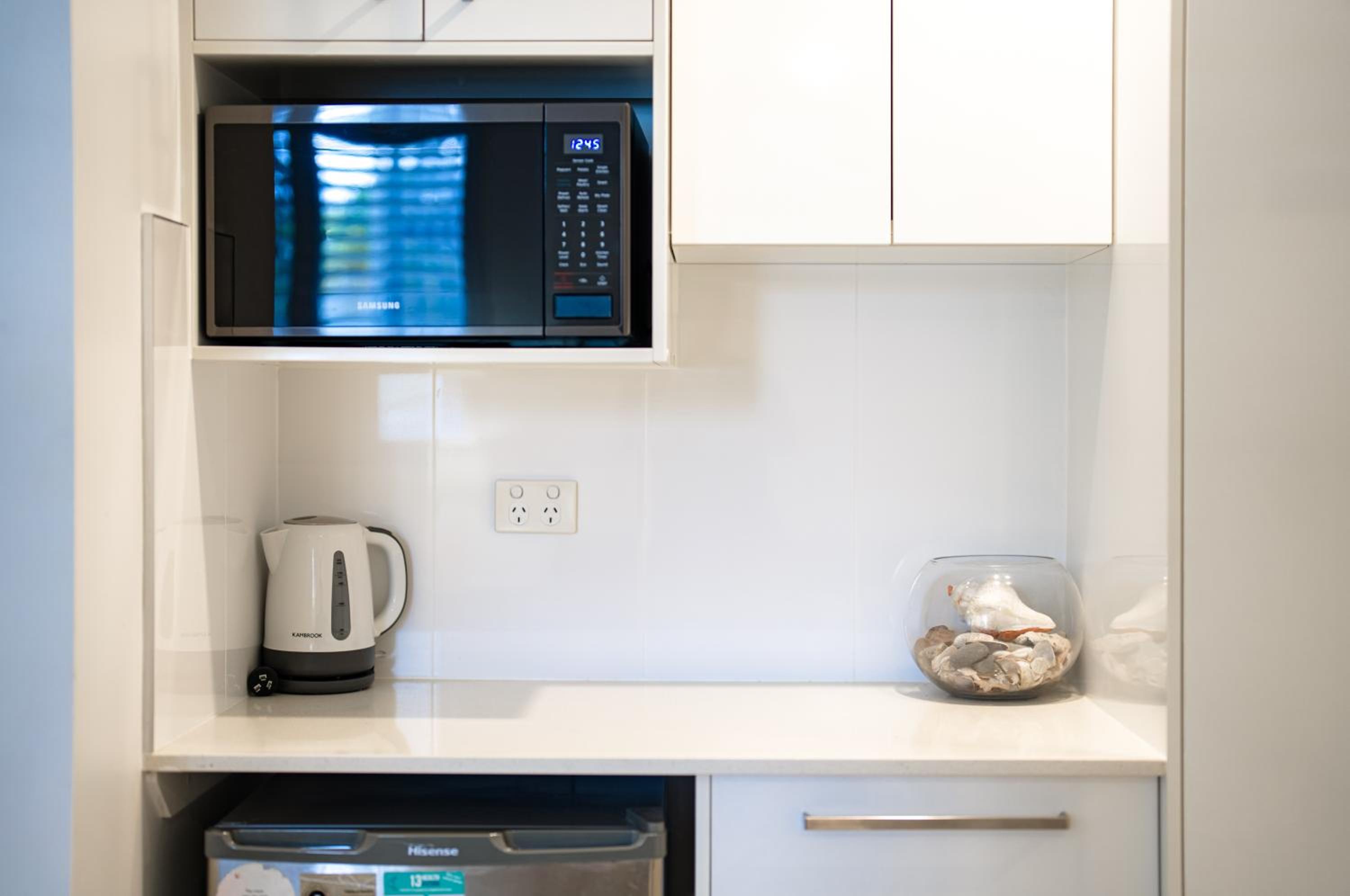 Being a studio apartment the room did not have a washing machine and there isn't one for use except if you ask reception and then they may put a load on for you if you need it. There is a front loader at the back of reception which I found a bit odd and I was reluctant to ask someone I didn't know to wash my clothes. There is a launderette in Noosaville which is not a convenient option especially if you don't have a car. A single machine in a small corner of the facility block looked easily achievable to me. The shower in my room was a bit smallish but okay, the problem is that you have to step up quite high to get into it and then down again onto the floor to get out. I found it a bit precarious and it may not be suitable for someone with balance issues. The hot water filling up after you turn a tap on makes a bit of noise but it's not for long. It could be a minor disturbance if a person in the next apartment is having a midnight shower or flushes the loo. There was nowhere to sit comfortably in the apartment, no couch or easy chair. Only a small table with 2 plastic chairs and while not uncomfortable for a short time if you want to watch TV you have to prop yourself on the bed. A couch would fit nicely if they removed the single bed that's against the wall. The kitchenette is basic with just a kettle, tea caddy, coffee maker, toaster, microwave and some crockery and cutlery which is fine but if you wanted to cook for yourself maybe there are better facilities in one of the larger apartments. My room was on the ground floor behind the pool. It was very noisy when people were playing in the water, especially kids screaming and splashing. The pool is supposed to close at 9pm so shouldn't be a problem for sleeping but be aware that if you don't want to be near the pool don't get a ground floor room or one that overlooks that area.