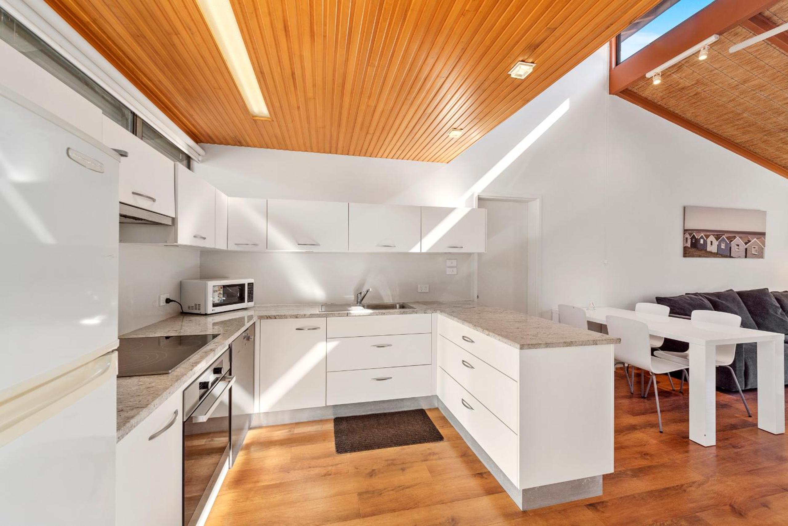 Furniture had stains, all bamboo ceilings had dust hanging from them, all ceiling fans were covered in thick grimy dust, carpet in between main bedroom and ensuite was frayed and and a severe trip hazard, water did not empty properly from bathroom sinks - clogged with hair, frying pans still had egg and baked on food, door in second bedroom did not lock at all - making unit insecure. Voucher left for discount on next visit, threw in the bin, will not be staying here again.